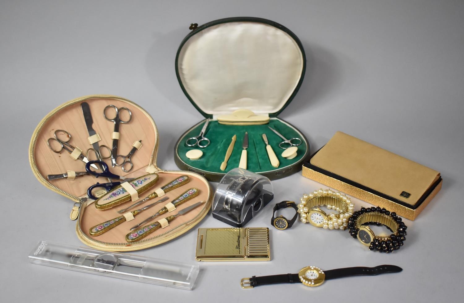 A Collection of Vintage Sundries to Include Vintage Cased Manicure Sets, Costume Jewellery Wrist Watches, Wallet etc