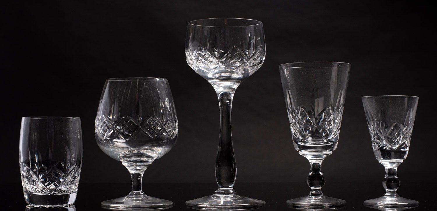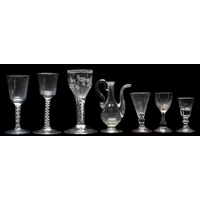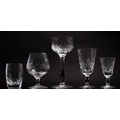 A part suite of Stuart crystal wine glasses, comprising sixteen wine glasses, twelve smaller, three balloons, thirteen sherry glasses and five small tumblers.