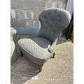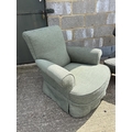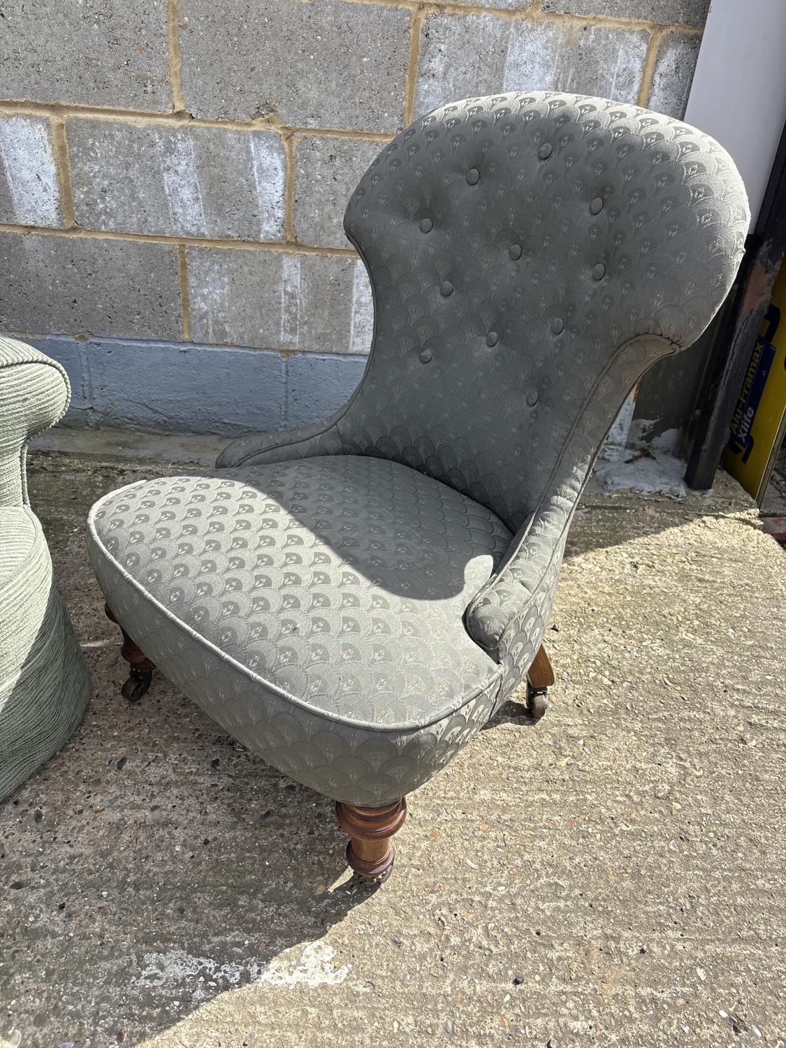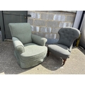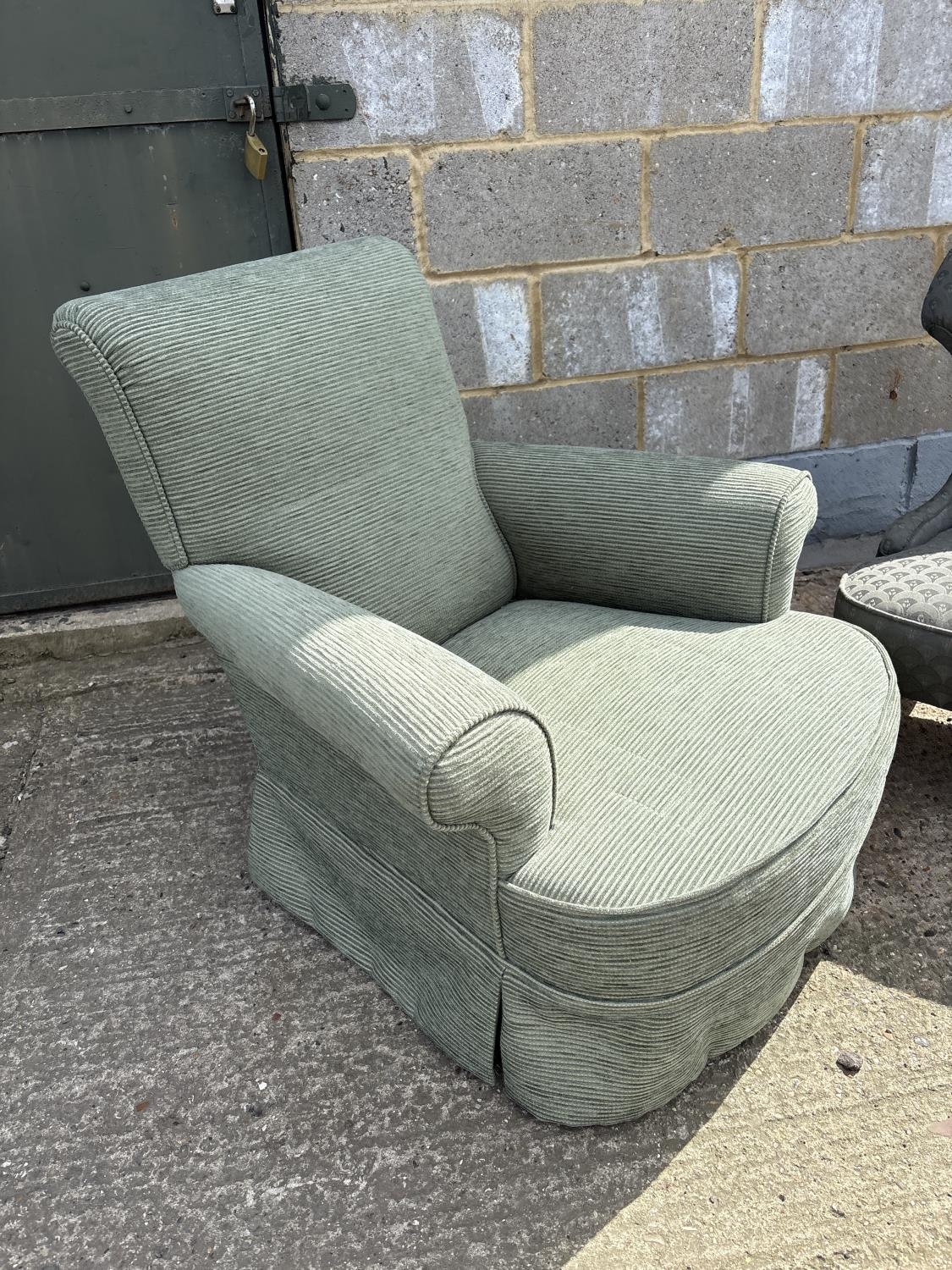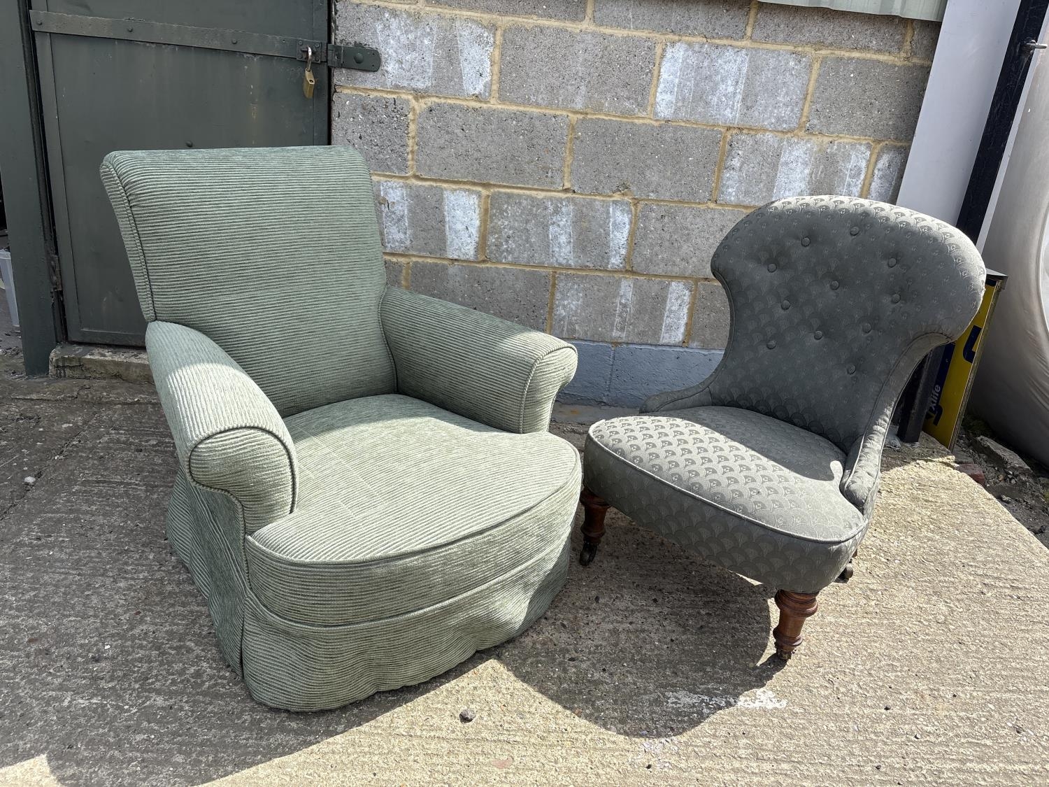 A green upholstered armchair with deep seat together with an Edwardian armchair
