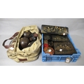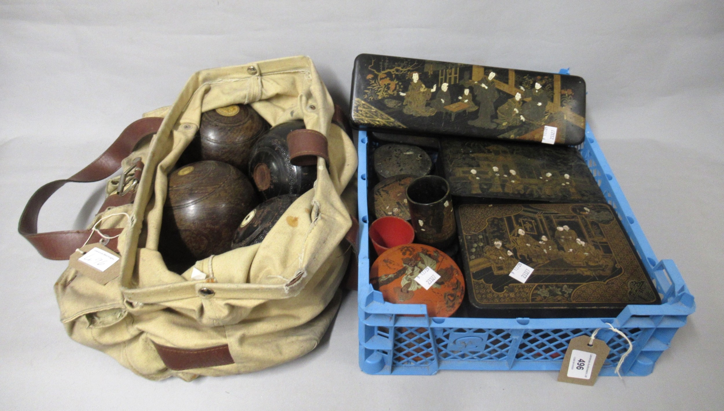 Quantity of various Japanese lacquer boxes, together with four wooden lawn bowls