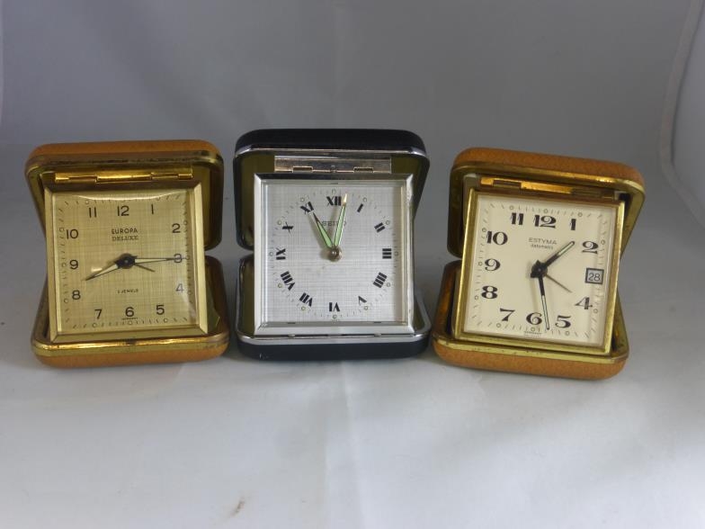 Vintage cased travel alarm clocks in very good condition, "Seiko" "Europa" and "Estyma"