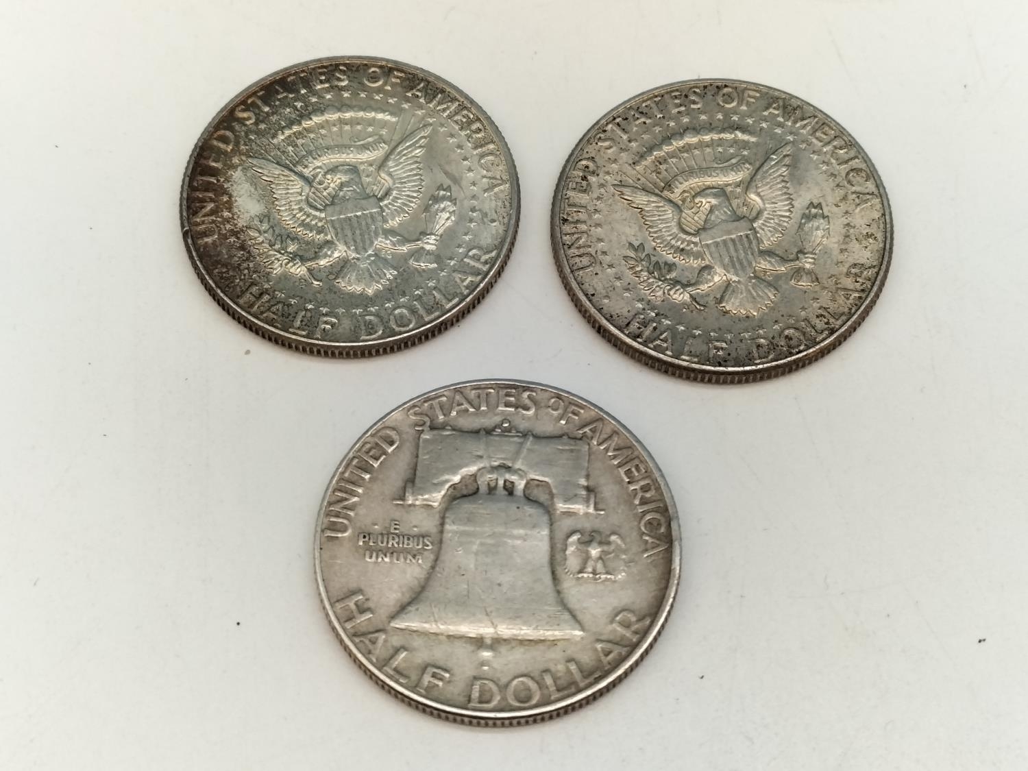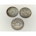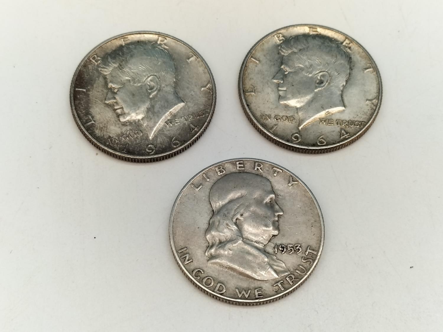 3 x Silver American Half Dollars - 2 x Denver Mint Kennedy 90% Silver 1964 plus 1 x Denver Mint Franklin 90% Silver Liberty Bell 1953.