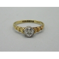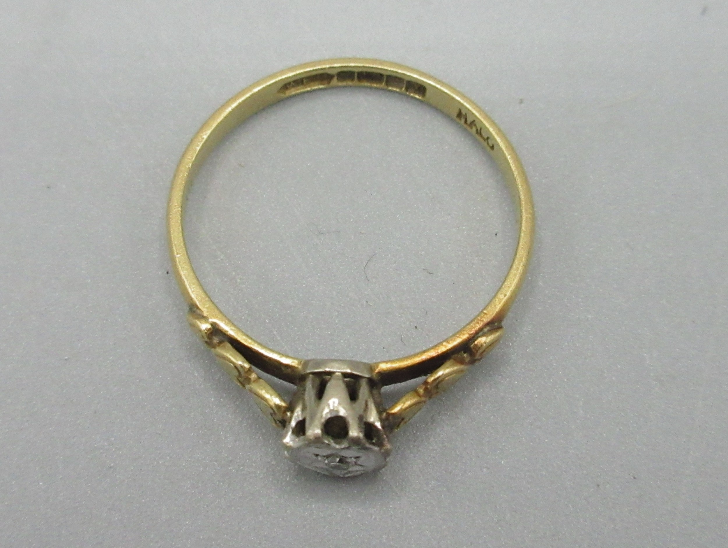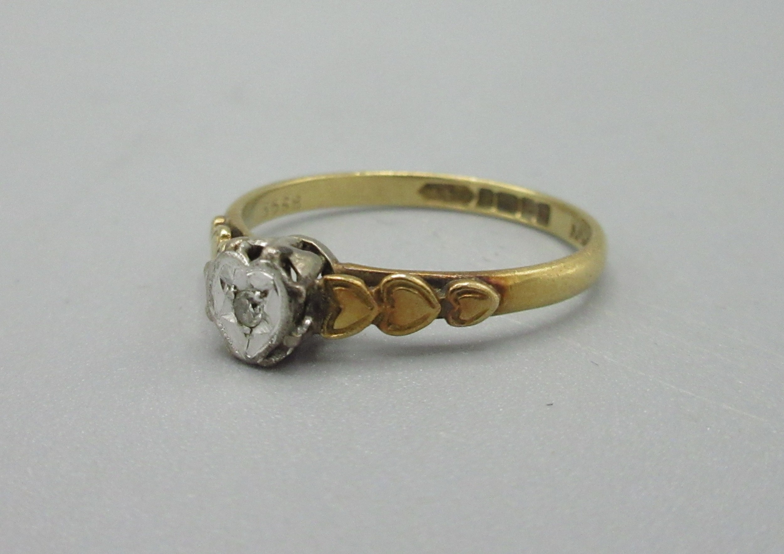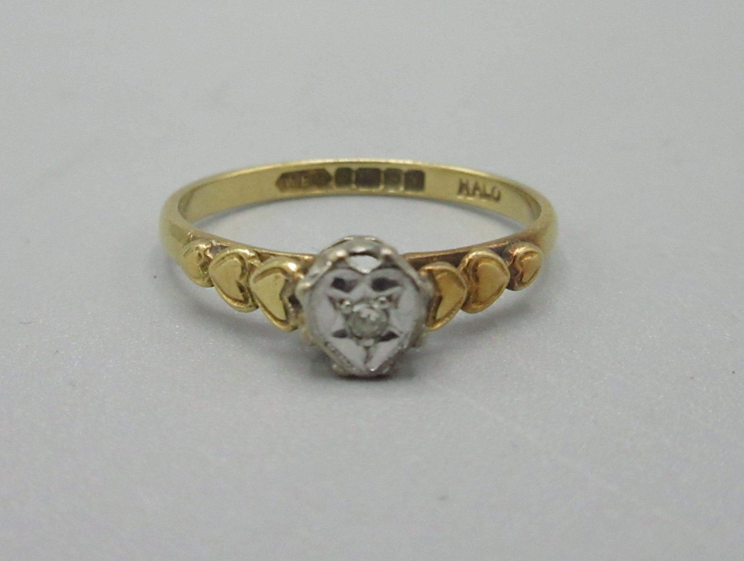 18ct yellow gold diamond ring, heart shaped illusion setting flanked by gold hearts, stamped 18, size P, 2.38g