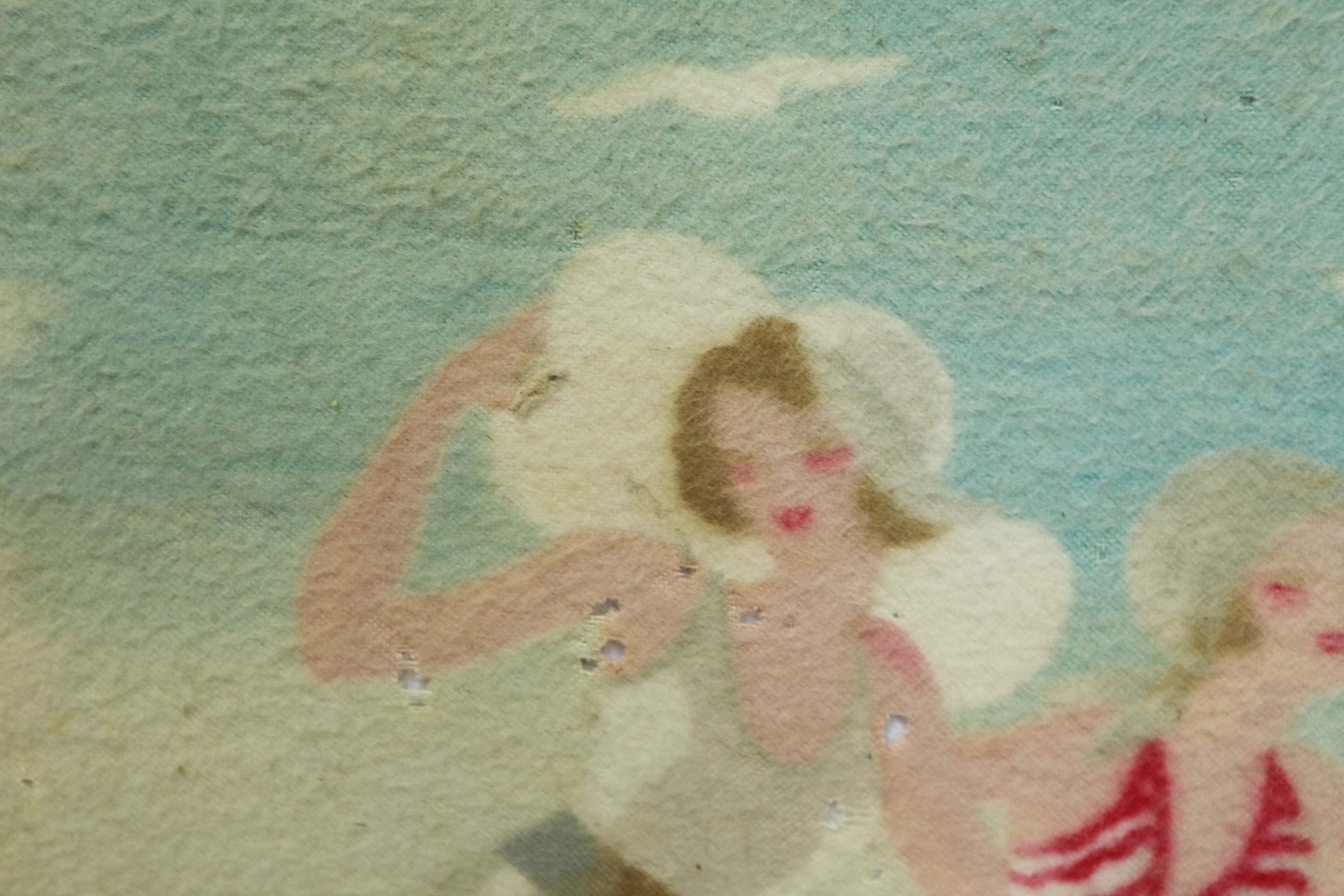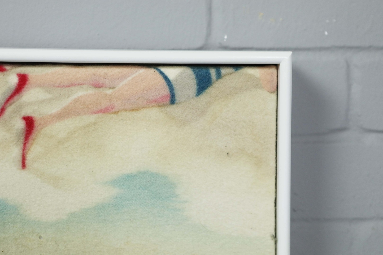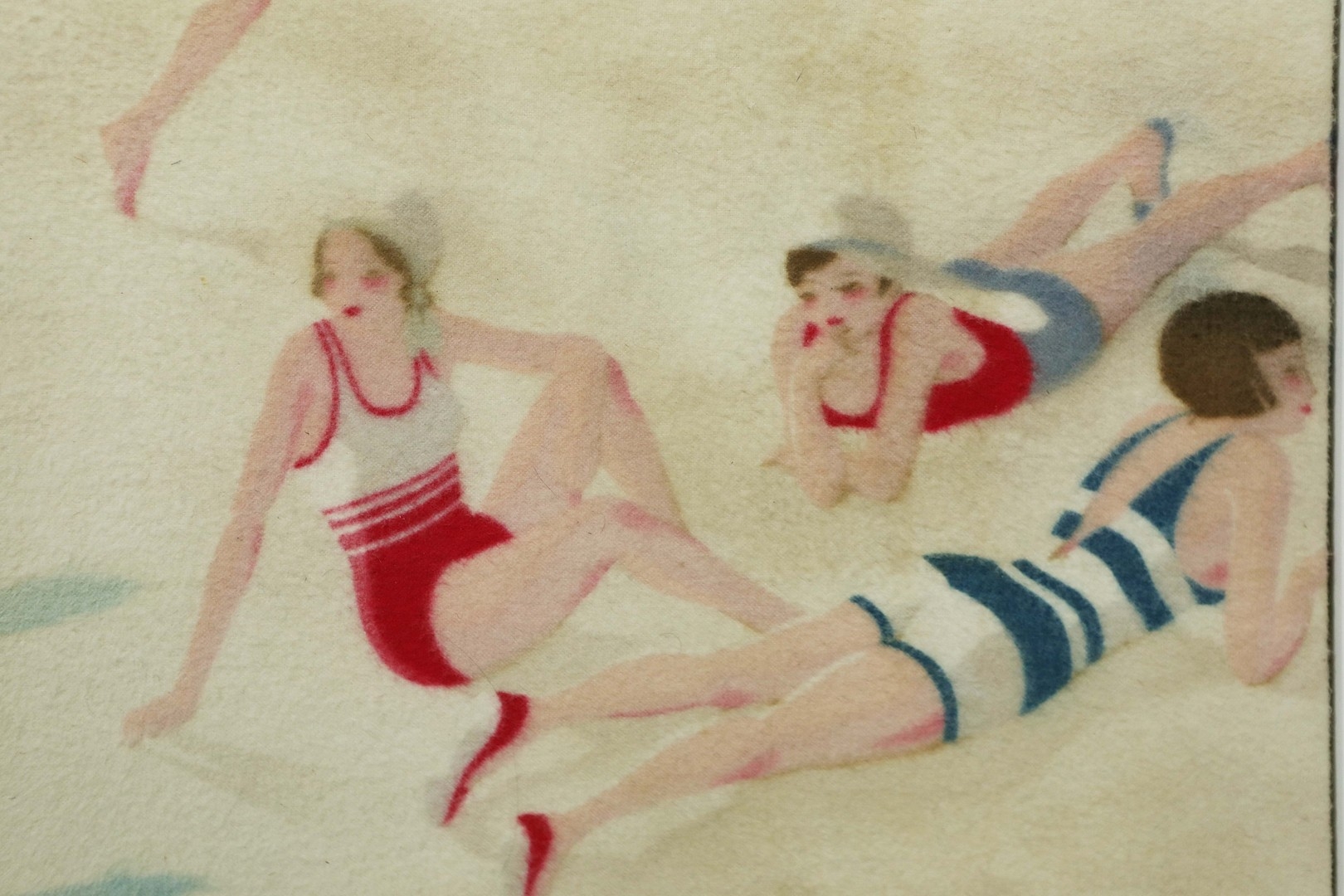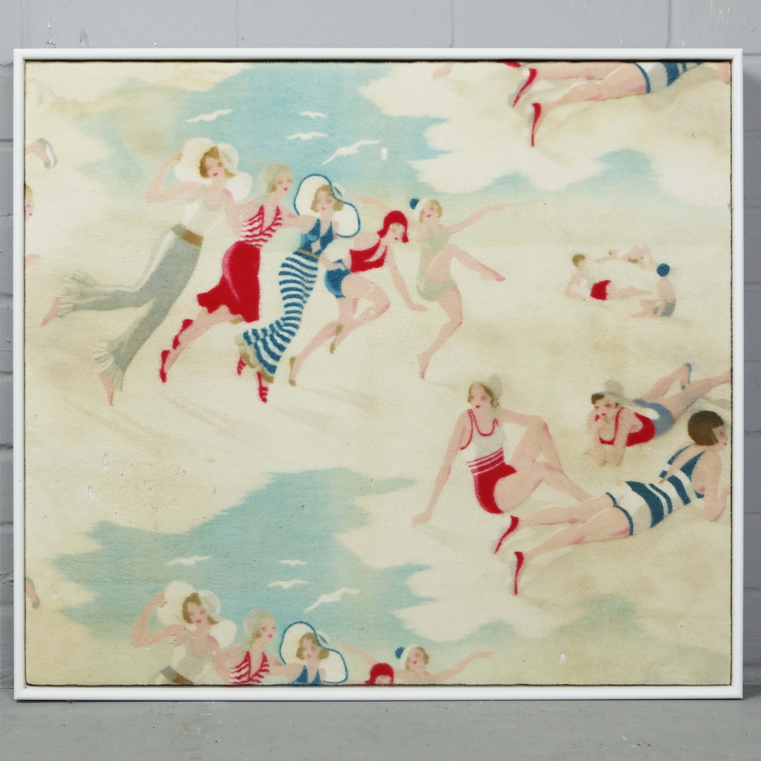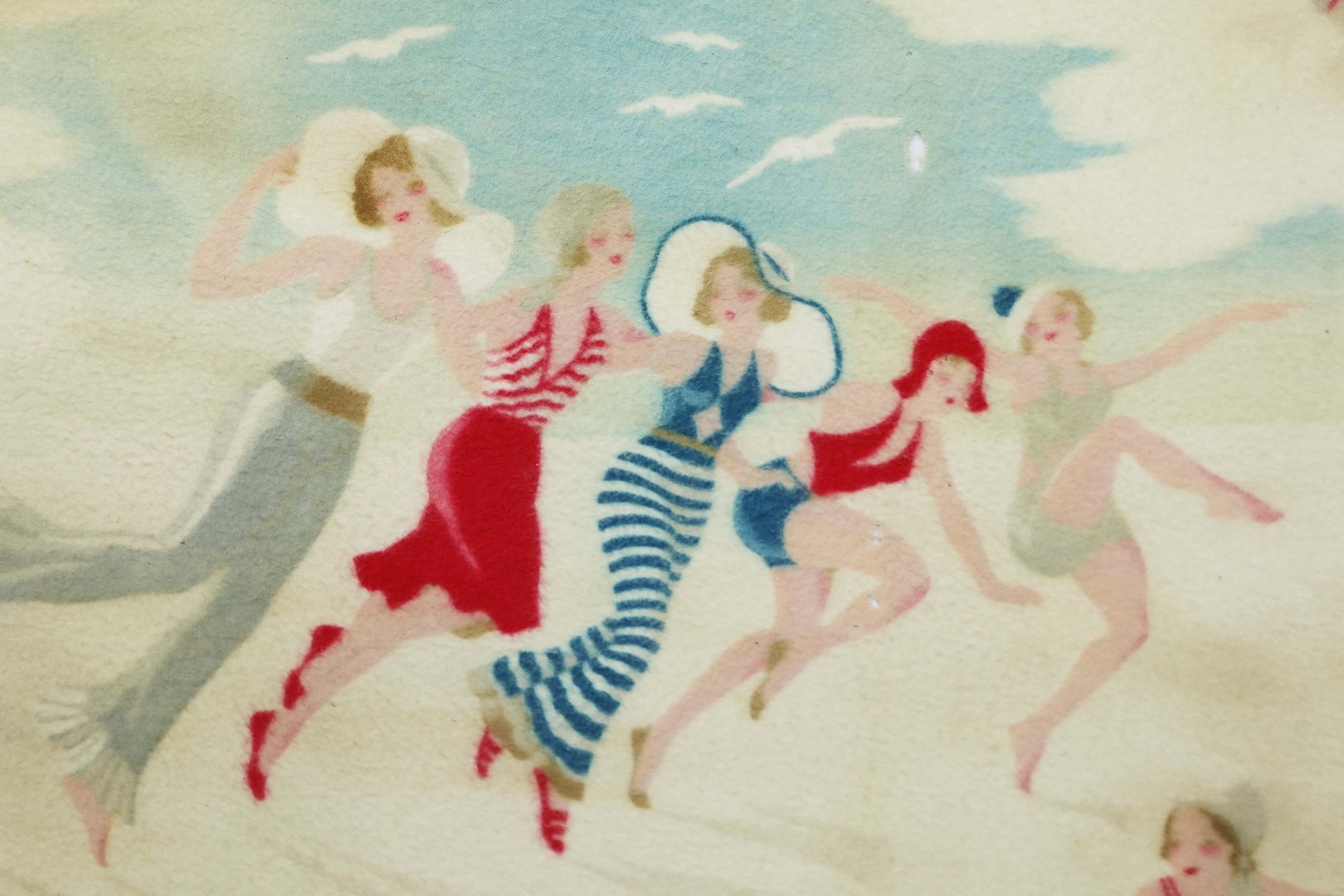 1930s ART DECO BEACH SCENE PRINT ON FELT IN WHITE PAINTED FRAME. 63.5cm H x 75cm W.