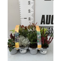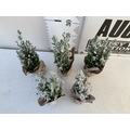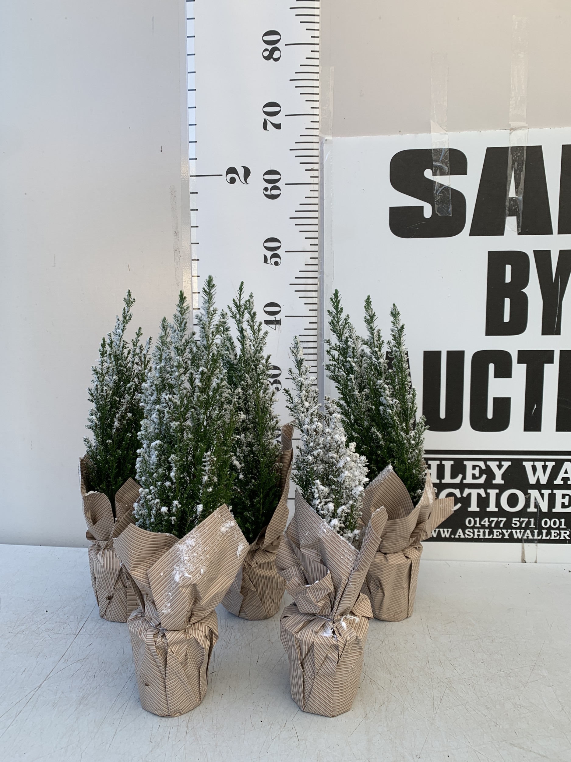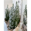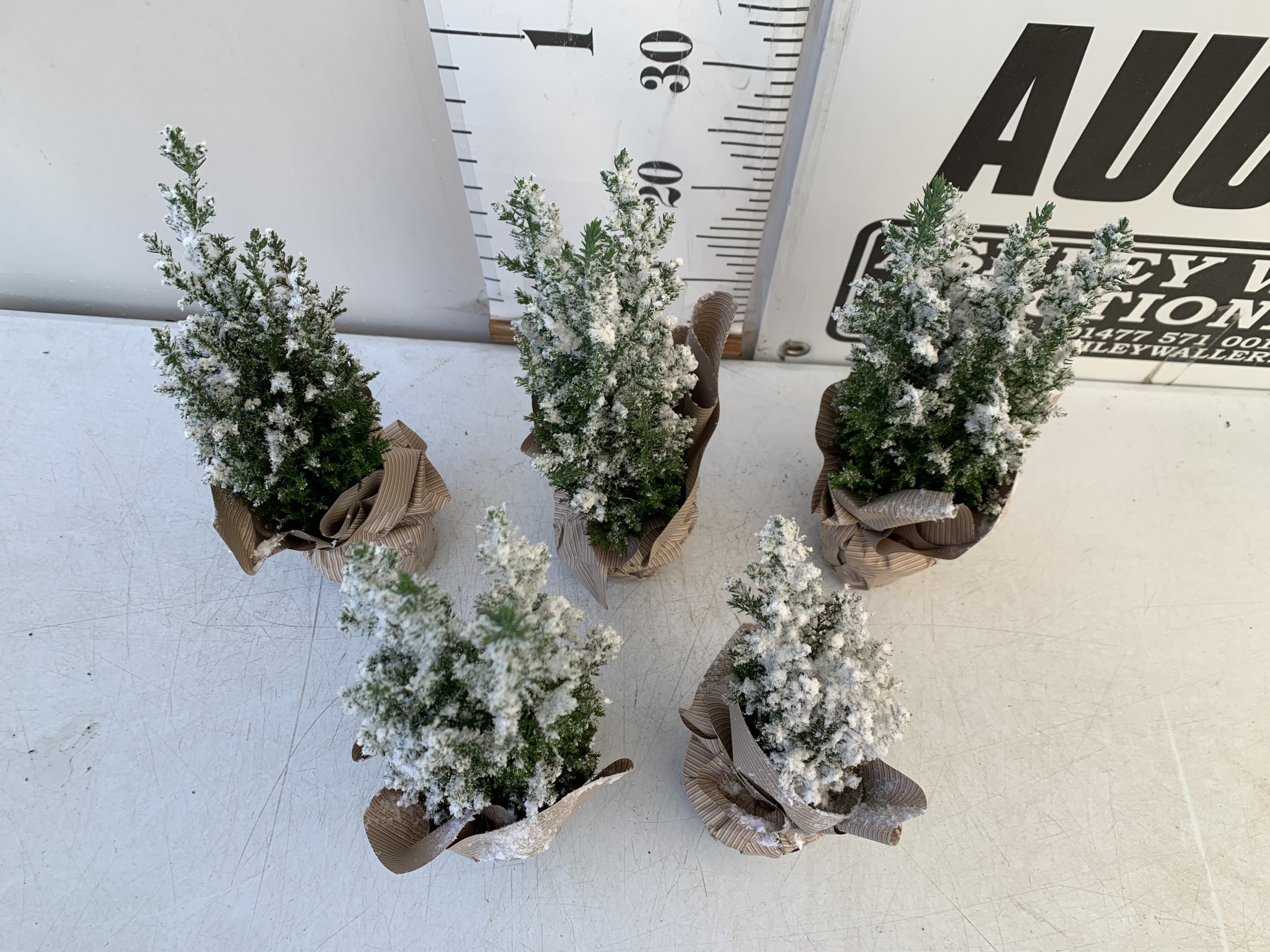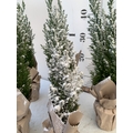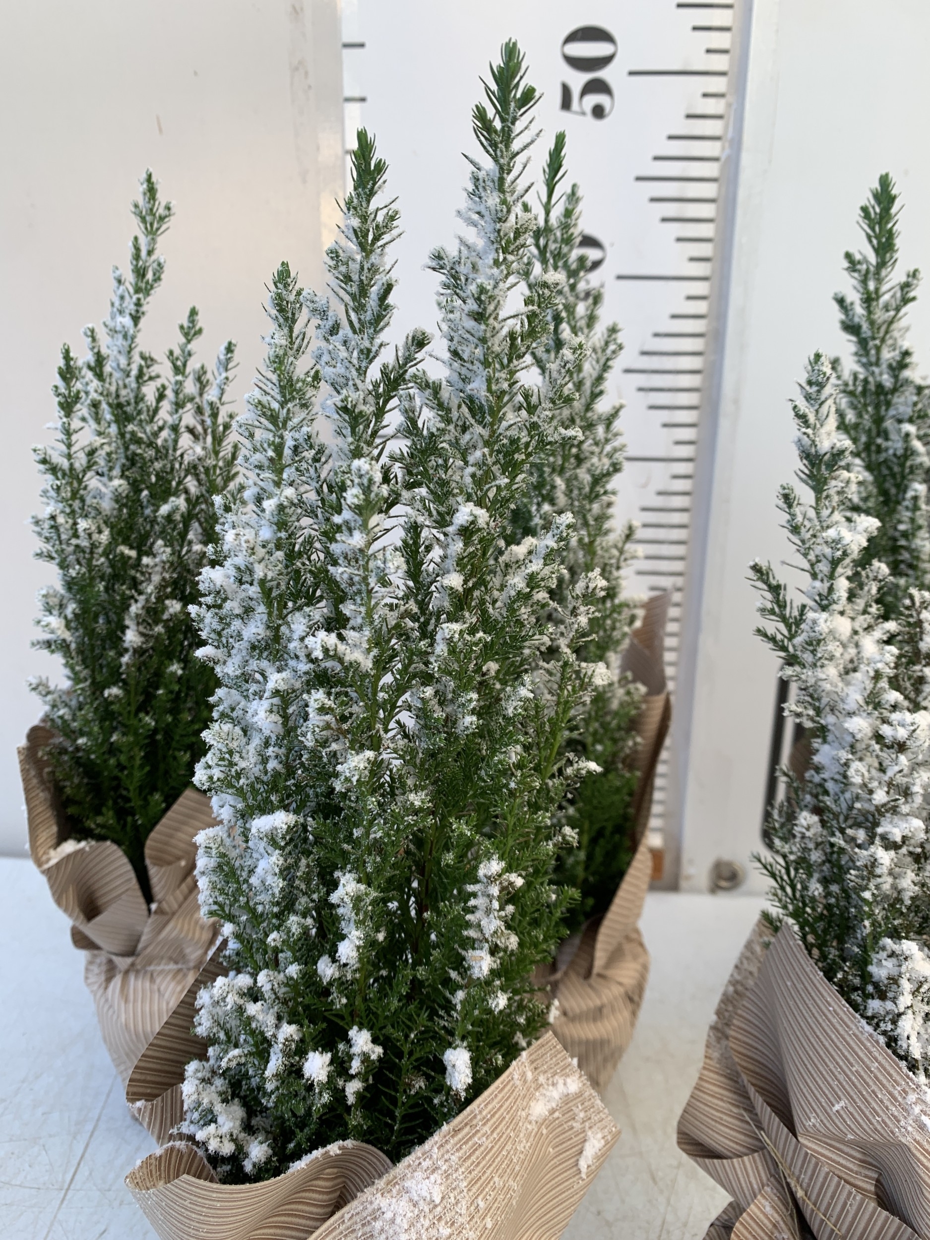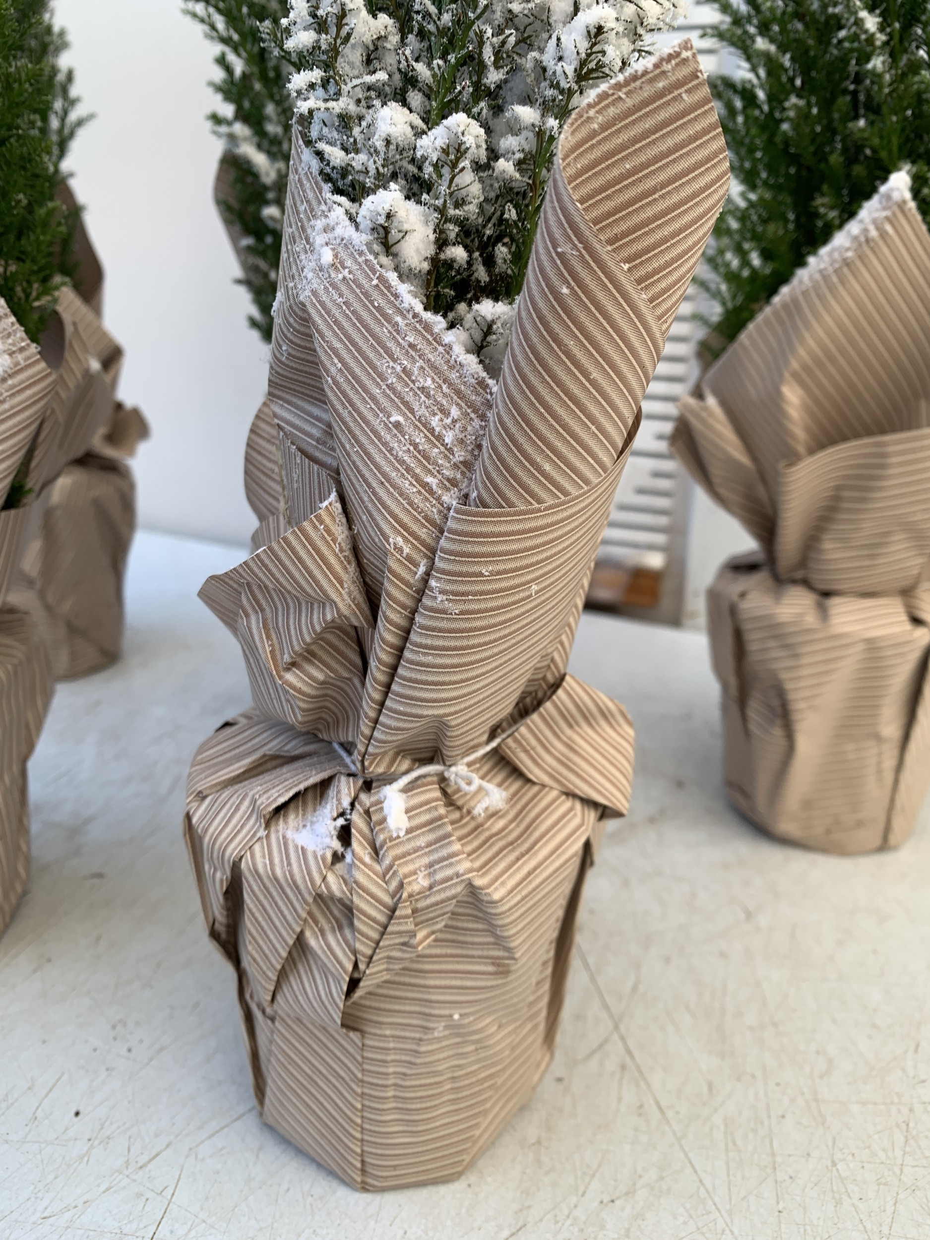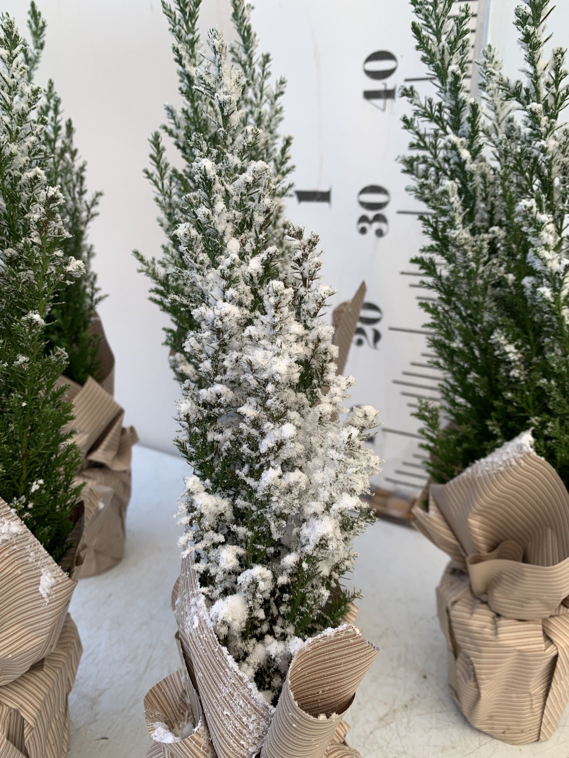 FIVE CHRISTMAS MINIATURE CONIFERS CAMAECYPARIS WITH 'SNOW' IN GIFT WRAPPED POTS. APPROX 40-50CM TALL. TO BE SOLD FOR THE FIVE