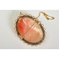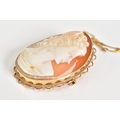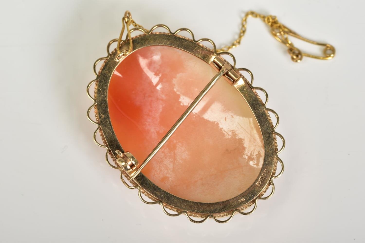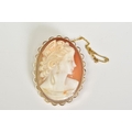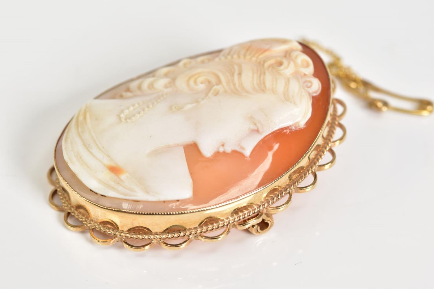 A 9CT GOLD CAMEO BROOCH, the oval cameo depicting a lady in profile, within a collet mount and scallop surround, with additional safety chain, hallmarked 9ct gold Birmingham, length 45mm, approximate gross weight 10.6 grams