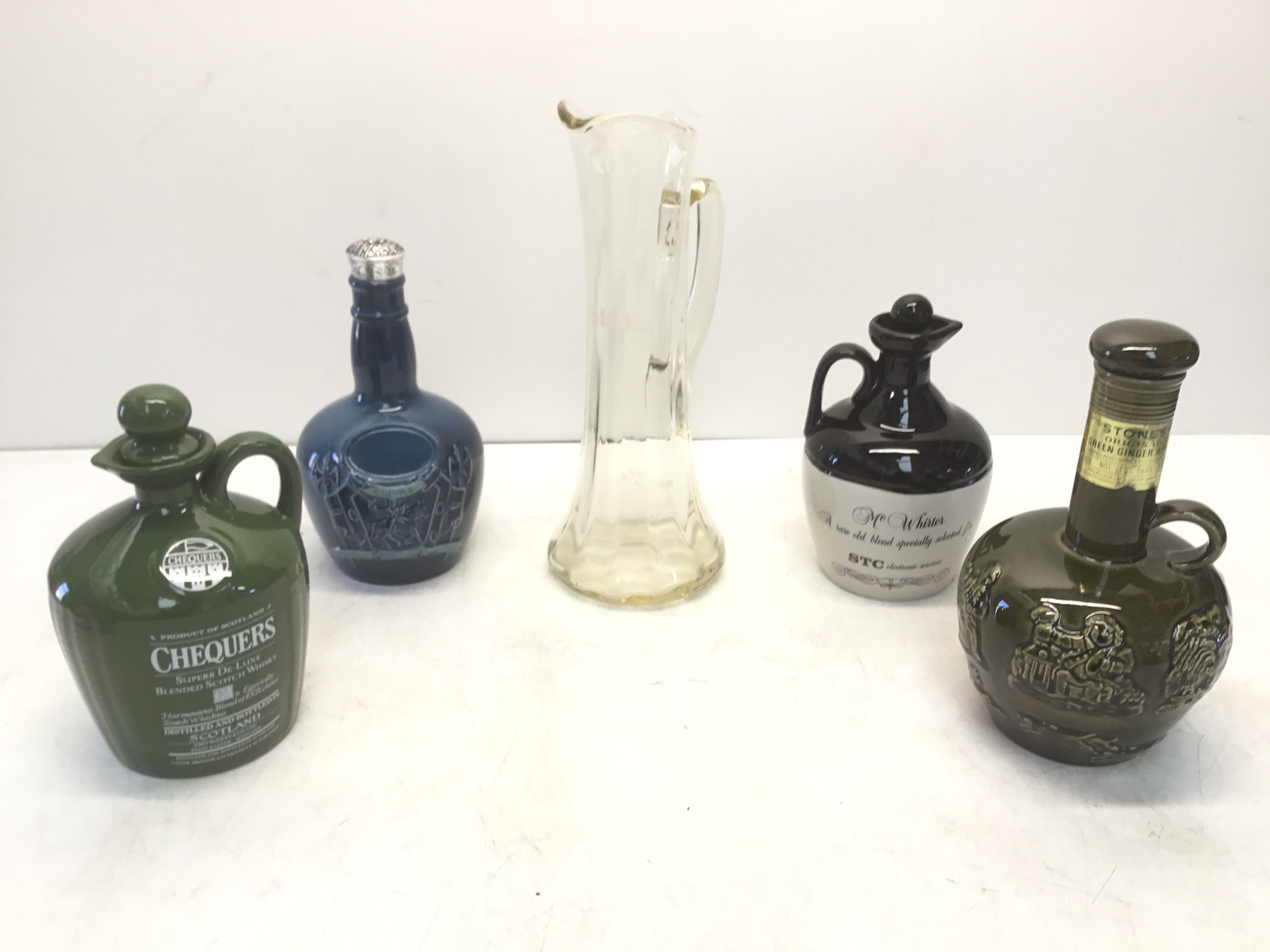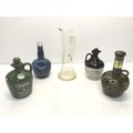 Four whiskey decanters with stoppers and a vintage Skol glass jug