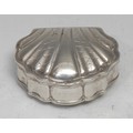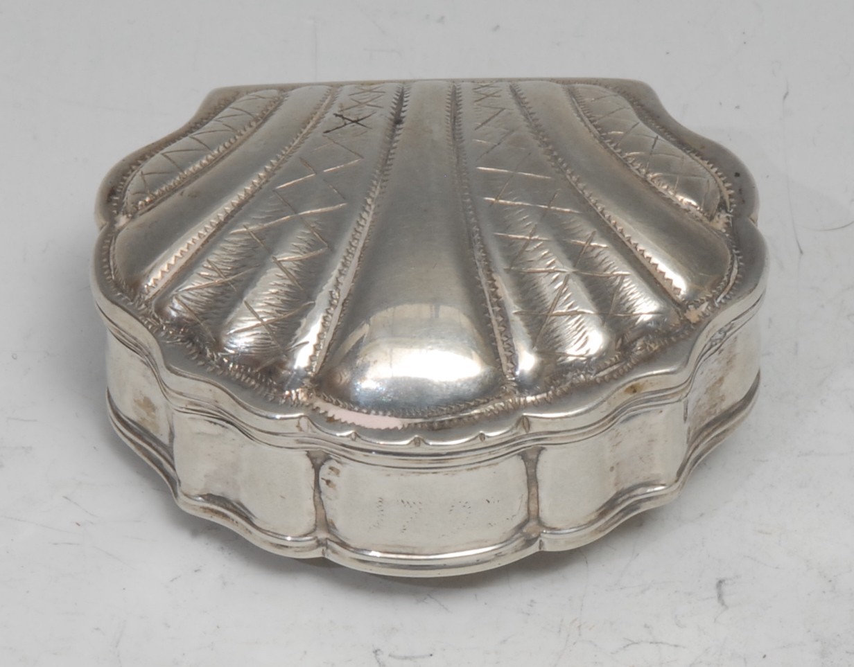 An 18th century Dutch silver shell shaped snuff box, hinged cover, 6.5cm wide, pricked initials GL and date of 1792