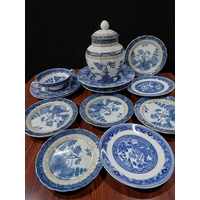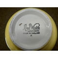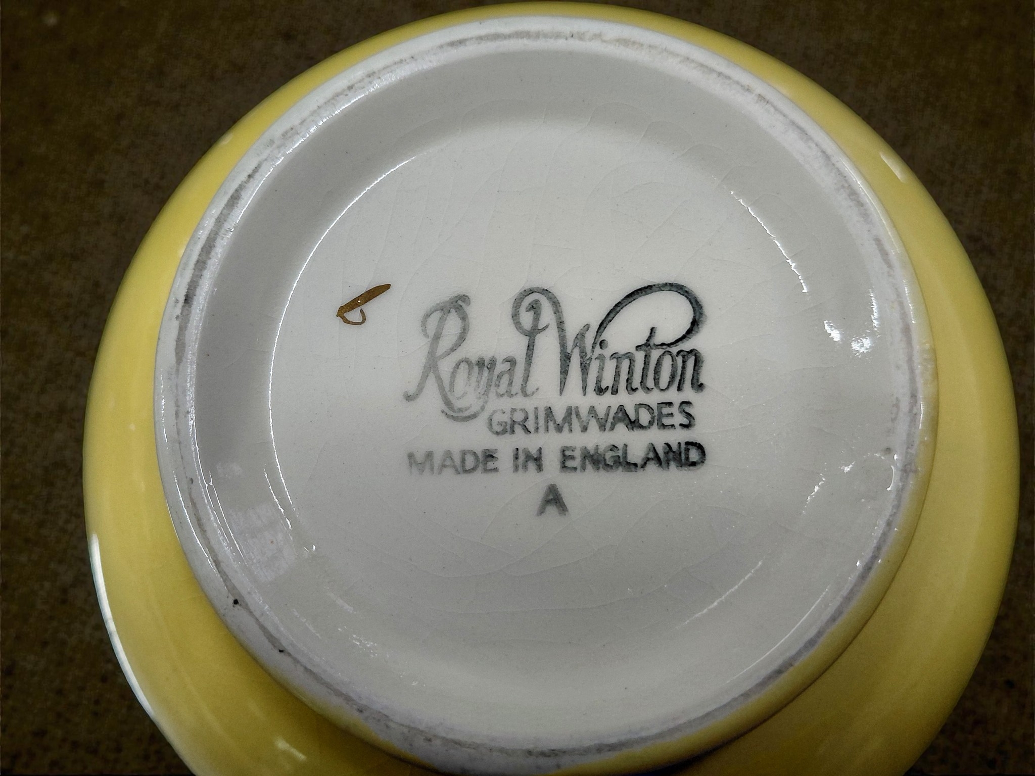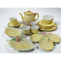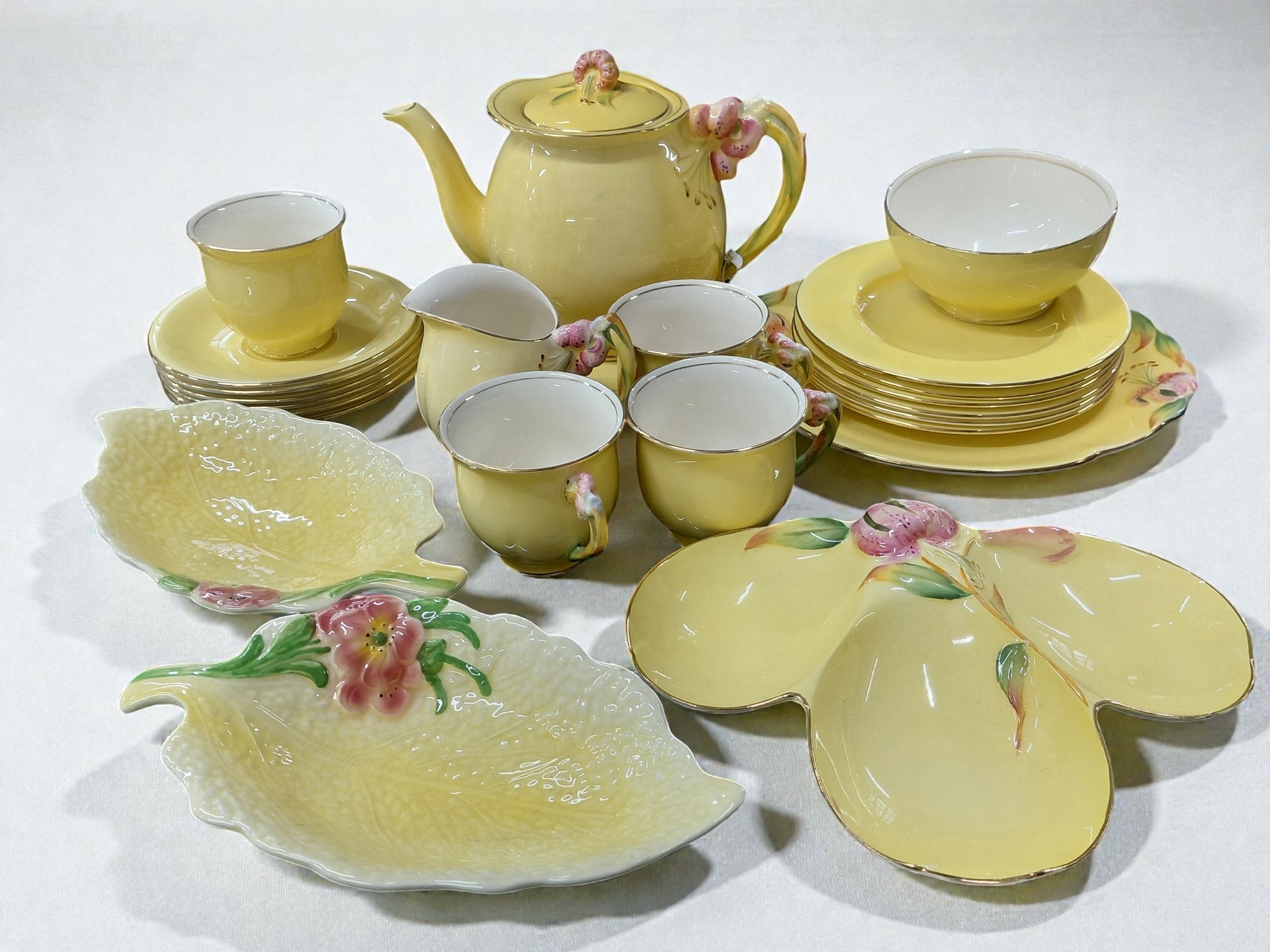 Royal Winton Fuschia pattern teaset. Comprehensive tea service in Royal Winton's Fuschia pattern showing characteristic pale yellow ground with pink fuschia flower finials and handles. Service includes teapot with floral finial, six teacups, six saucers (stacked), six side plates, plus three leaf-form serving dishes with embossed texture and pink flower handles, cream jug, sugar bowl. White interiors to cups and serving pieces. Royal Winton chintzware from mid-20th century production showing quality English ceramics with Art Deco influence. Complete teaset in collectible pattern appealing to Royal Winton enthusiasts.