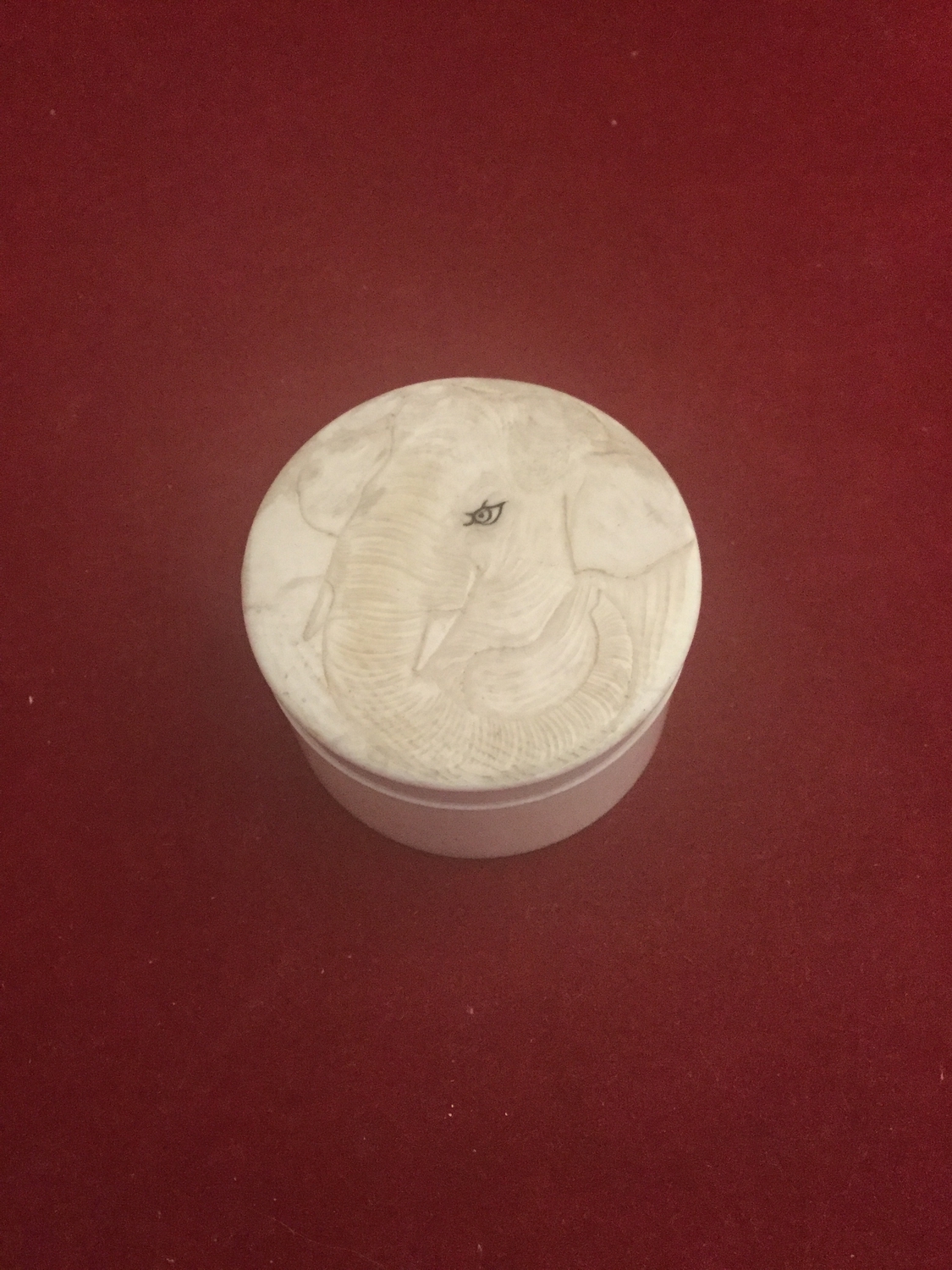 An early 20th century carved ivory box and cover, cylindrical, the cover carved with elephants head -