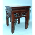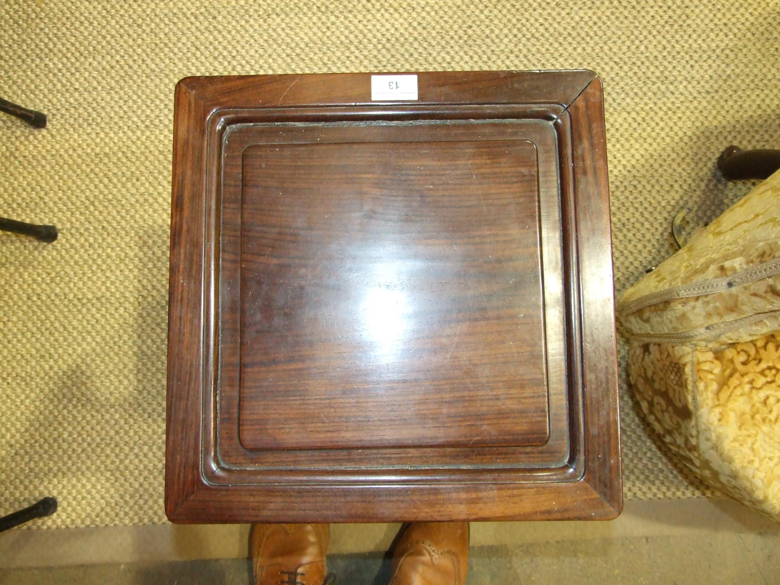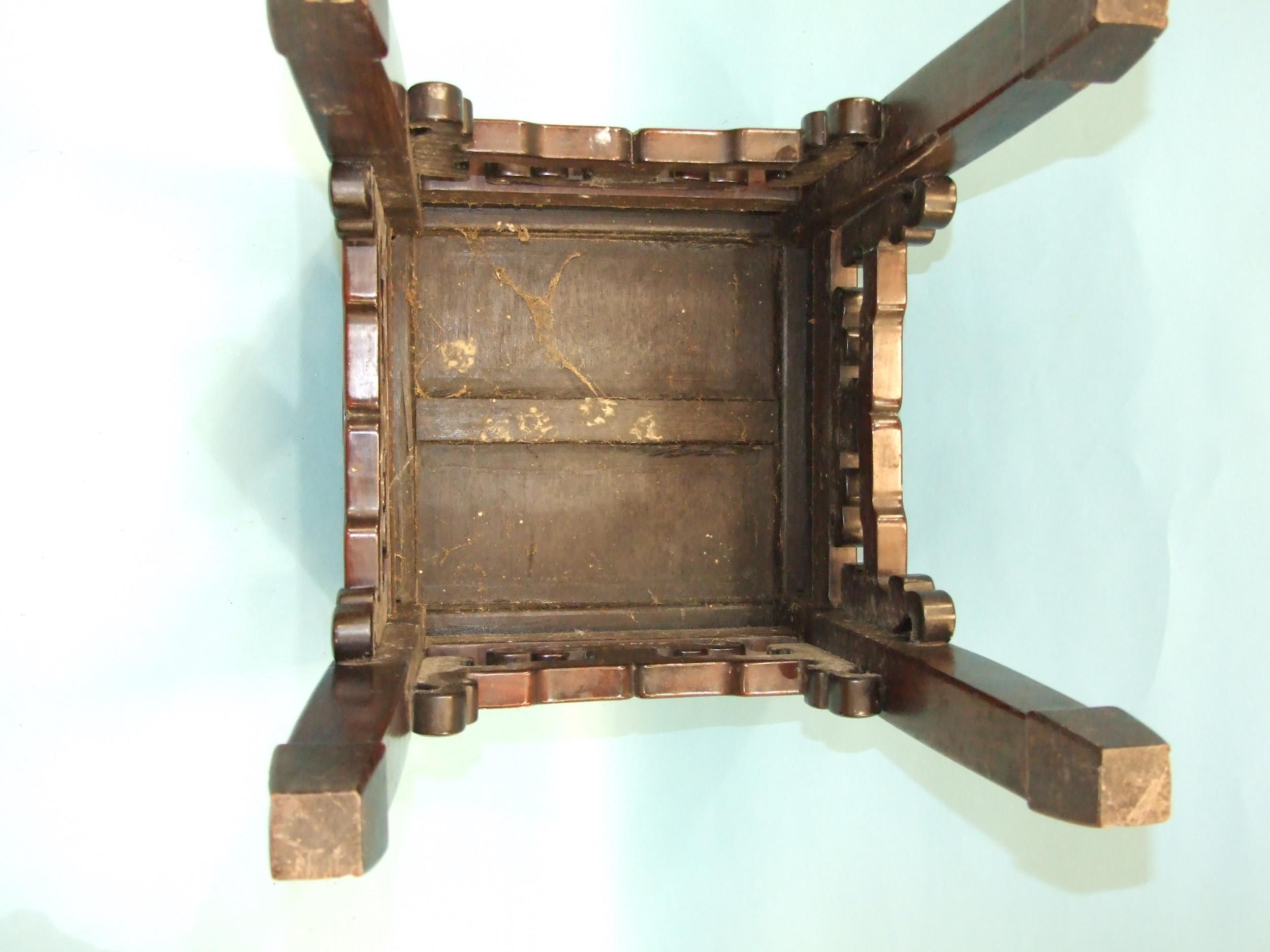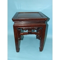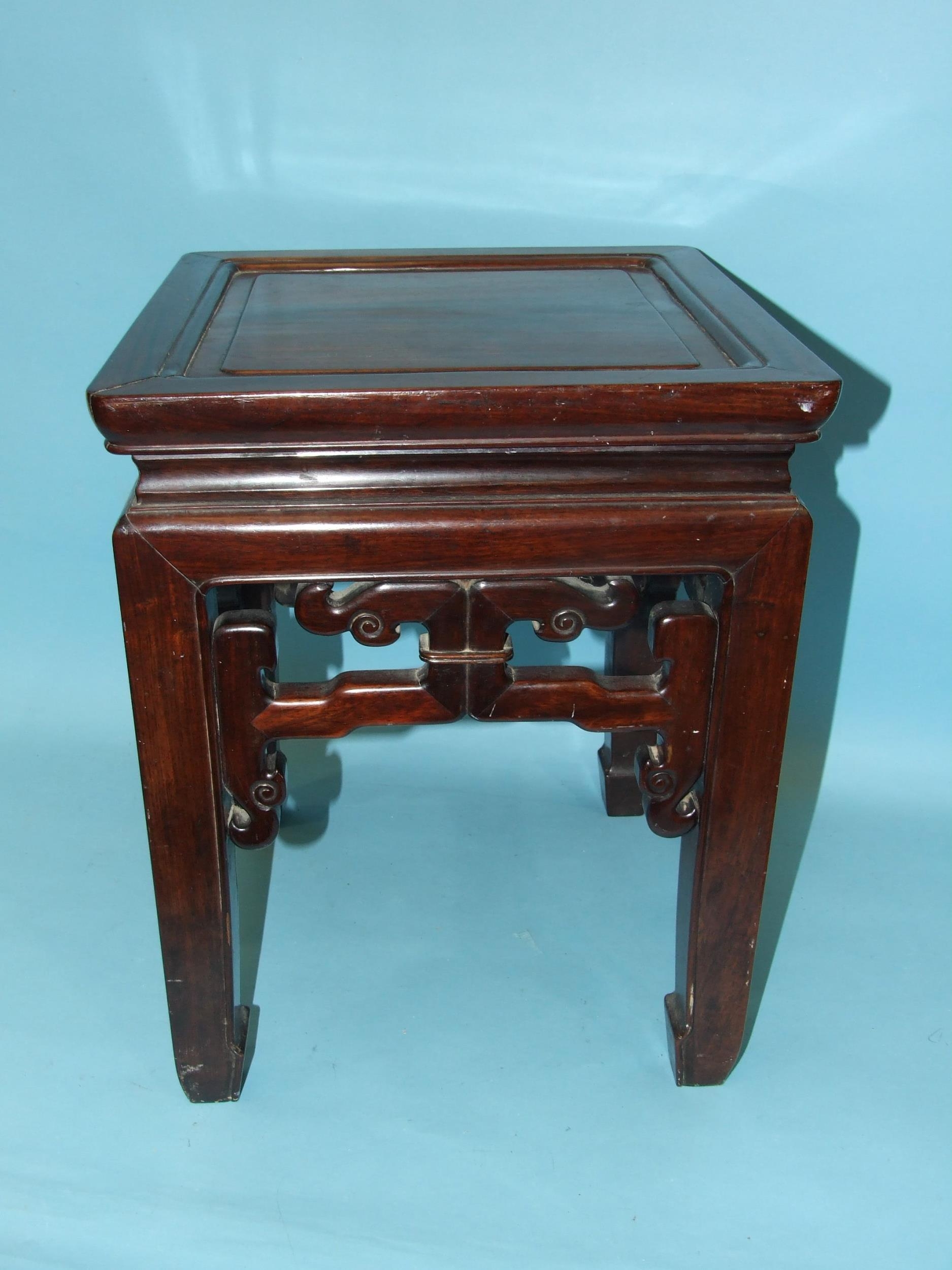 A Chinese hardwood square-topped urn stand with pierced frieze decoration, on square shaped legs, 36cm square, 45cm high.