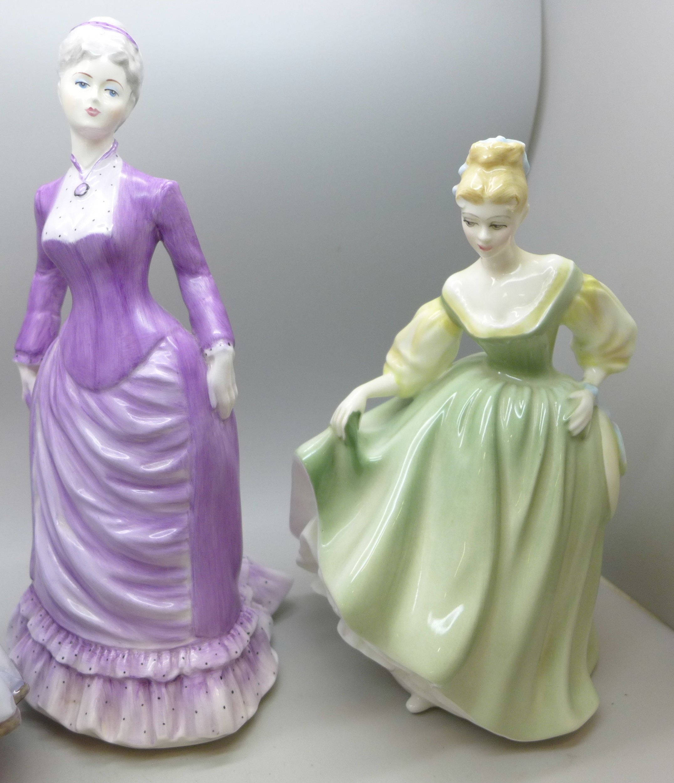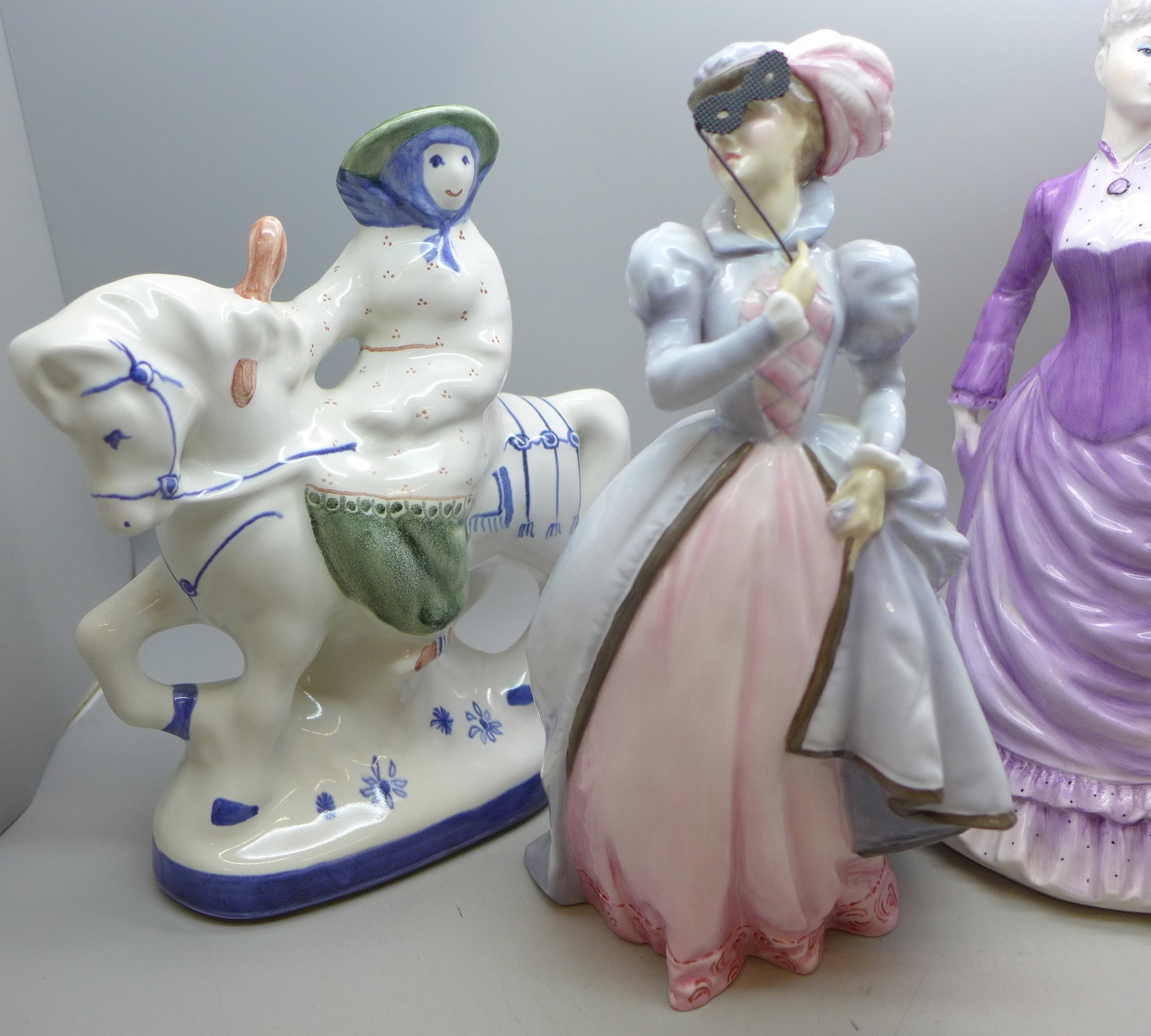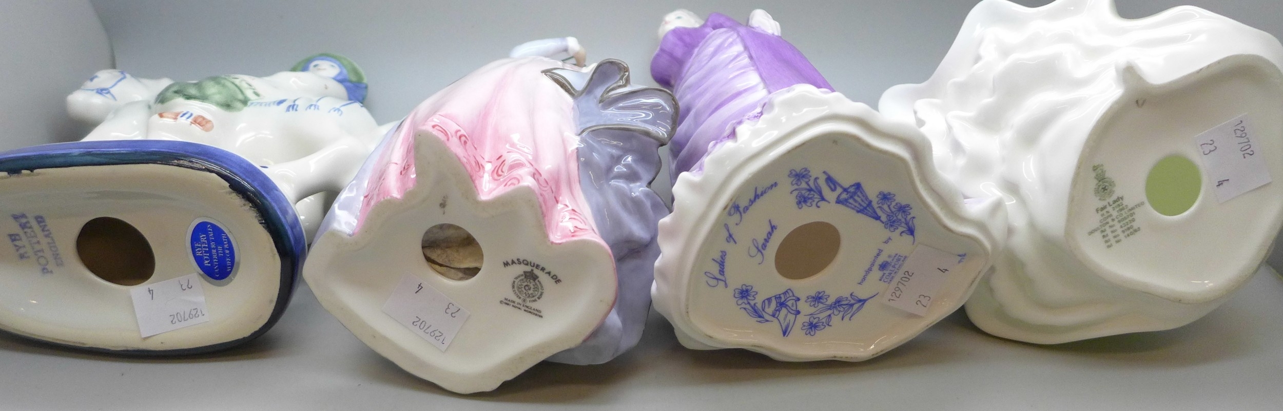 Four figures, Royal Worcester 'Masquerade', Coalport 'Ladies of Fashion Sarah', Royal Doulton 'Fair Lady' and one Rye Pottery