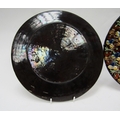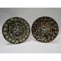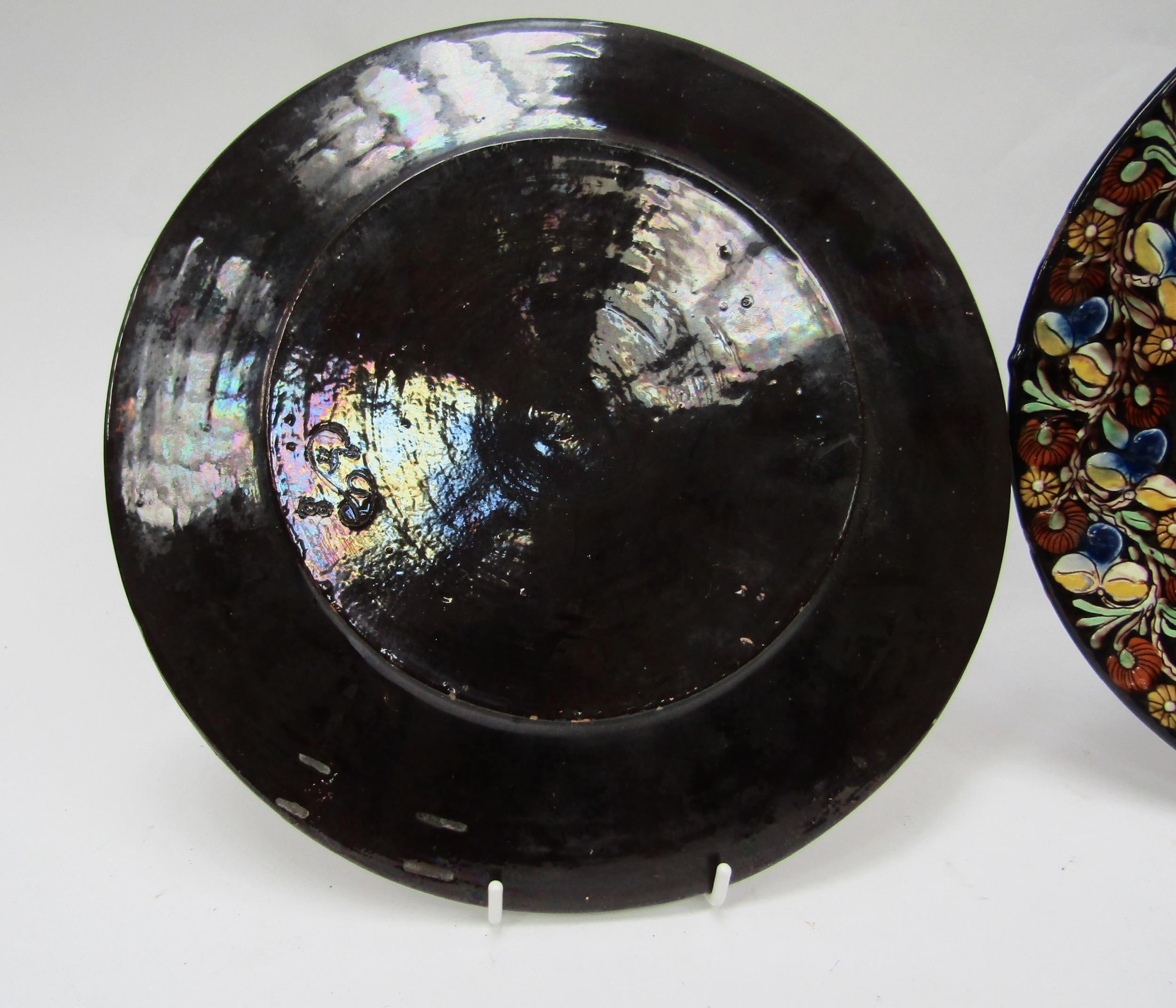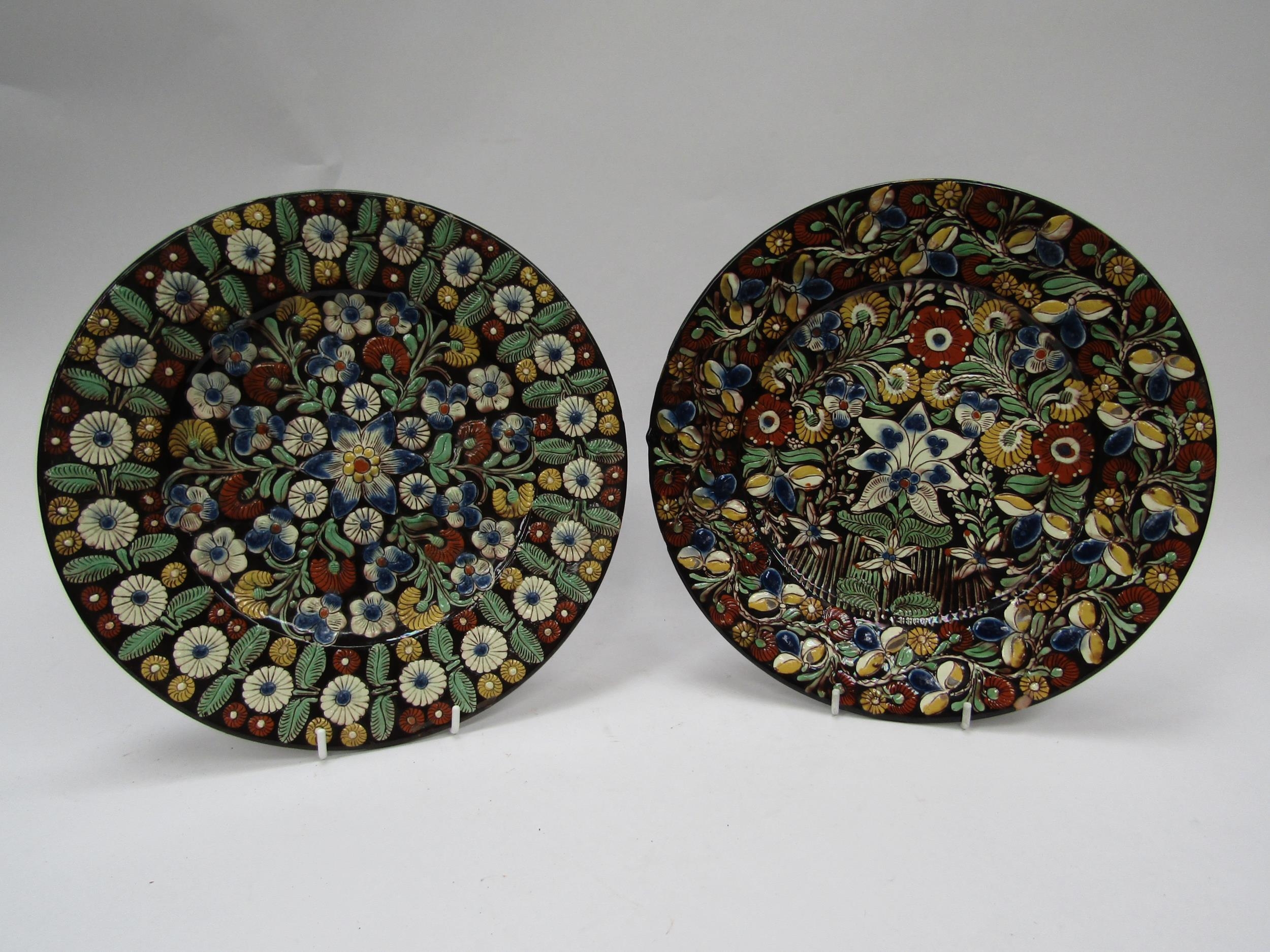 A pair of Continental glazed and painted clay wall plates, 26.5cm diameter