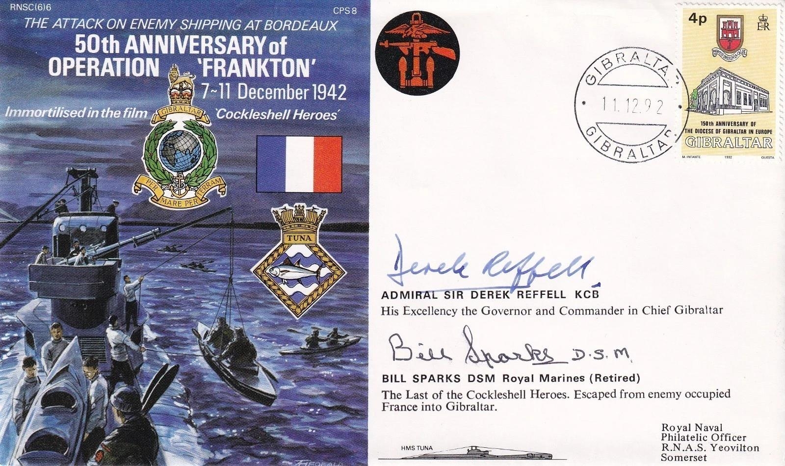 Operation Frankton The Cockleshell Heroes. Bill Sparks RM Cockleshell Heroes. and Ad Sir Derek Refell. 11 Dec 92 - Gibraltar - 4p 150th Anniversary of the Diocese in Gibraltar in Europe - the Attack on Enemy Shipping at Bordeaux - 50th Anniversary of Operation Frankton immortalised in the film The Cockleshell Heroes. Personally Signed by Bill Sparks DSM Royal Maries The last of the Cockleshell Heroes. Escaped from enemy occupied France into Gibraltar and Signed by Admiral sir Derek Refell KCB. His Excellency the Governor and Commander in Chief Gibraltar. RARE only 50 issued. Good condition. All autographs come with a Certificate of Authenticity. We combine postage on multiple winning lots and can ship worldwide. UK postage from £5.99, EU from £7.99, Rest of World from £9.99