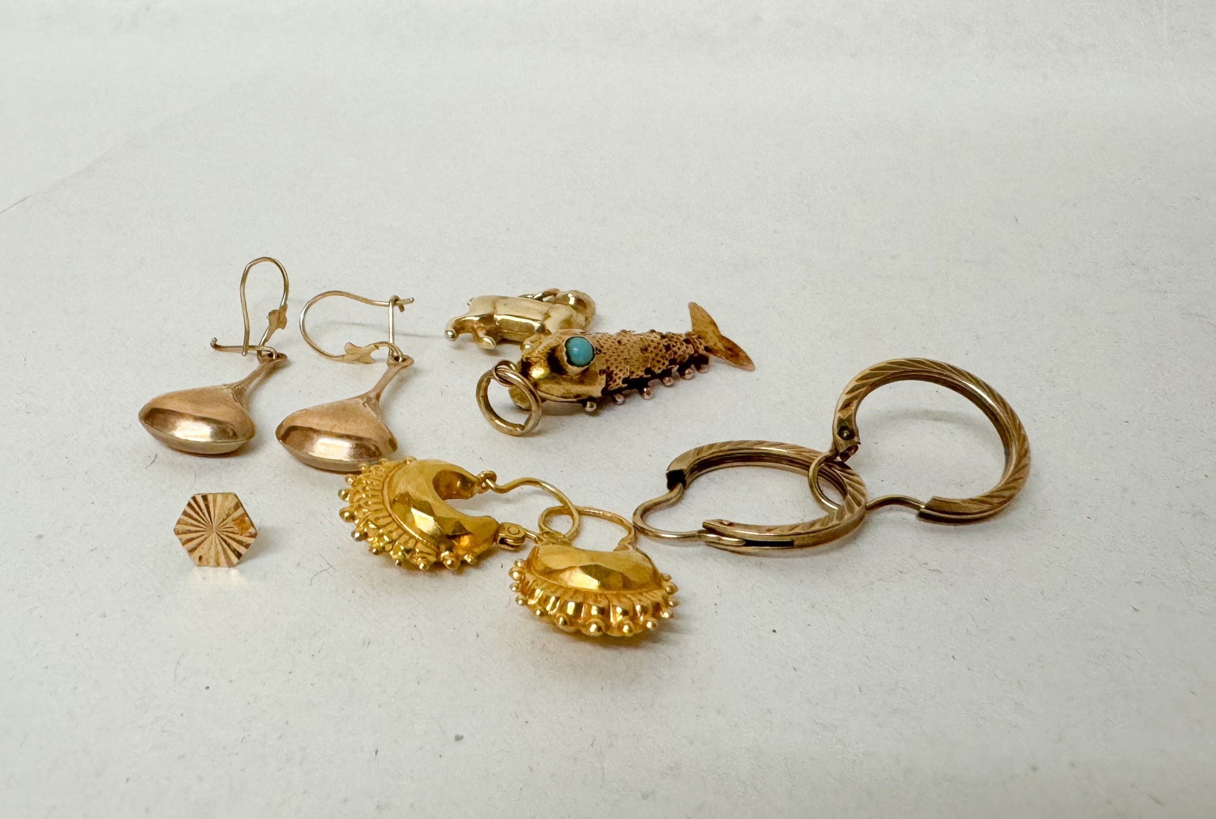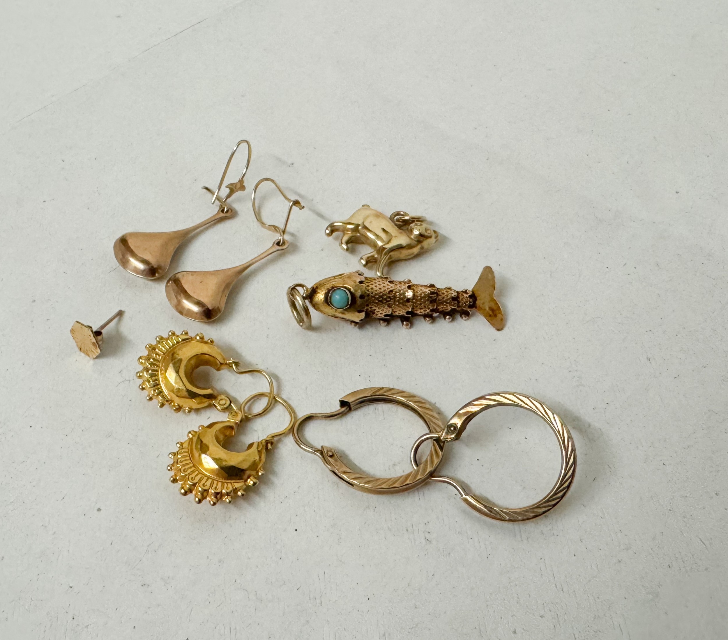 A pair of hallmarked 9ct gold creole hoop earrings, yellow metal articulated fish pendant and other items.