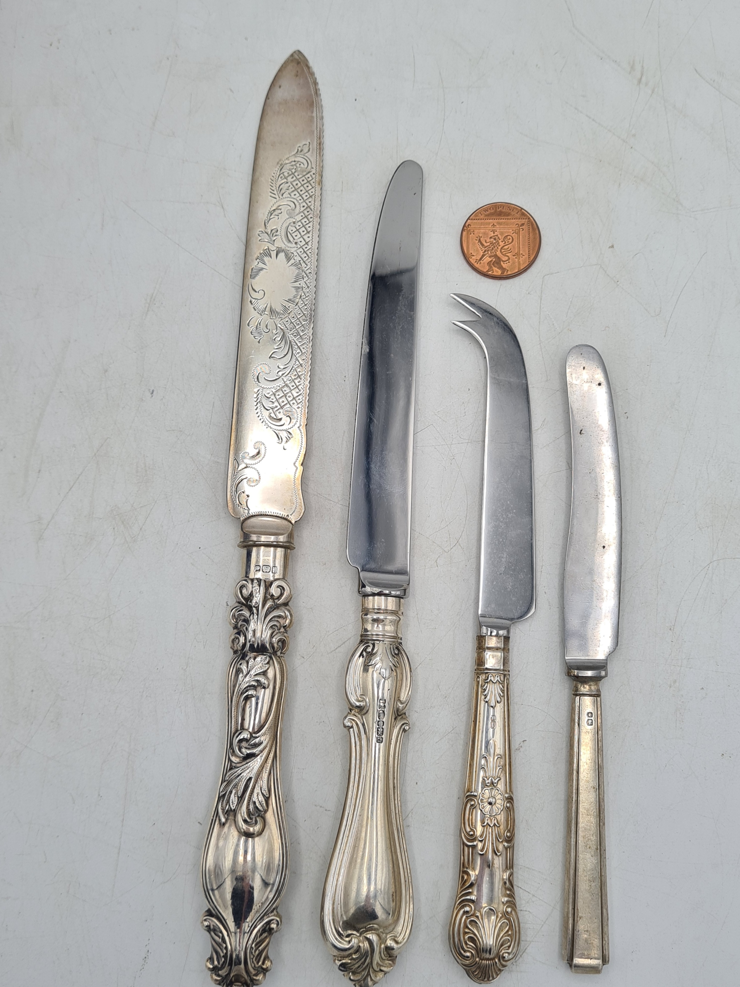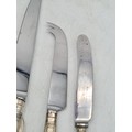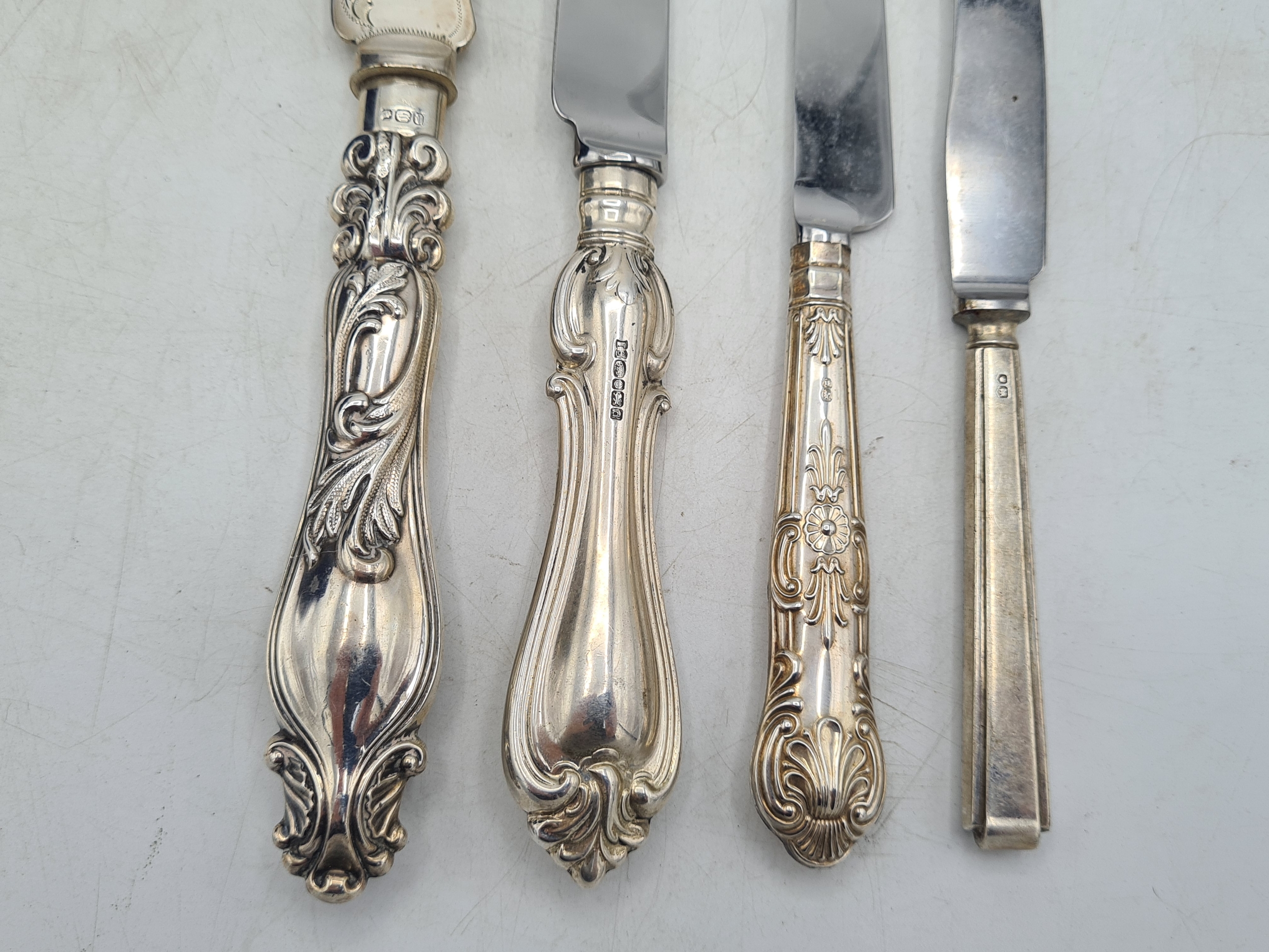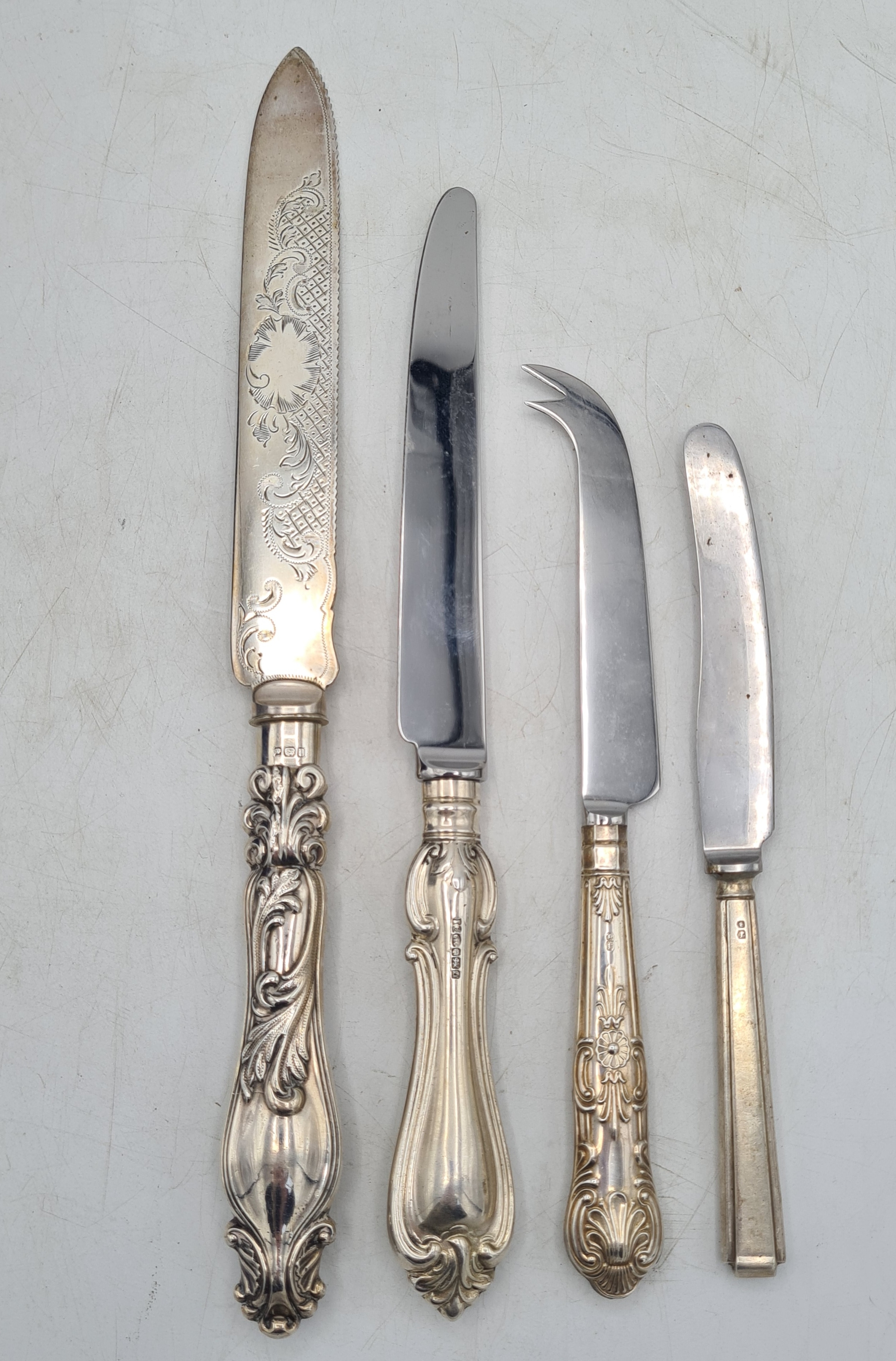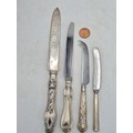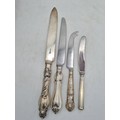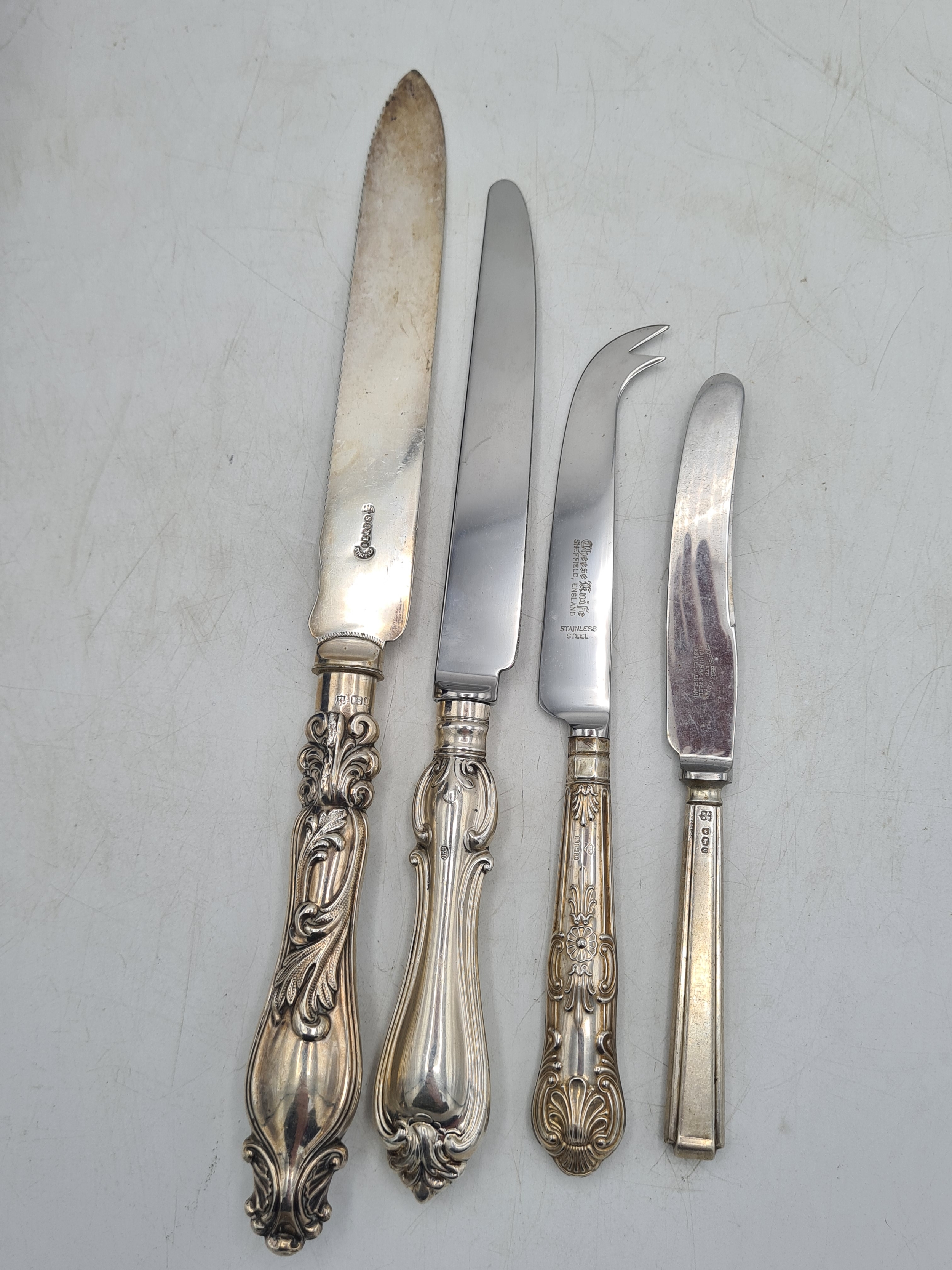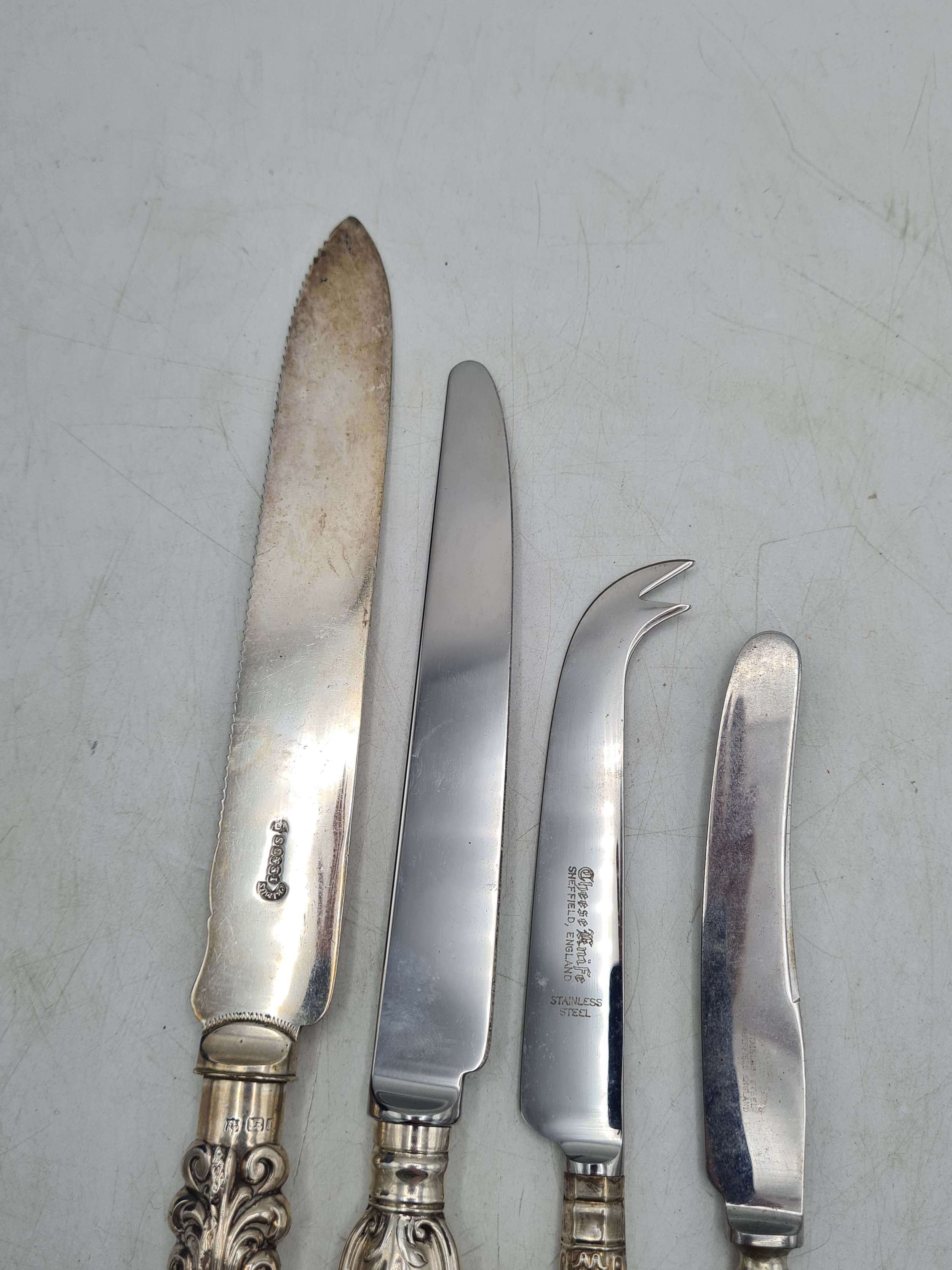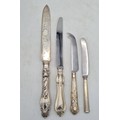 A collection of 4 knives with Sterling Silver handles to include a bread knife, a dinner knife, a cheese knife and a butter knife.