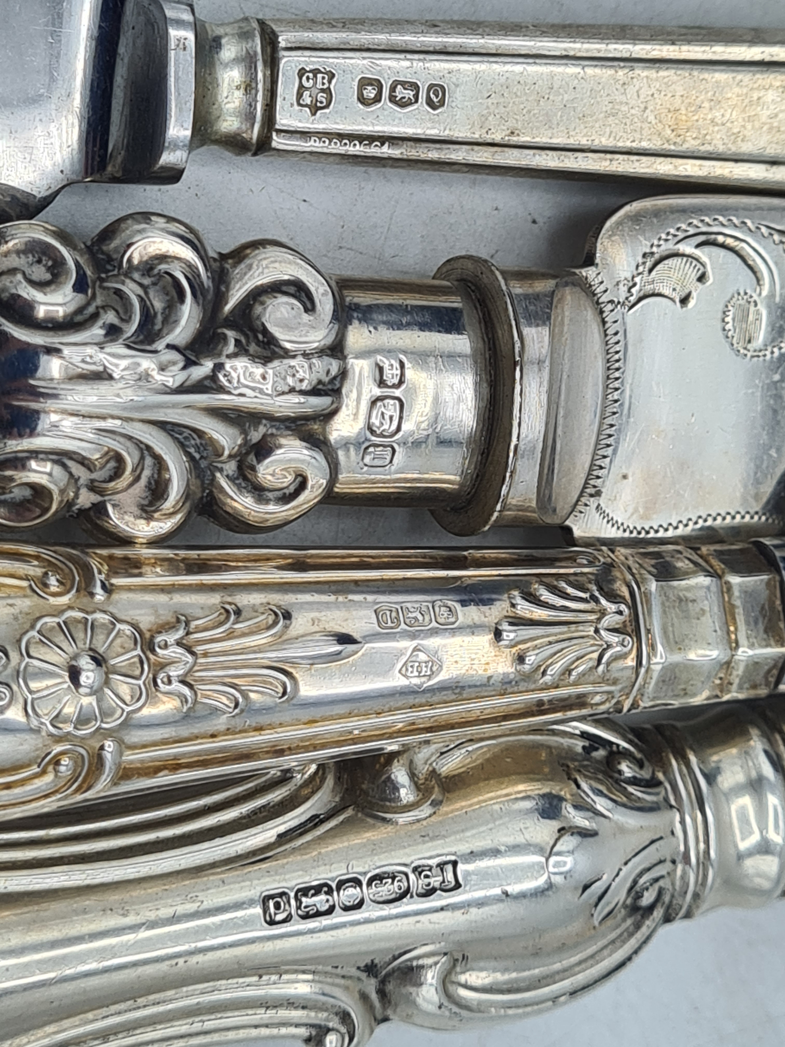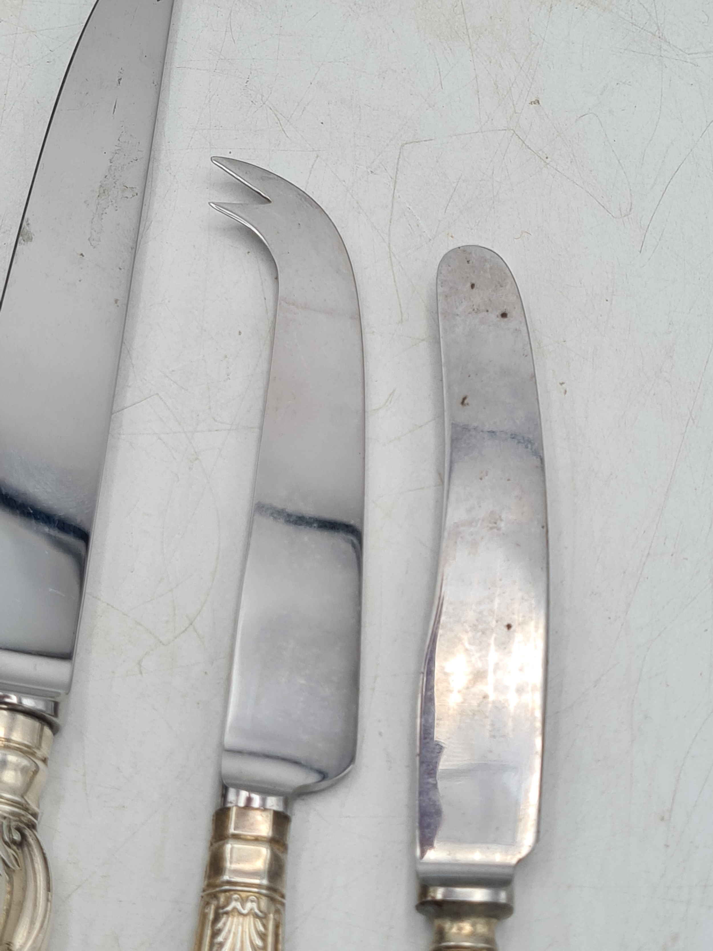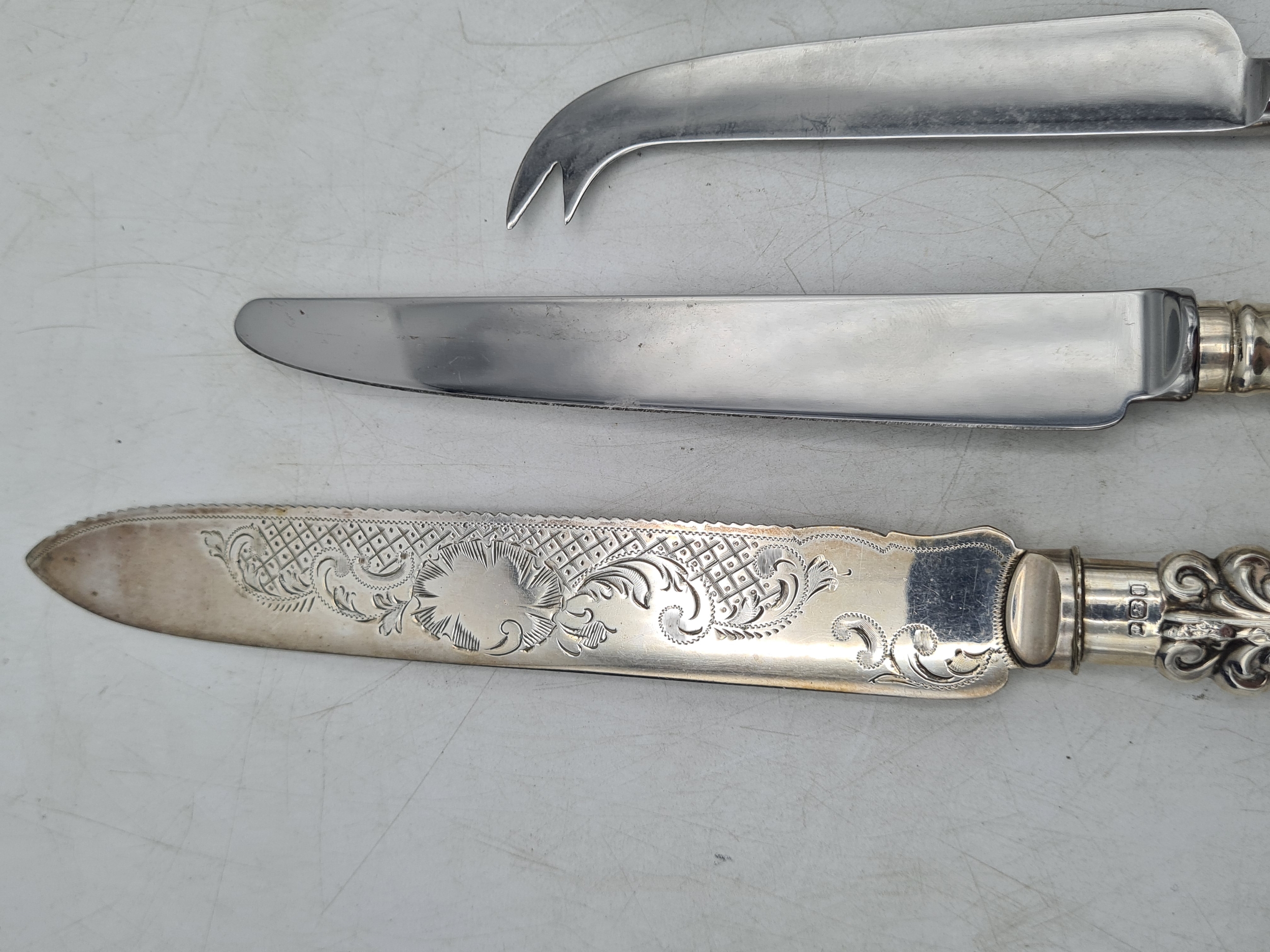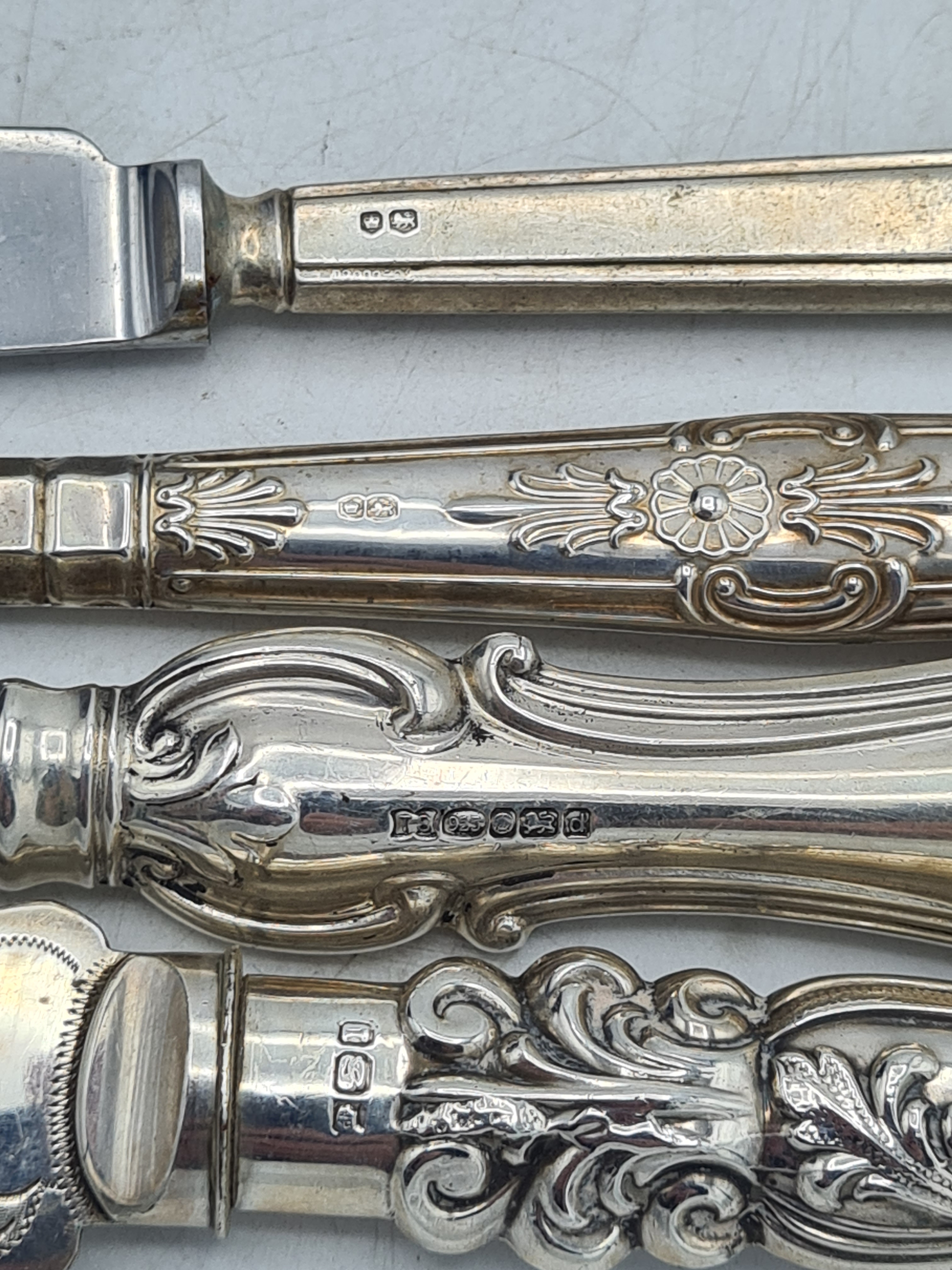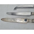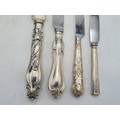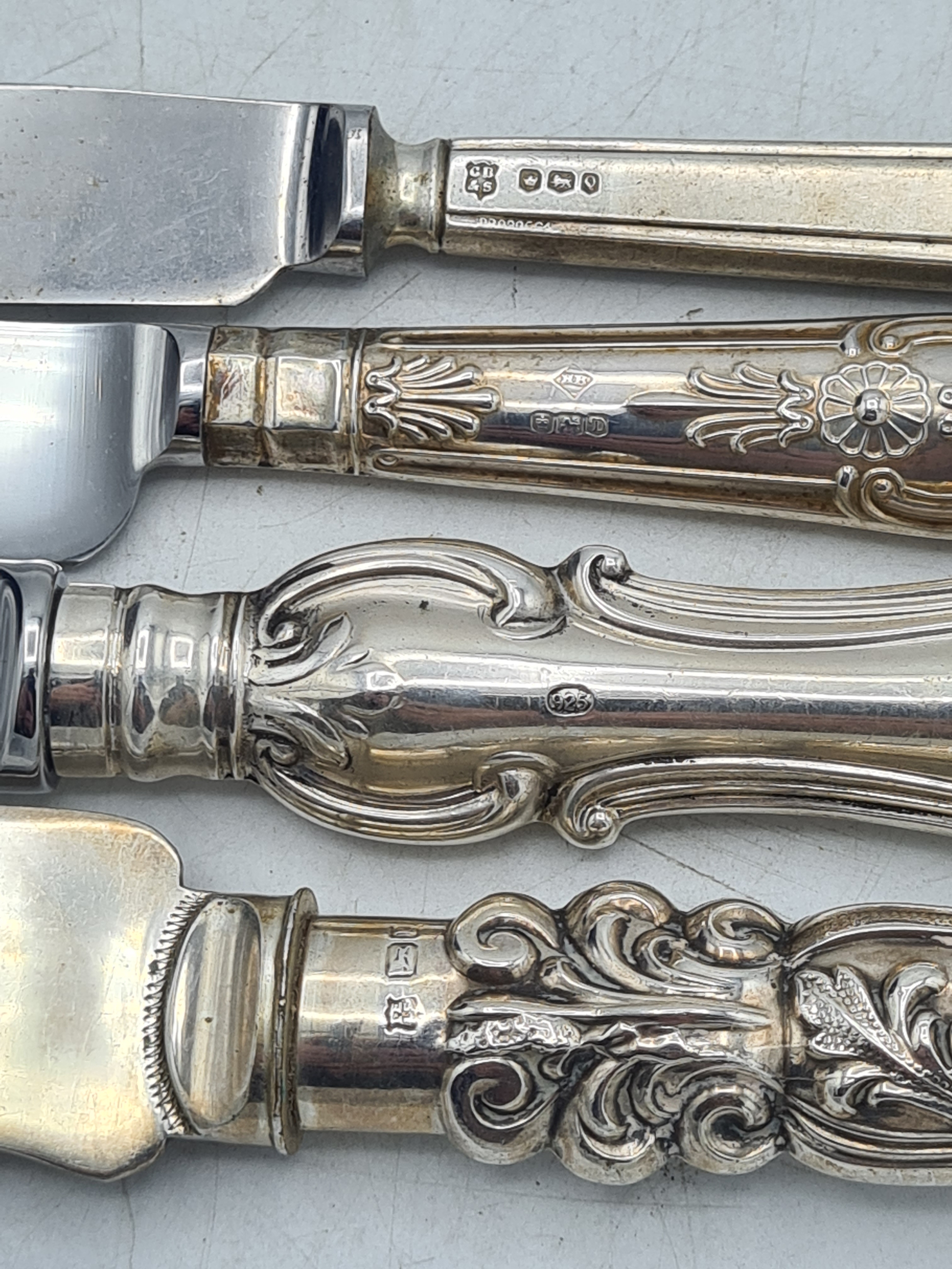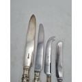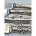 A collection of 4 knives with Sterling Silver handles to include a bread knife, a dinner knife, a cheese knife and a butter knife.