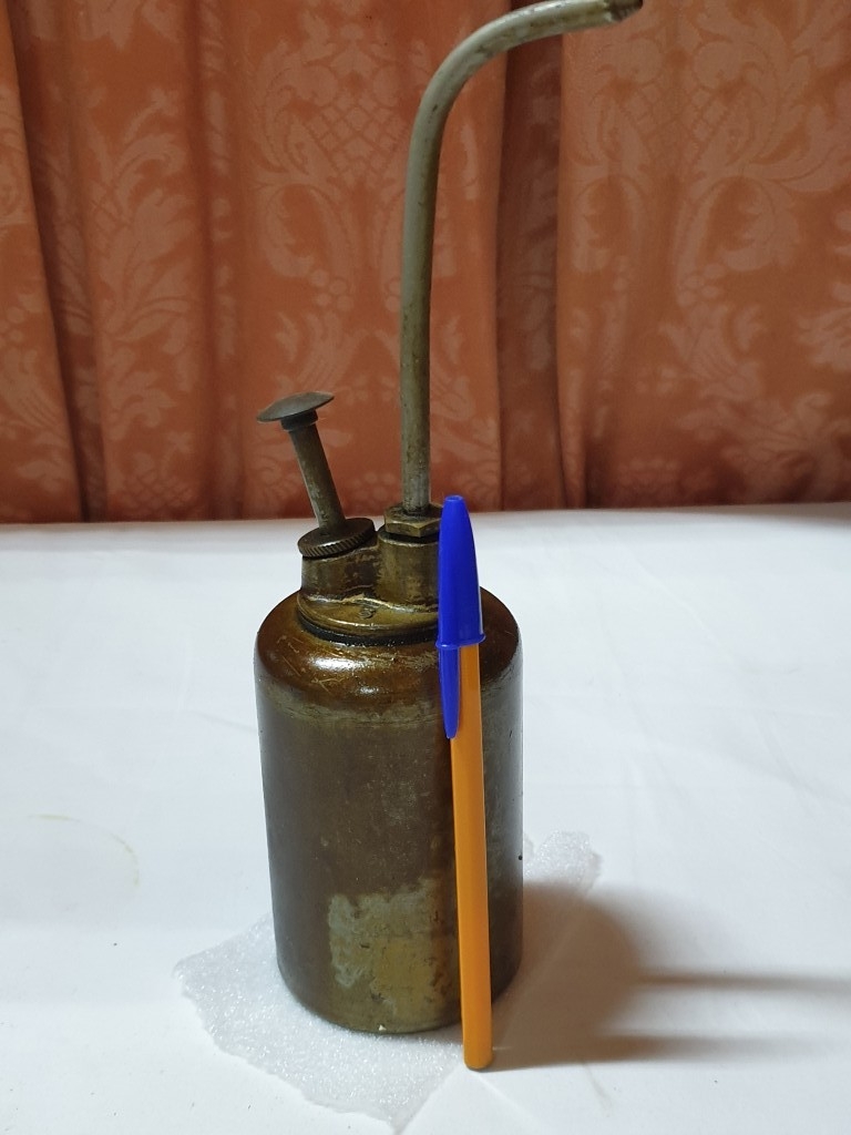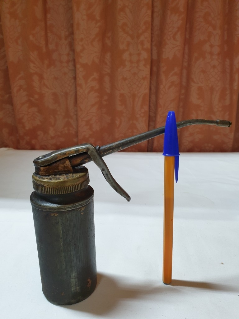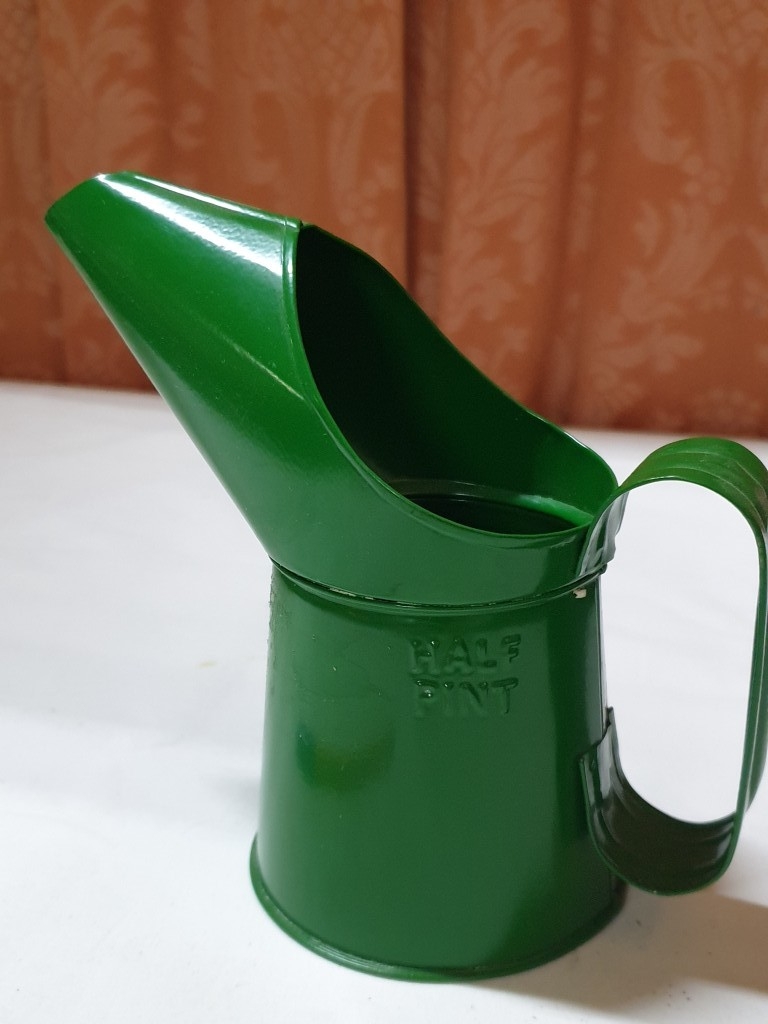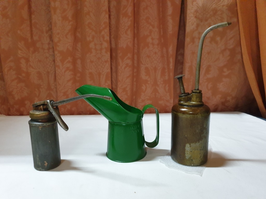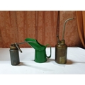 2 vintage pump action oil cans & ½ pint oil pourer jug , oil cans – 26cm & 15 cm high and pourer – 15cm high (3 pcs)