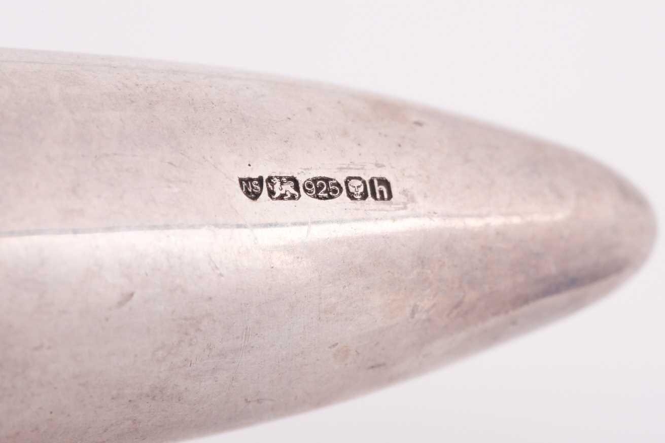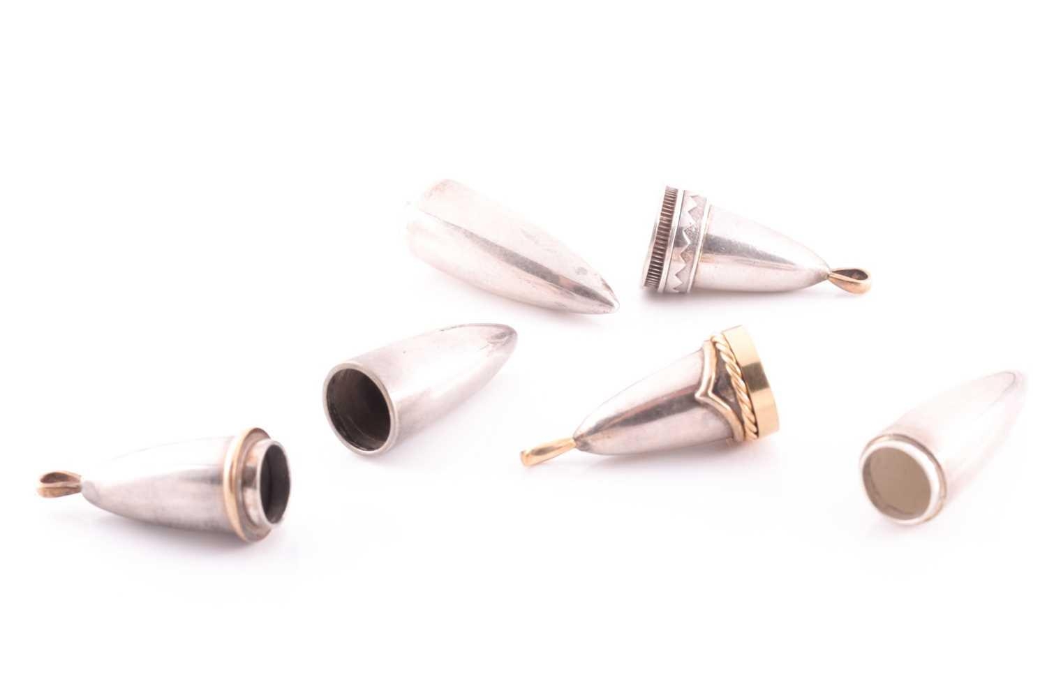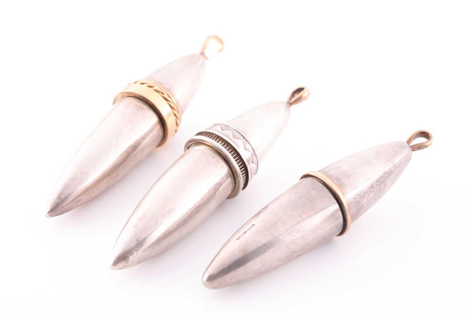 A silver gilt torpedo-shaped pendant, unscrewing to reveal empty interior, rope-twist decoration to lid, unmarked, 9.3 cm long, together with a similar silver torpedo pendant with gilt band and suspension loop, 8.7 cm, and another white metal torpedo pendant, 9.2 cm long. (3)