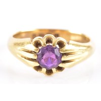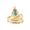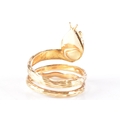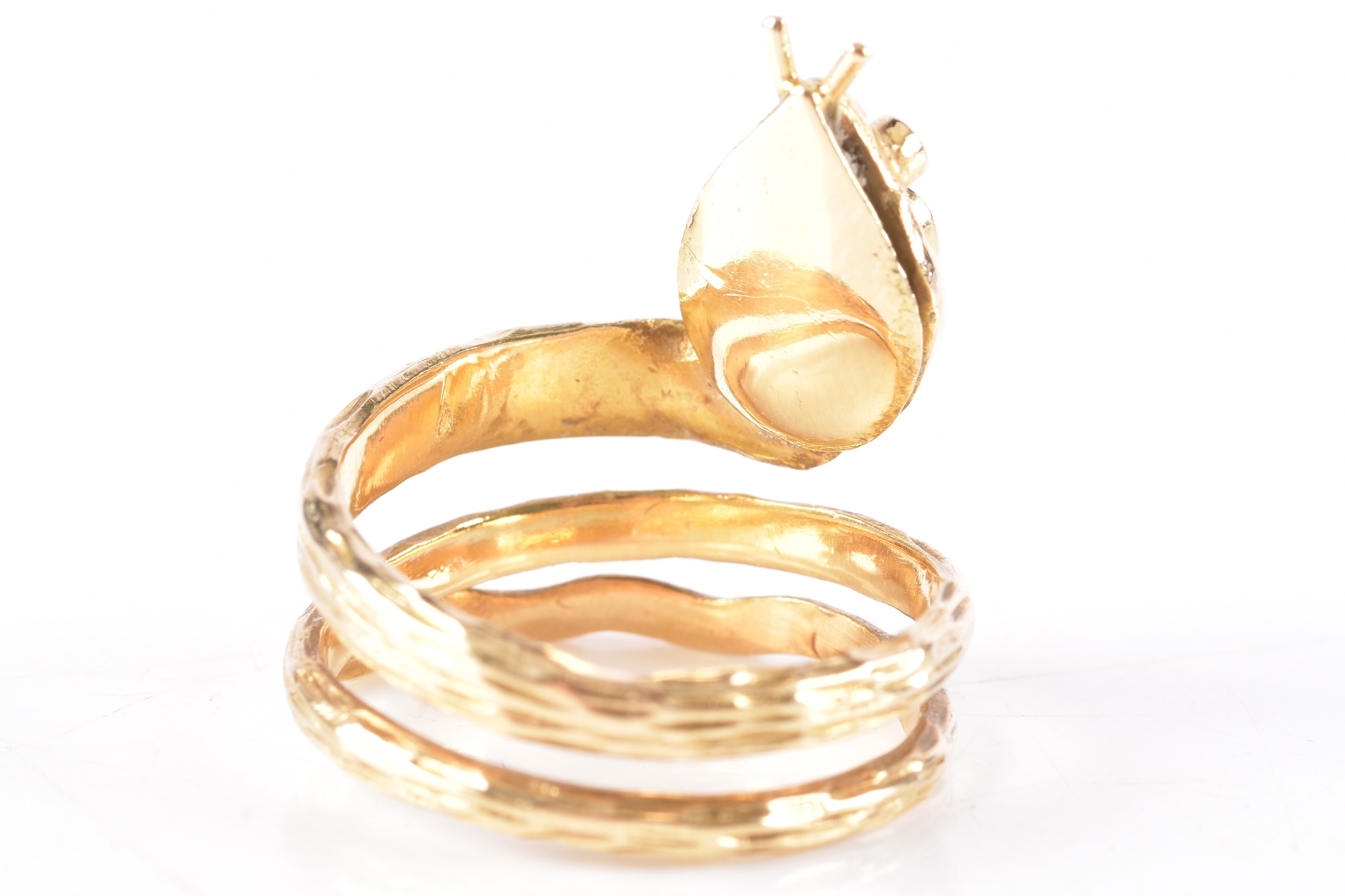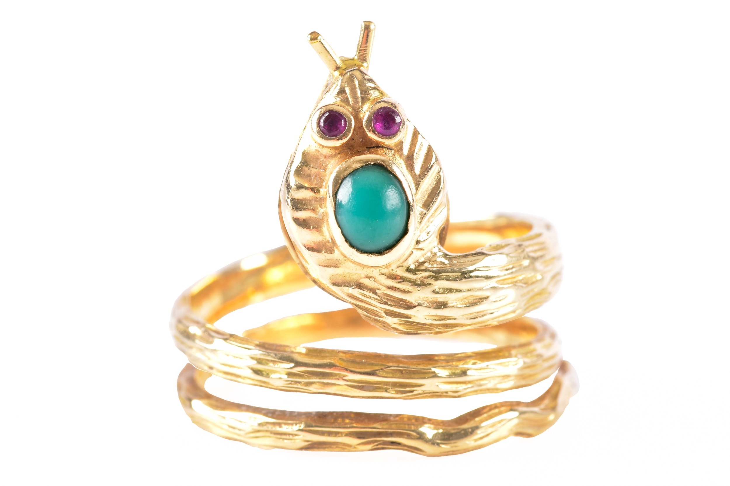 A yellow gold snake ring, set with a oval cabochon turquoise stone to the head, with ruby set eyes, slightly flexible coiled design, approximately size L.