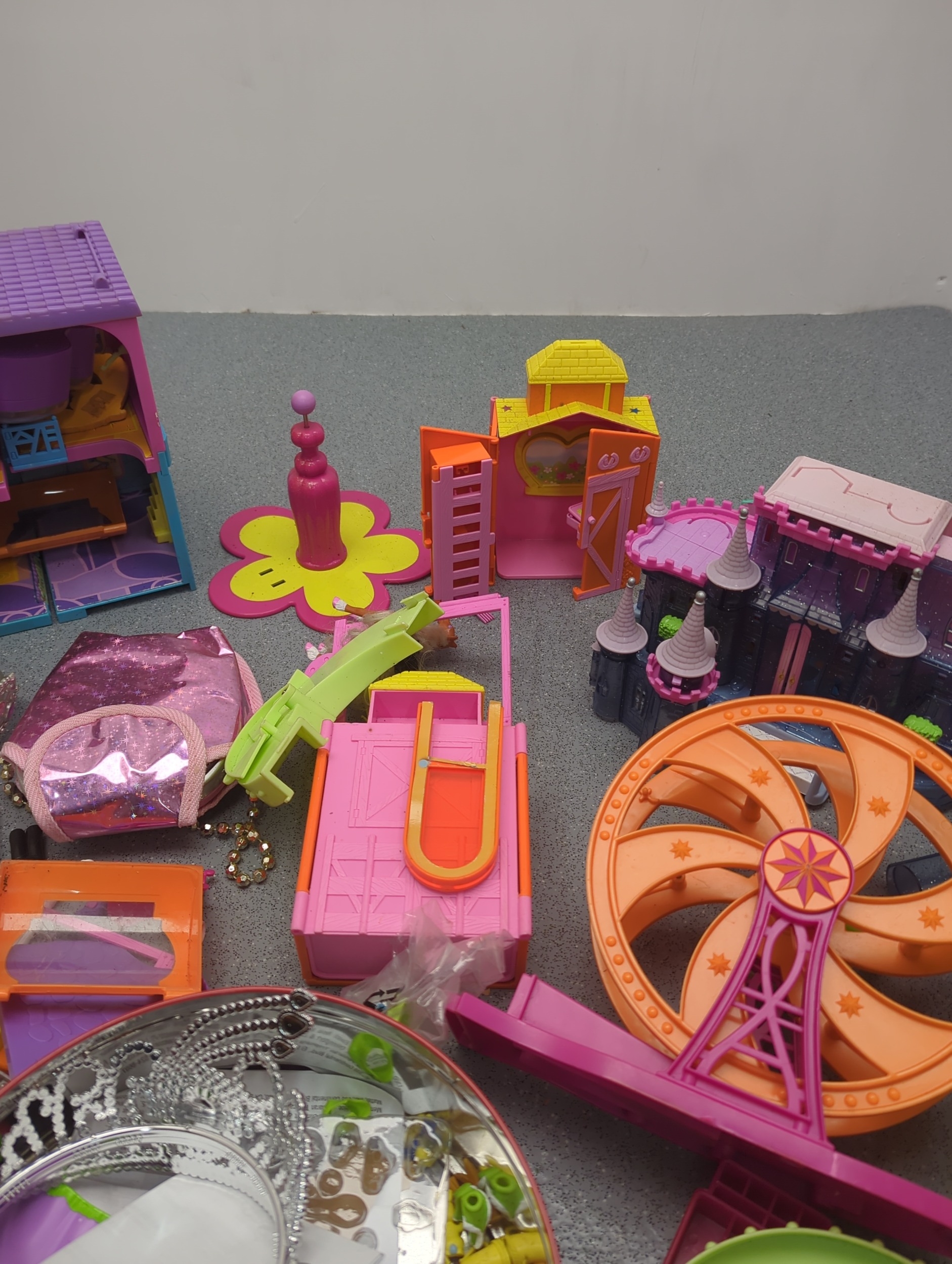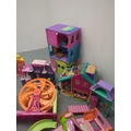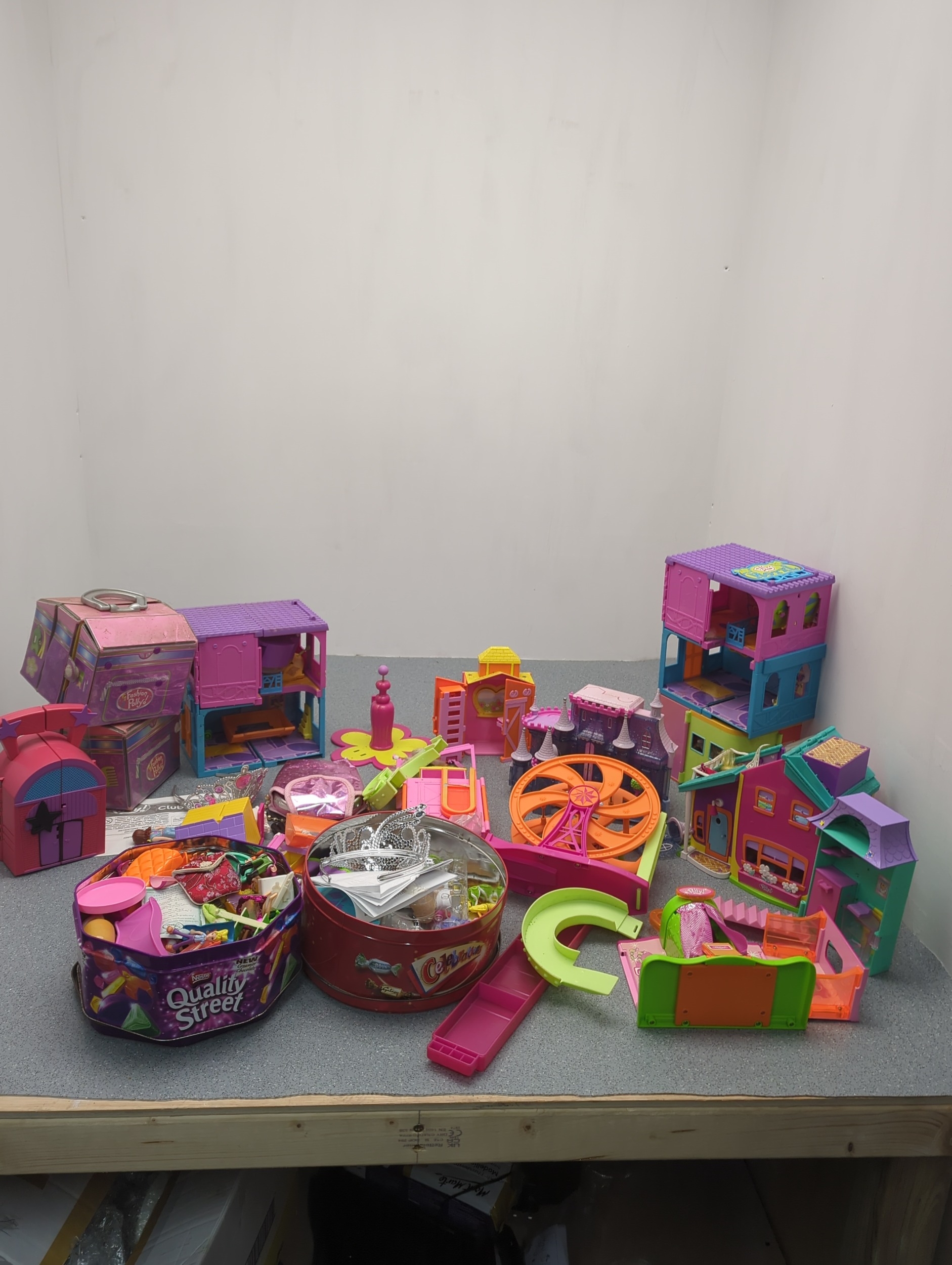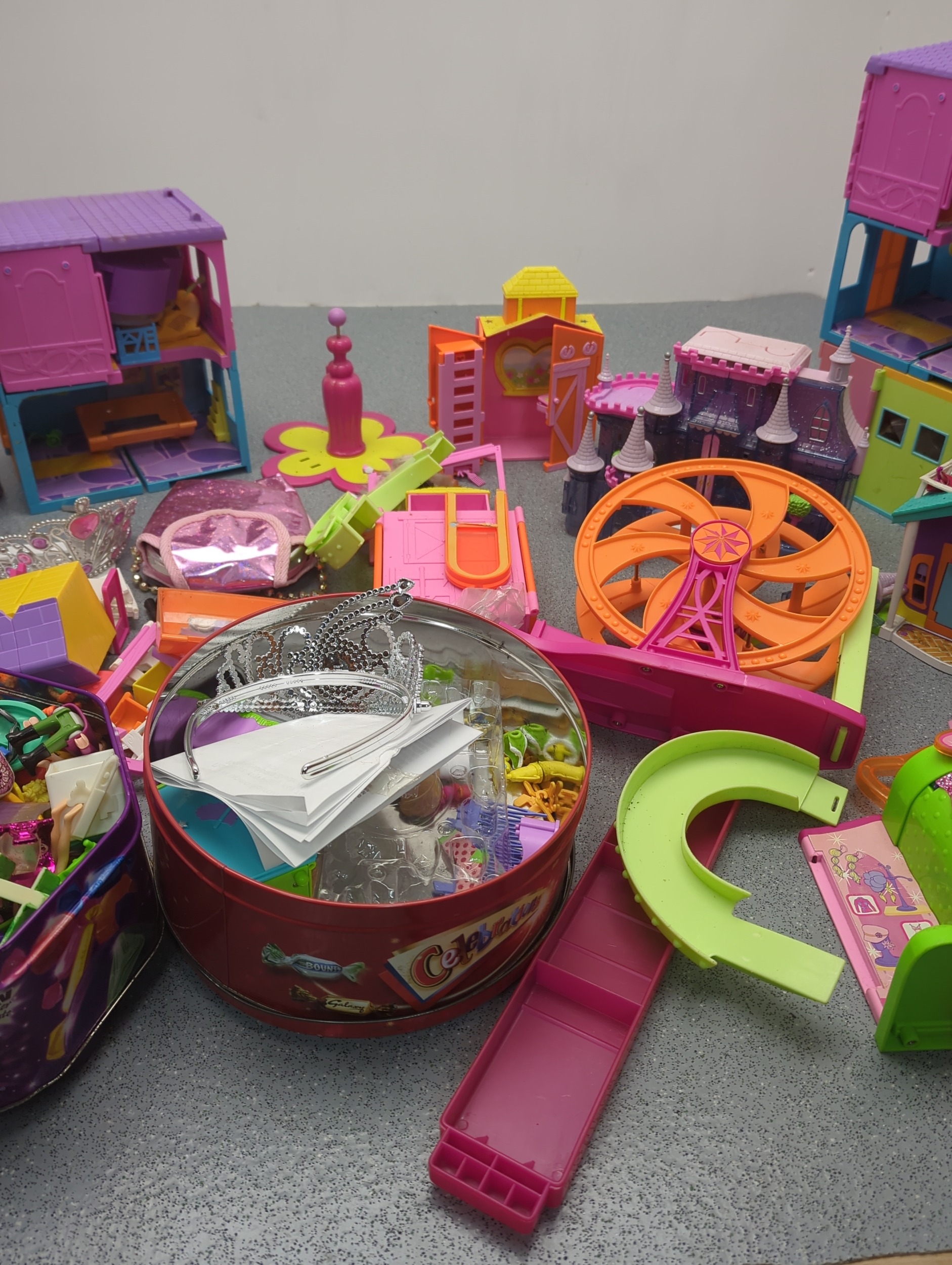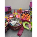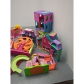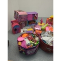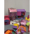 This collection features a colourful assortment of toy buildings and accessories, including plastic dollhouses and a variety of play pieces. The lot includes vibrant structures and moveable parts, providing ample opportunity for imaginative play. Additional items such as miniature furniture and decorative elements are included, stored in tins and containers.