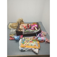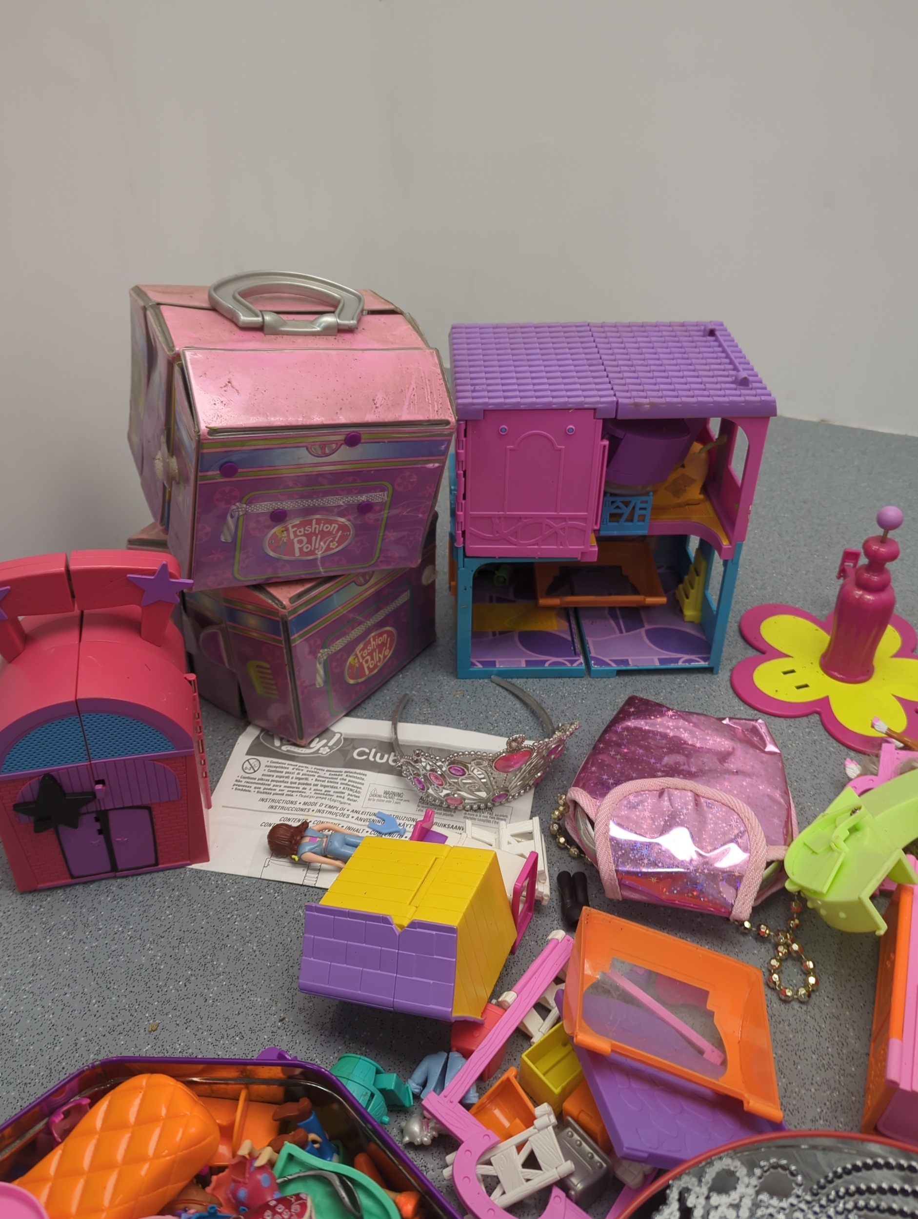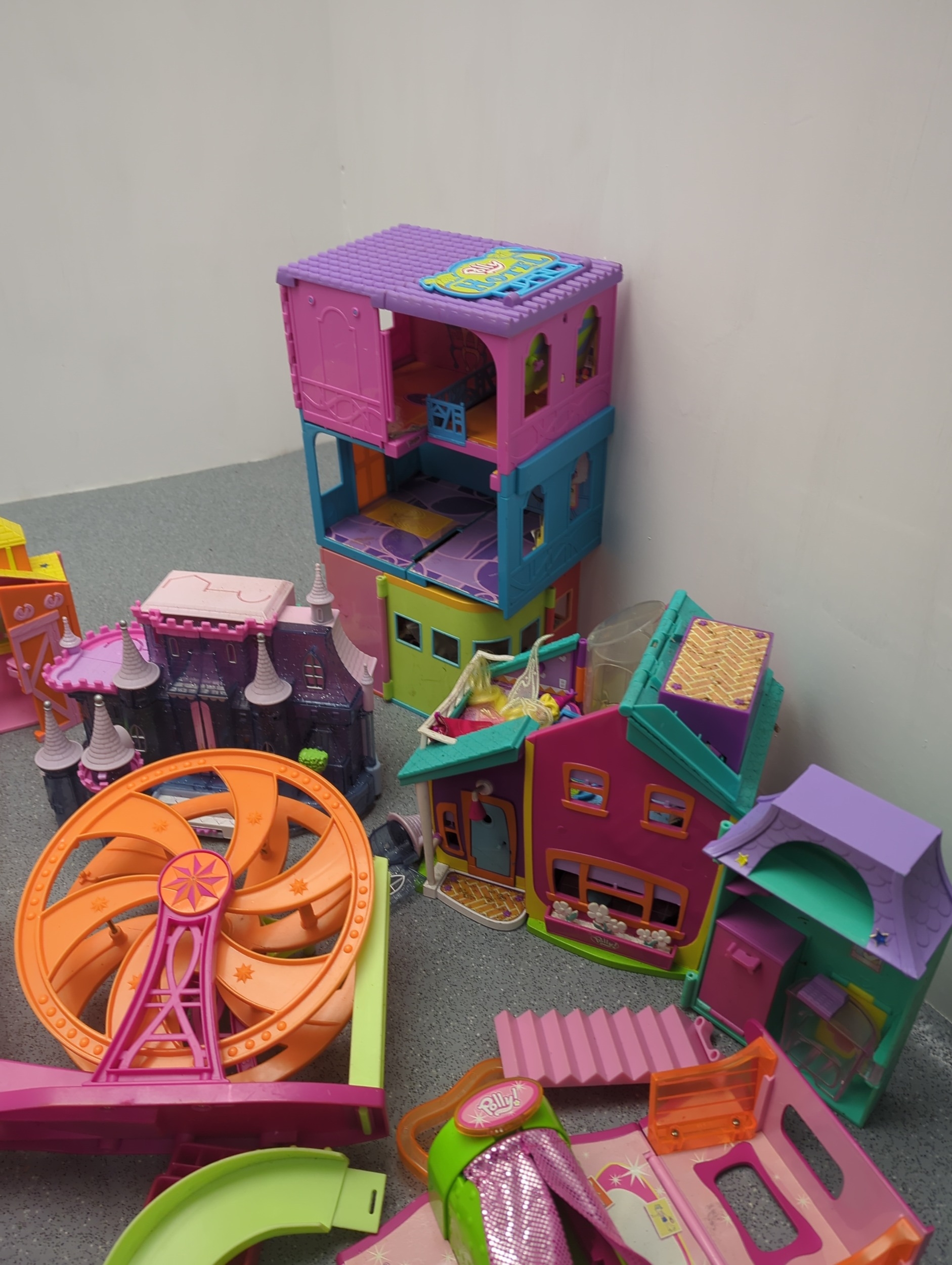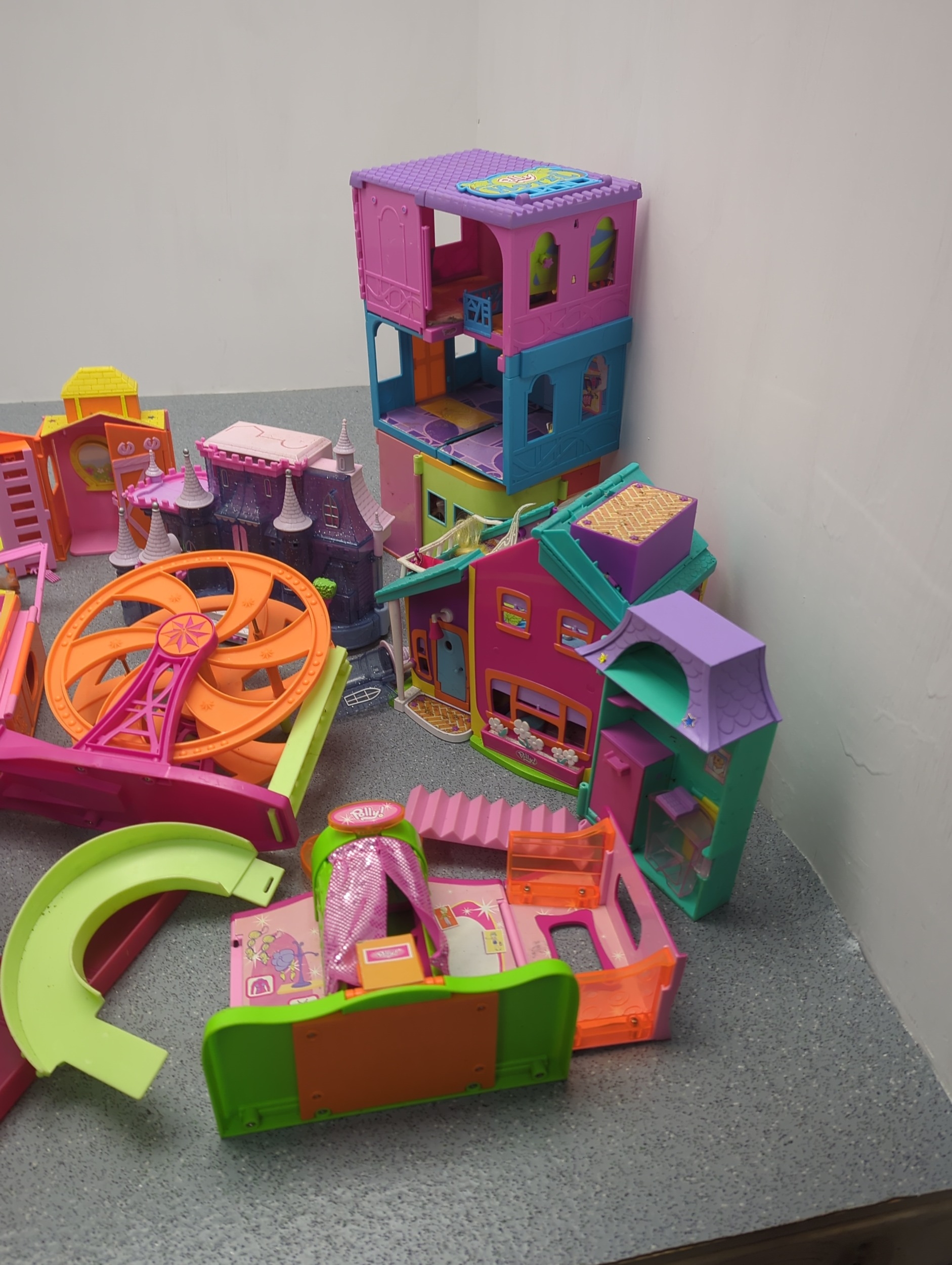 This collection features a colourful assortment of toy buildings and accessories, including plastic dollhouses and a variety of play pieces. The lot includes vibrant structures and moveable parts, providing ample opportunity for imaginative play. Additional items such as miniature furniture and decorative elements are included, stored in tins and containers.