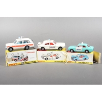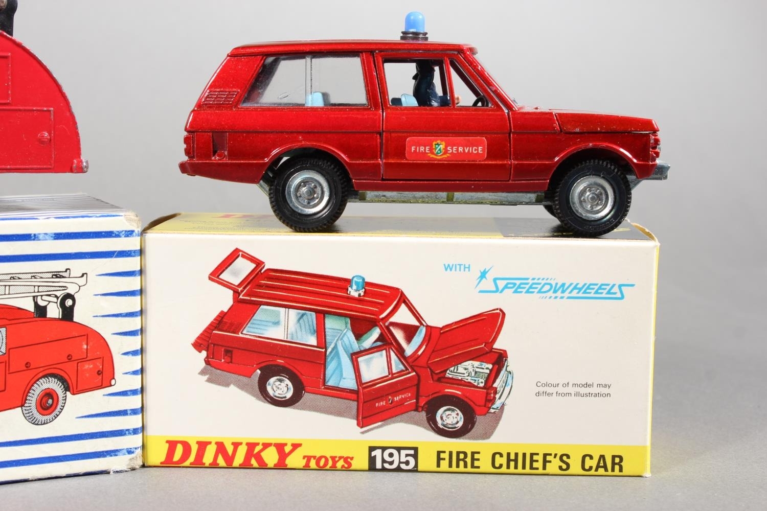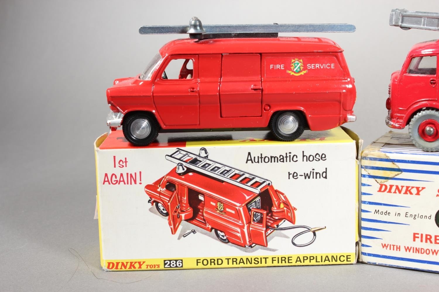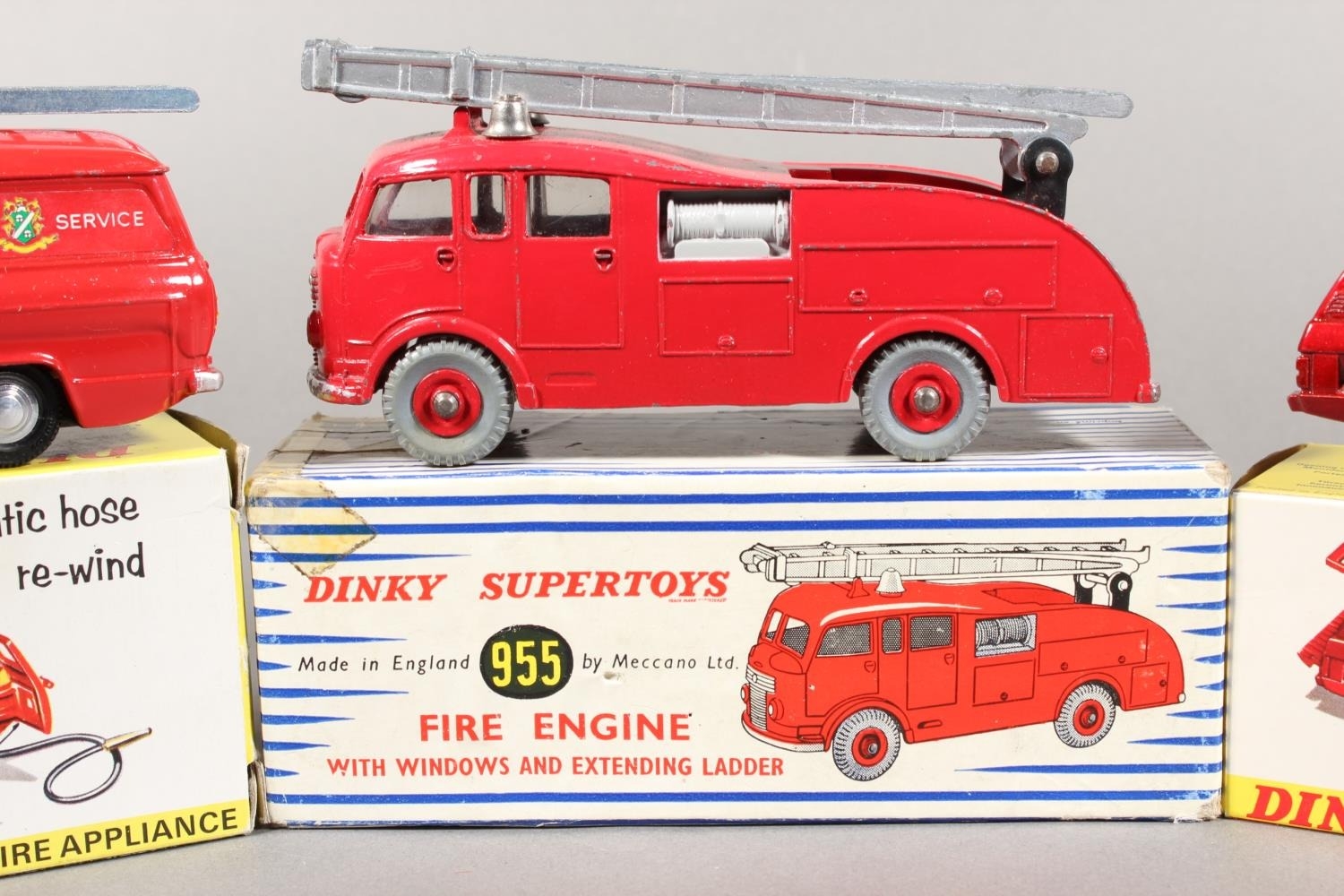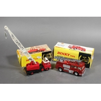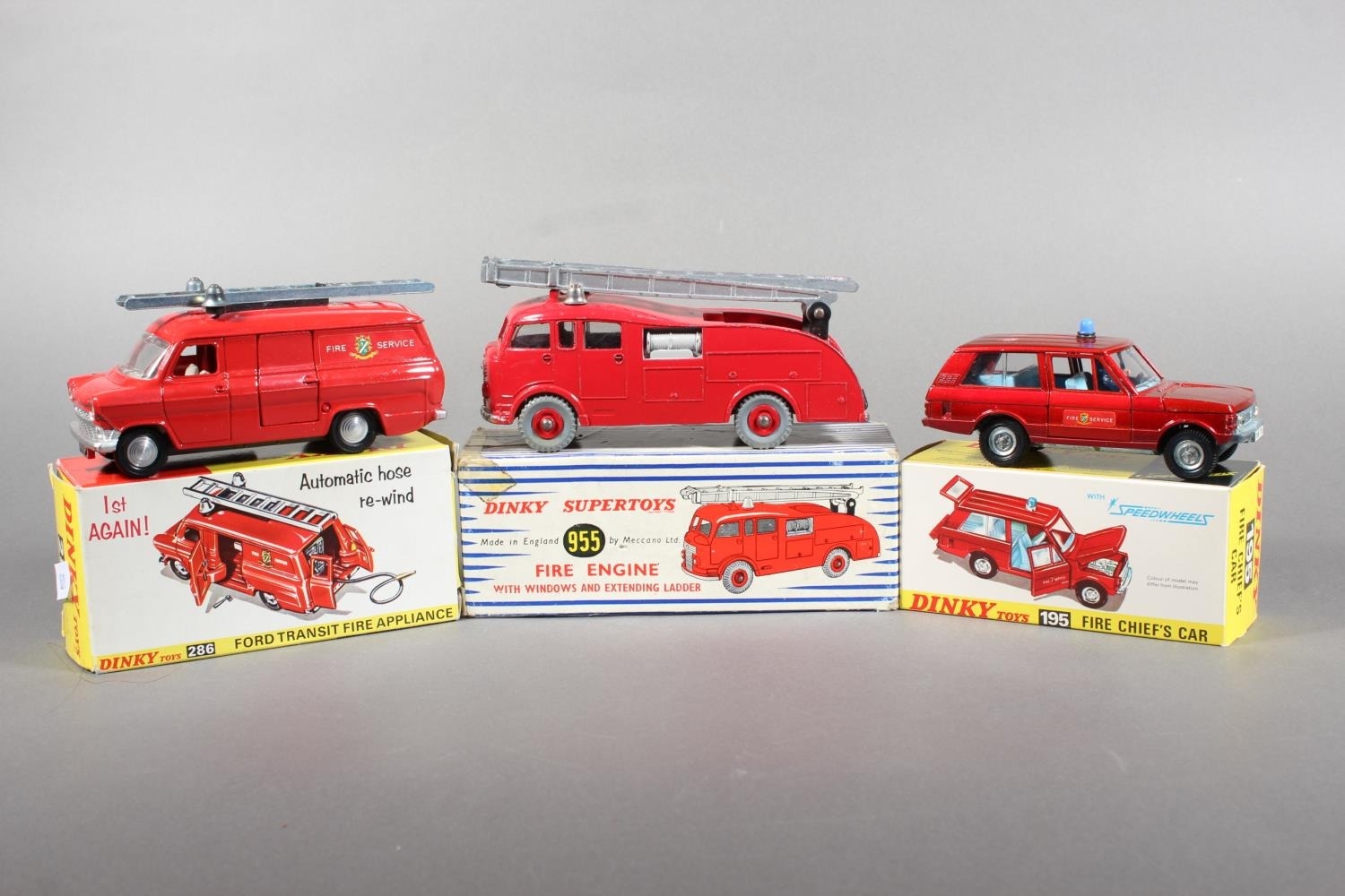 Dinky Toys diecast model vehicle 195 Fire Cheif's Car with Speedwheels, 286 Ford Transit Fire Appliance and Supertoys 955 Fire Engine, each boxed. (3)