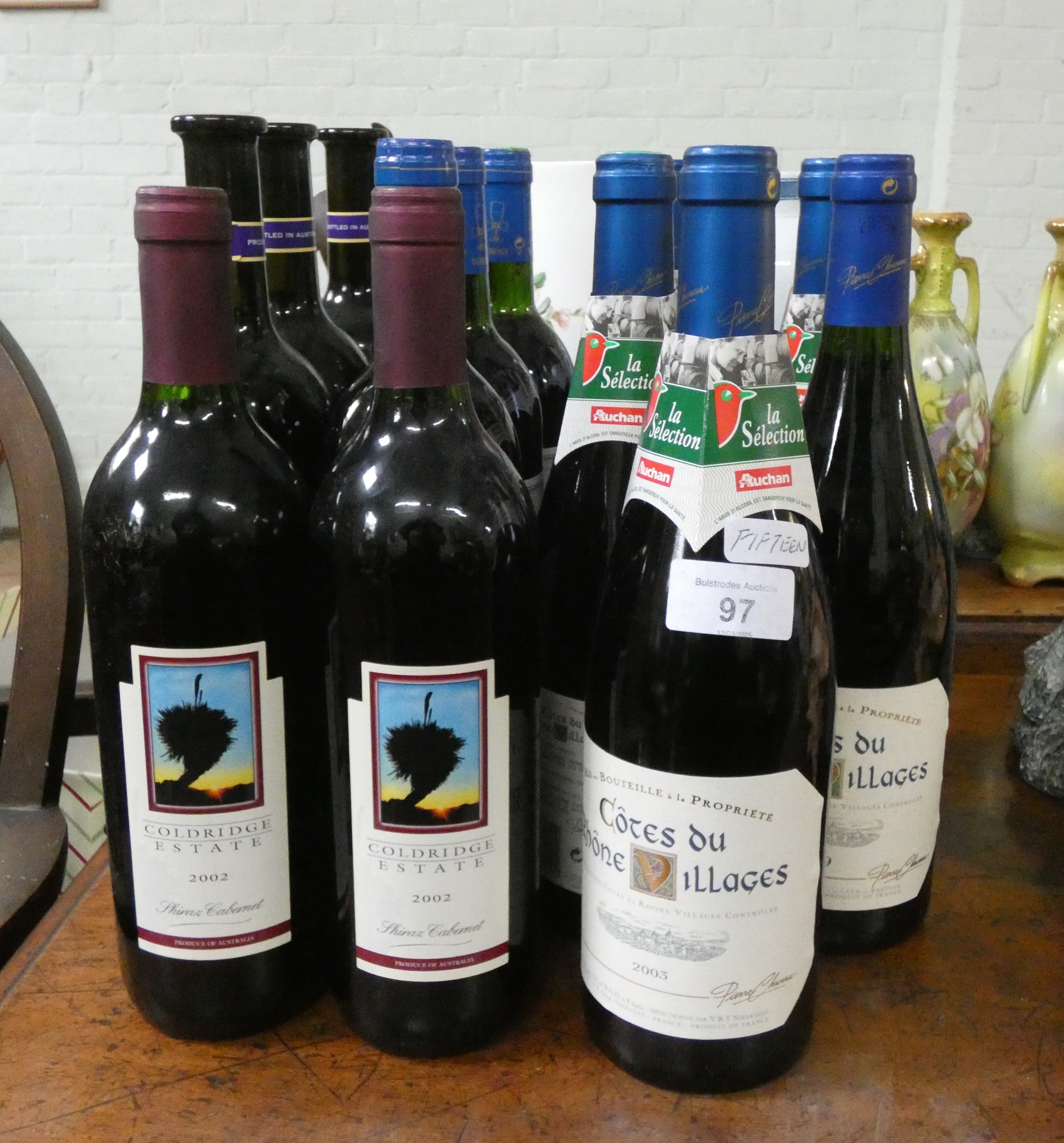 Seven bottles of Cotes-du-Rhone village's red wine and eight other bottles of red wine