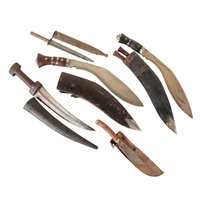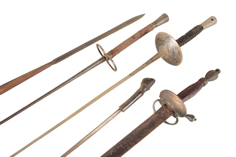 with a hardwood shaft and double-ended blades, 200cm long; two fencing foils; a dagger; and a Victorian style short sword (5)