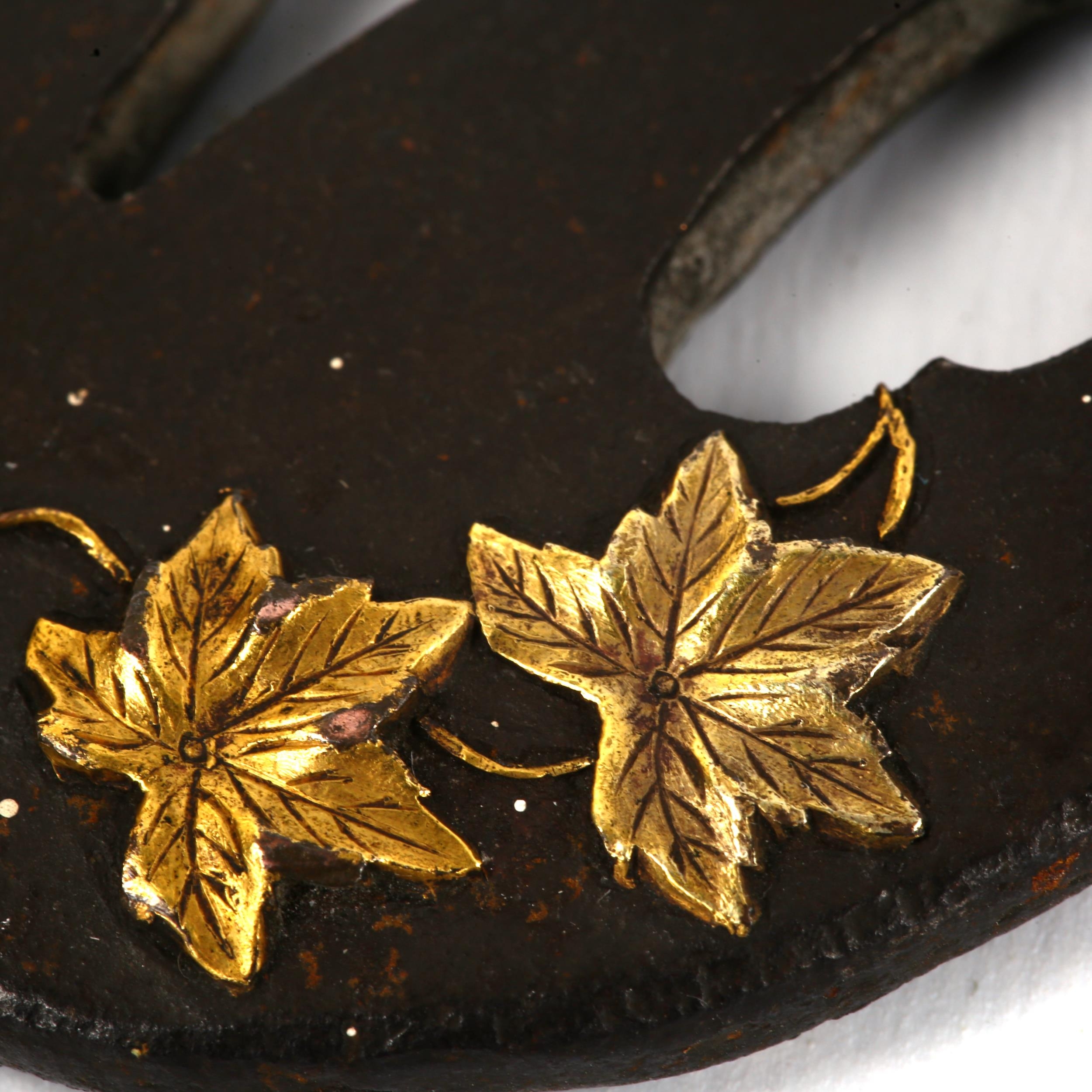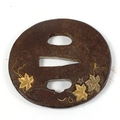 An Antique Japanese iron tsuba with parcel gilt relief vine leaves, length 6.5cm