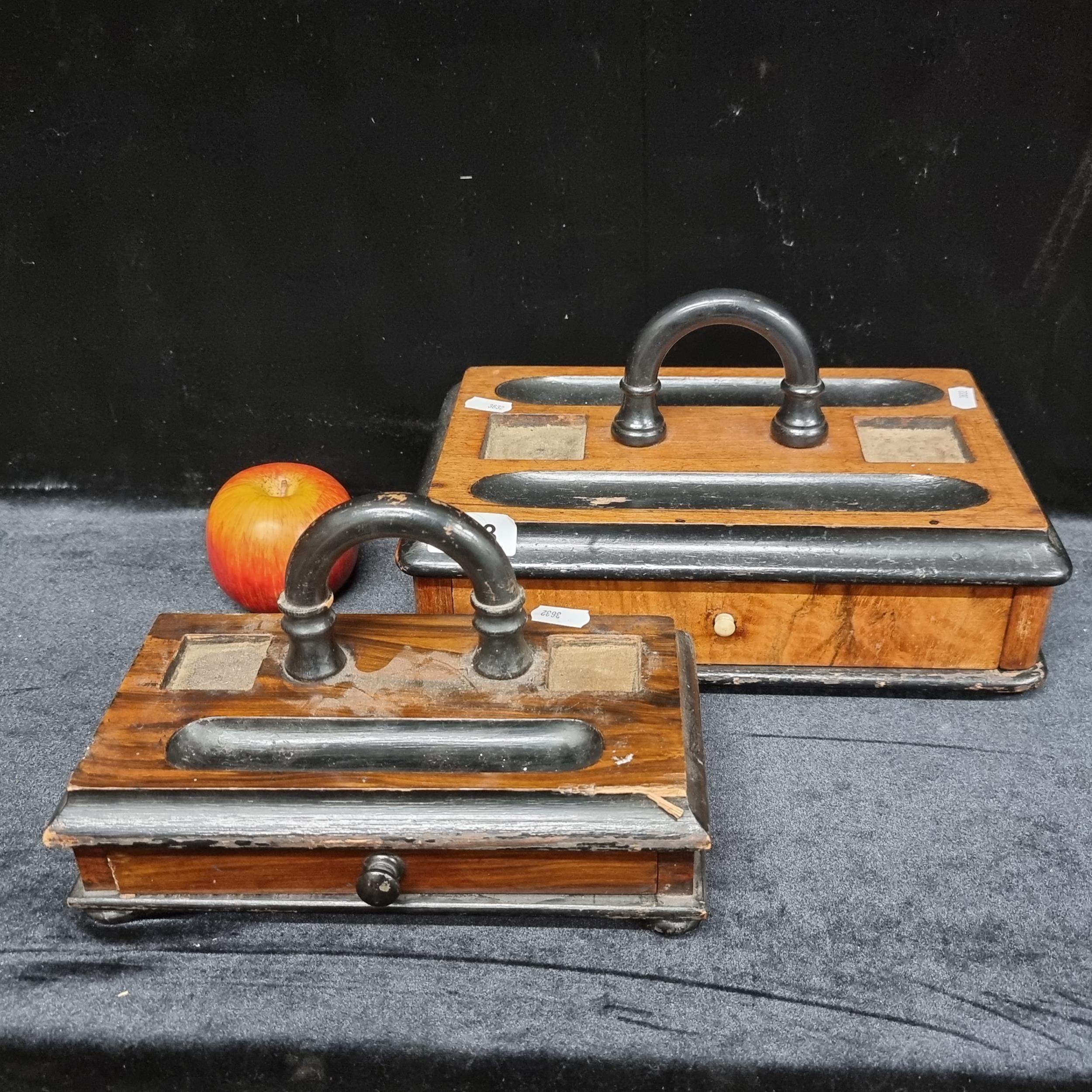 A pair of 1930's wooden stationary boxes, each with a pull out drawer, tube shaped handles and space for pens and inkwells, resting on four bun feet. Measuring: 30 cm X 20 cm and 24 cm X 13 cm