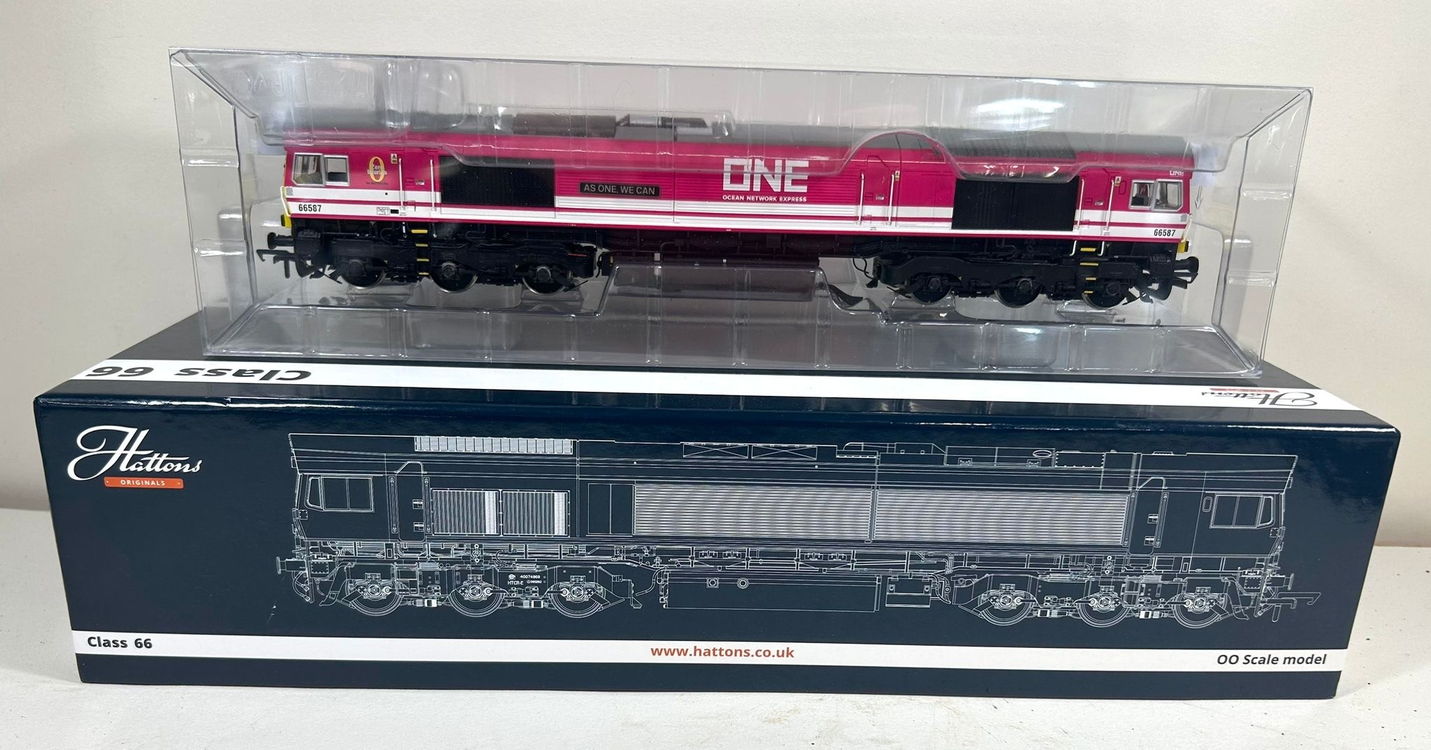 Hattons OO Gauge exclusive issue H4-66-037-S Co-Co pink with white stripes, Ocean network express (one) livery. Class 66 No.66587 "As One We Can". (mint condition). Boxed and complete with packaging.