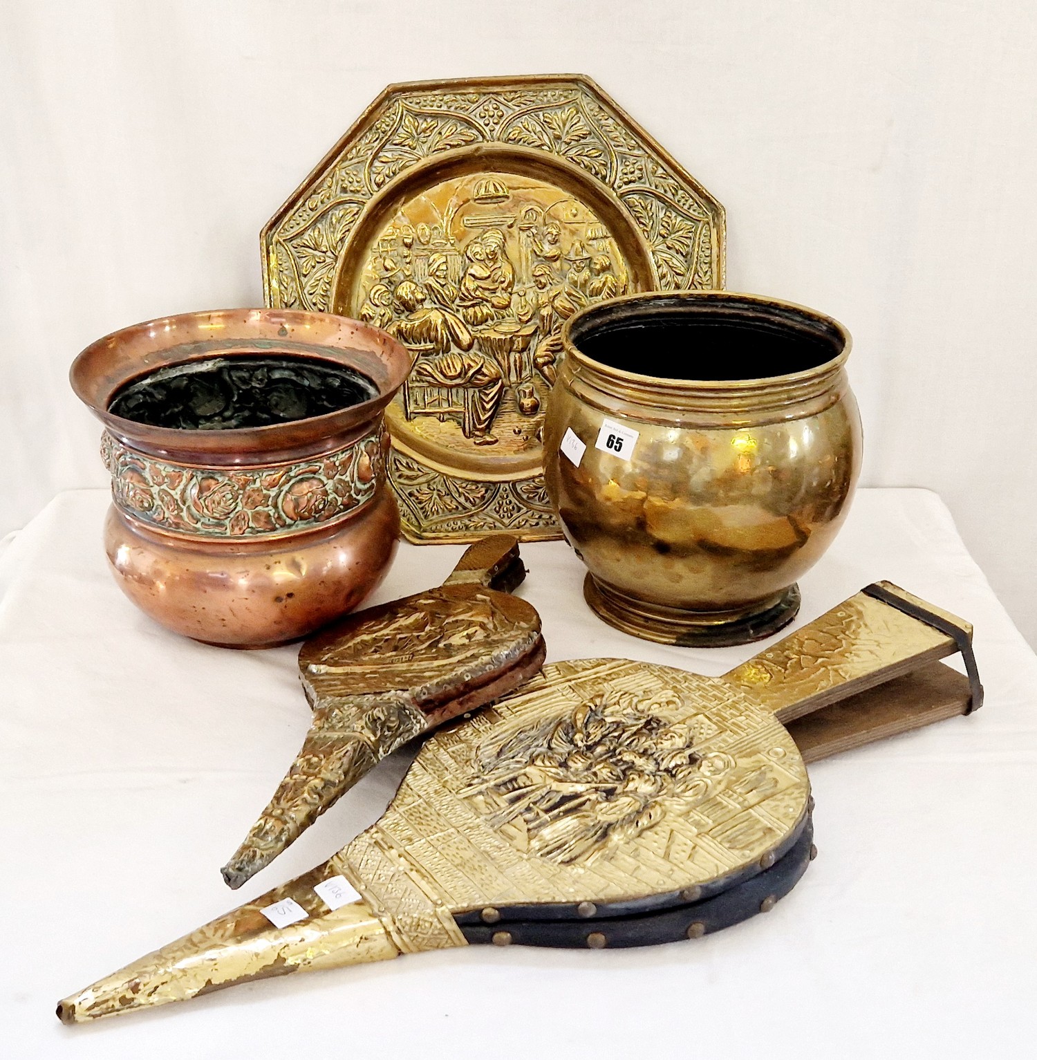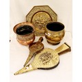 Qty of brass and copper ware incl. jardinières, plaque, bellows etc