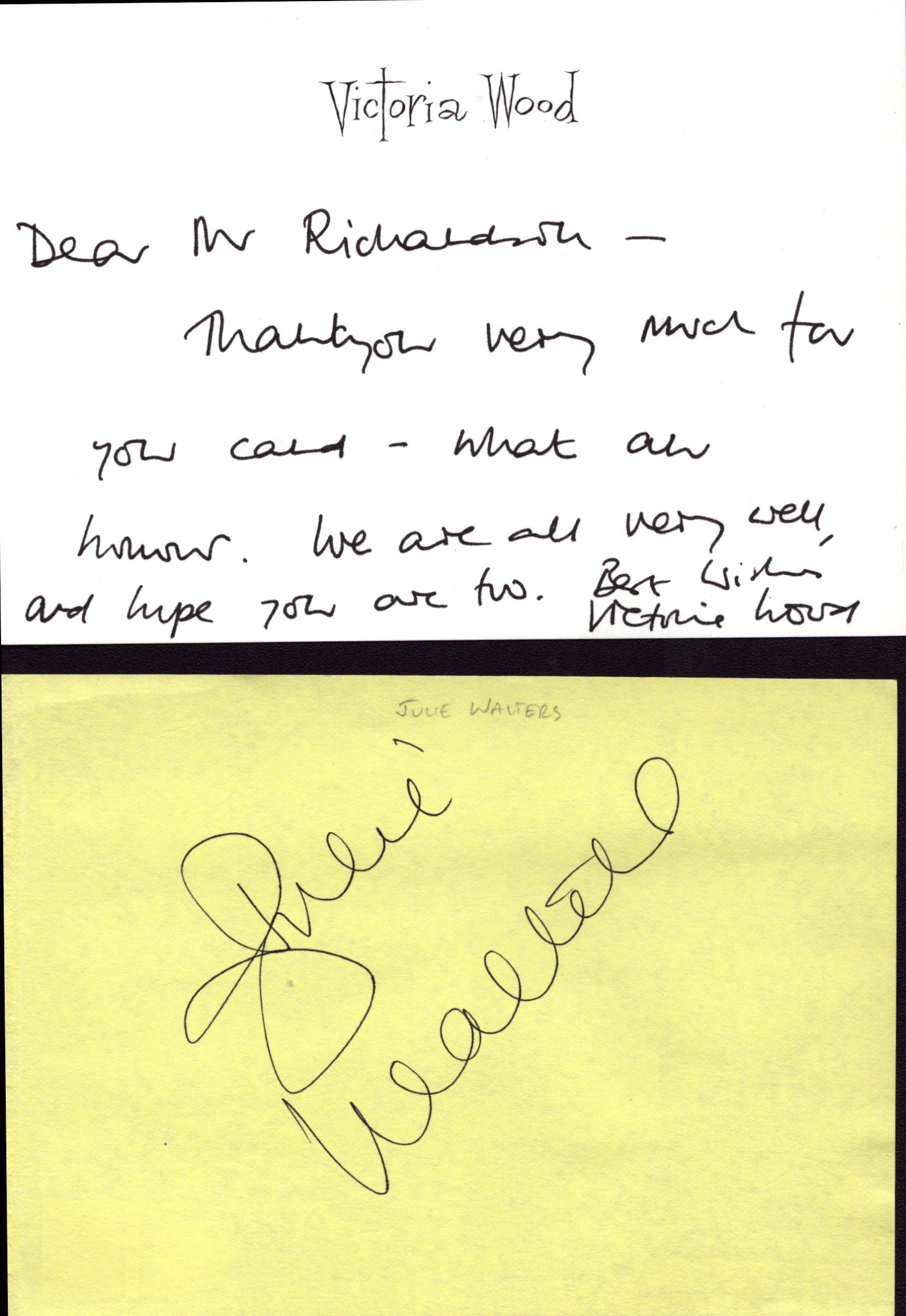 Julie Walters signature piece with a Victoria Wood dedicated signed note 6x4.