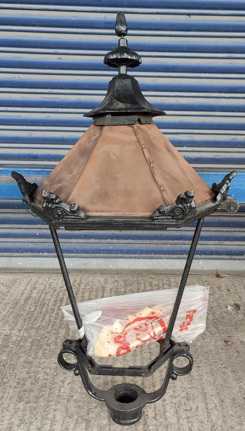 A large Victorian style street lantern top of cast metal and copper, glass missing height ...