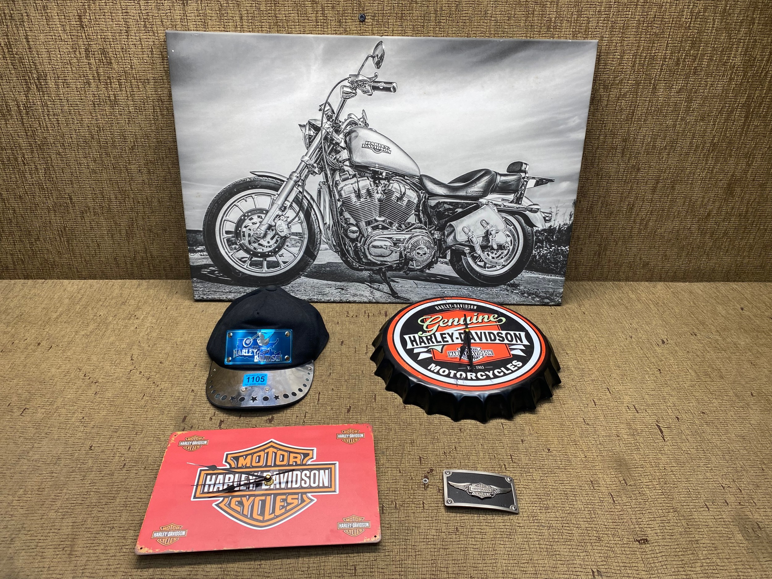Harley Davidson memorabilia including: Printed canvas, bottl...