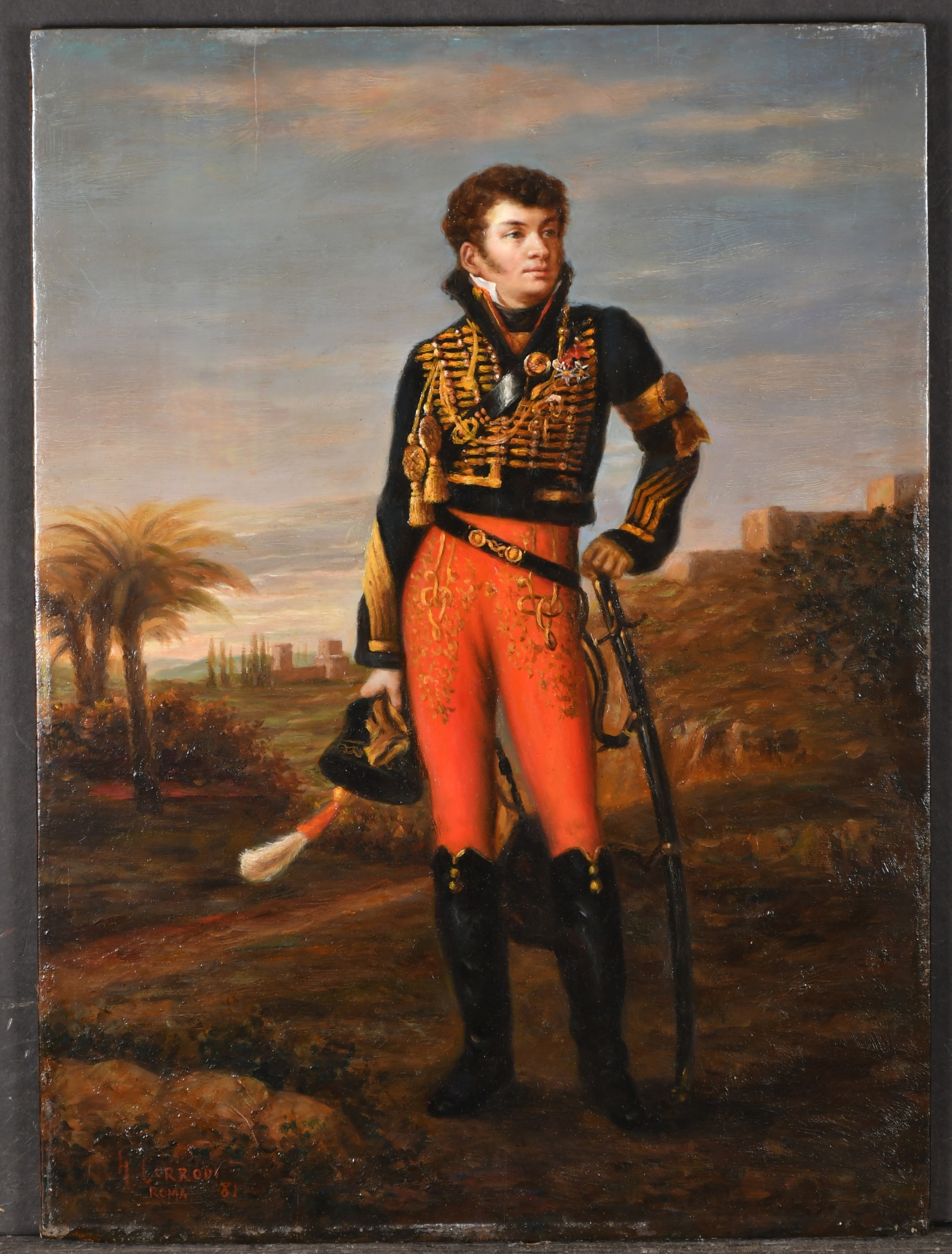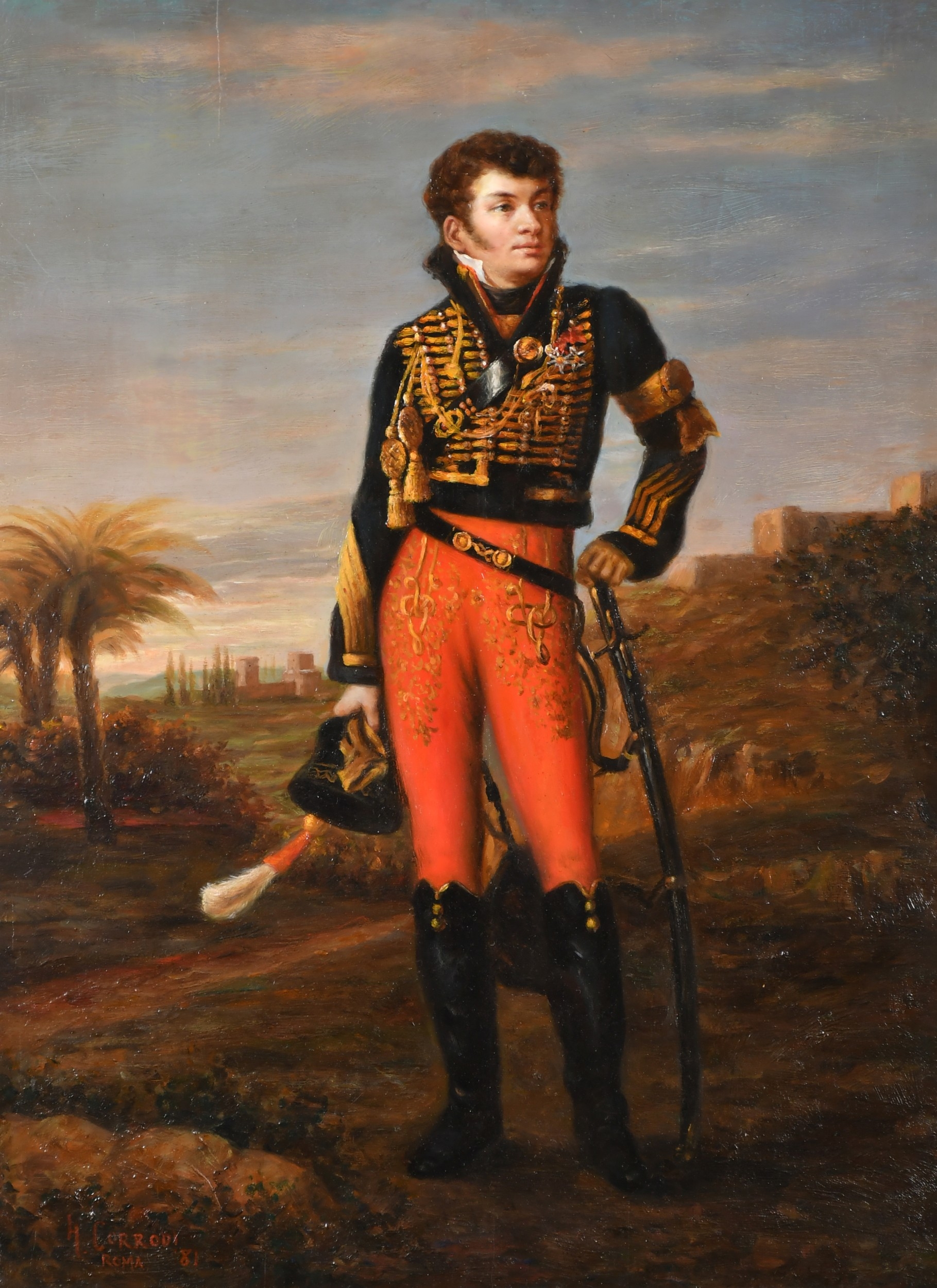 Hermann David Salomon Corrodi (1844-1905) Italian. Aide-de-Camp of Hussars, Oil on panel, Signed, inscribed 'Roma' and dated '81, unframed 18" x 12.8" (45.7 x 32.5cm)