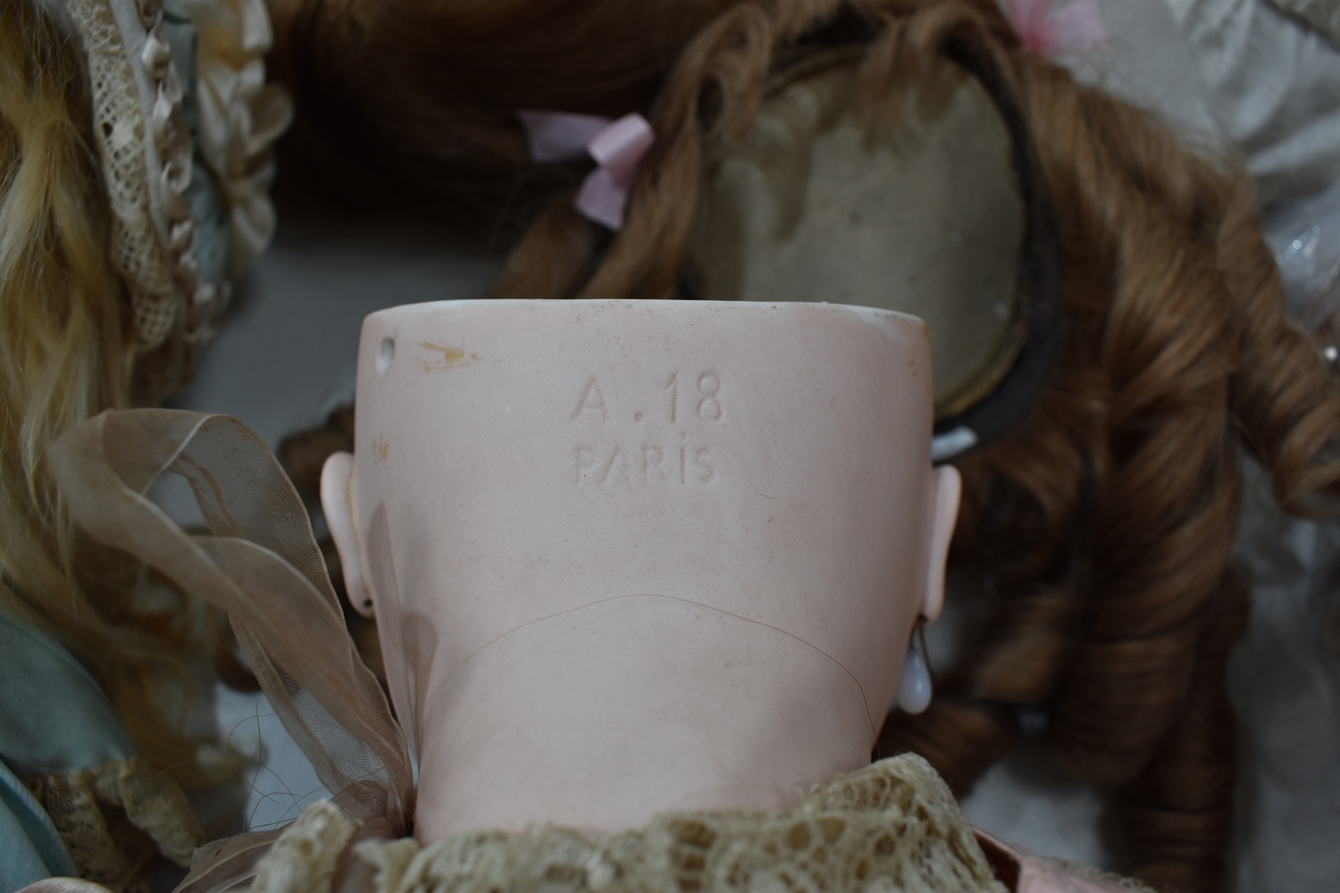 A French bisque porcelain head doll, marked A 18. Paris to the back of the head, with composition articulated limbs and body, blue/grey glass sleepy eyes, 64cm long.