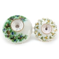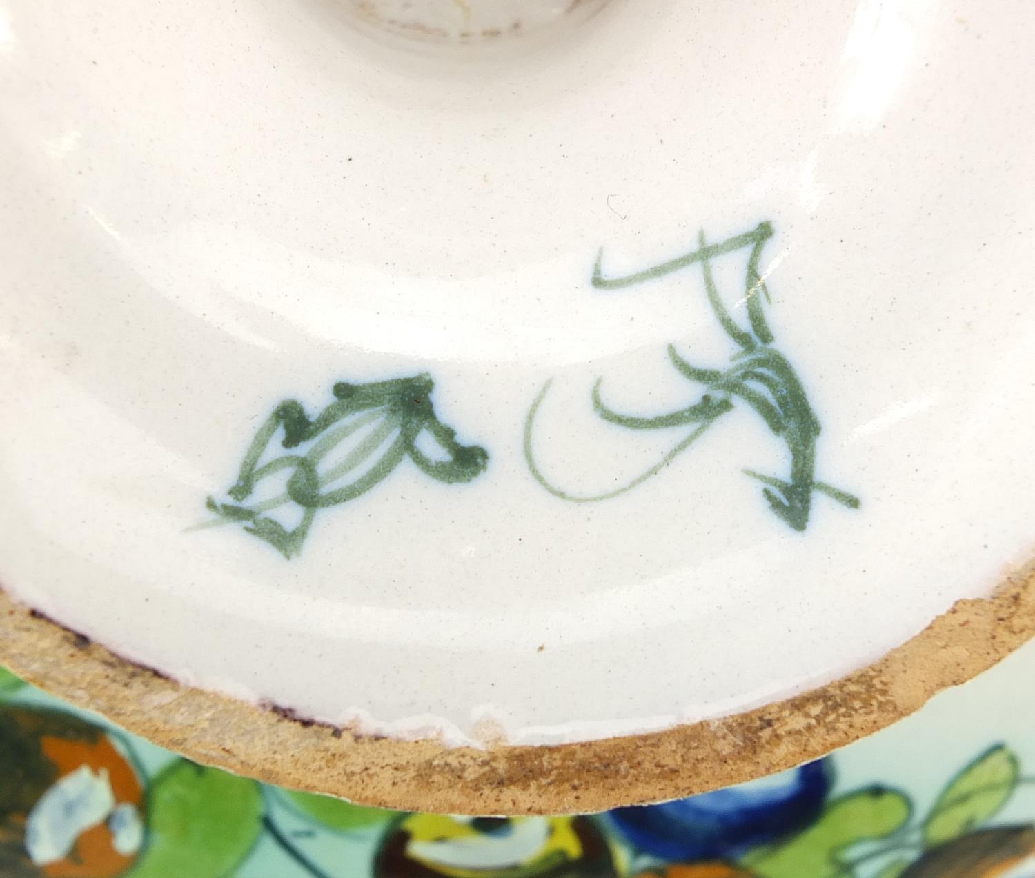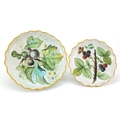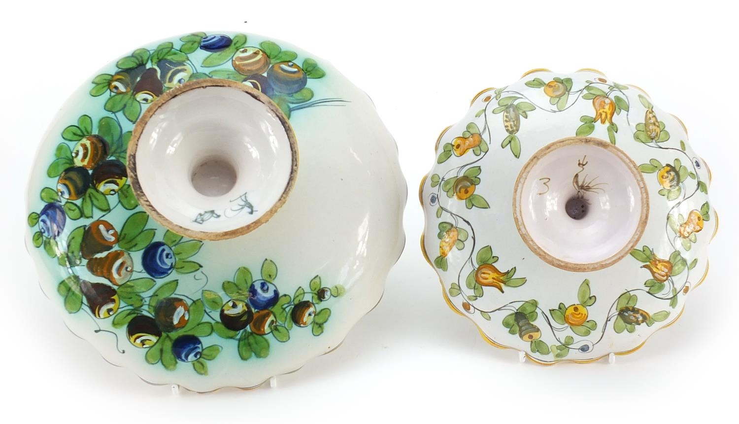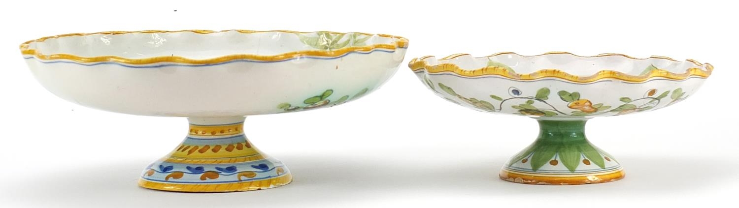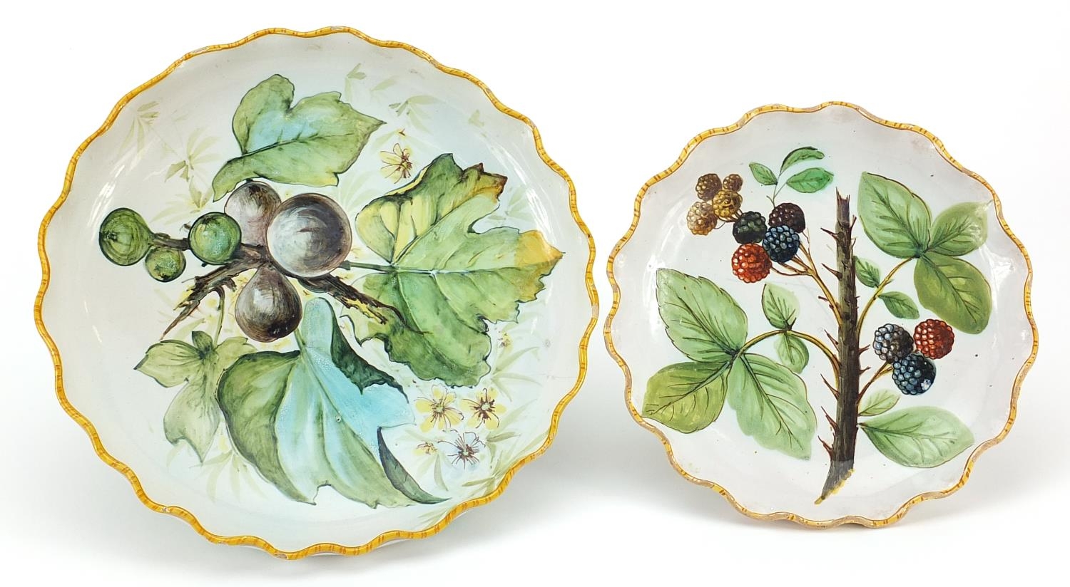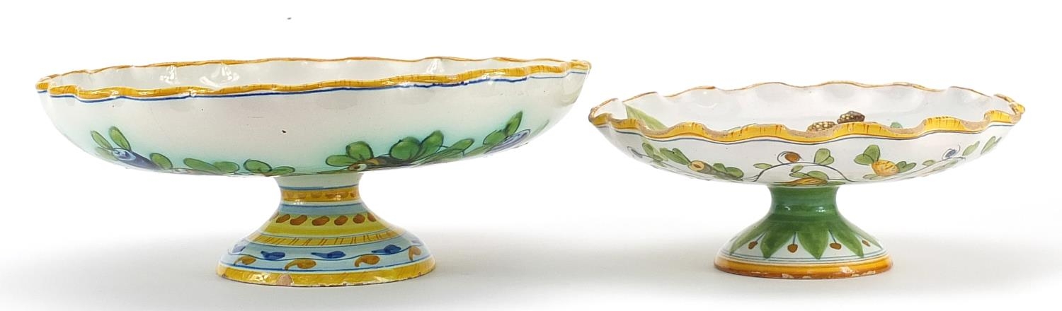 Cantigalli, two Italian Maiolica pedestal dishes hand painted with leaves and berries, the largest 25cm in diameter