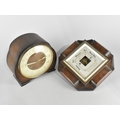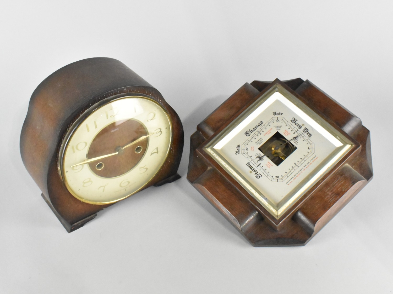 A Vintage Smith Oak Cased Mantel Clock and an Oak Framed Aneroid Barometer, Missing Glass