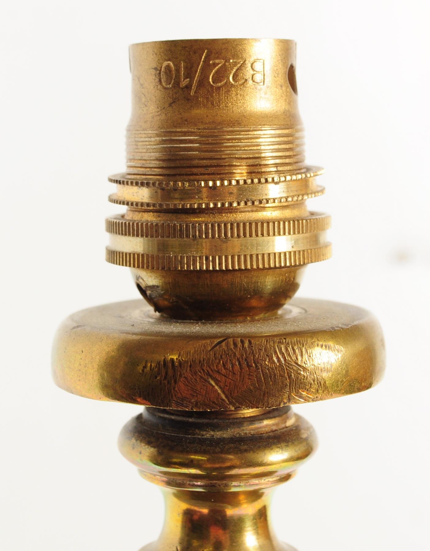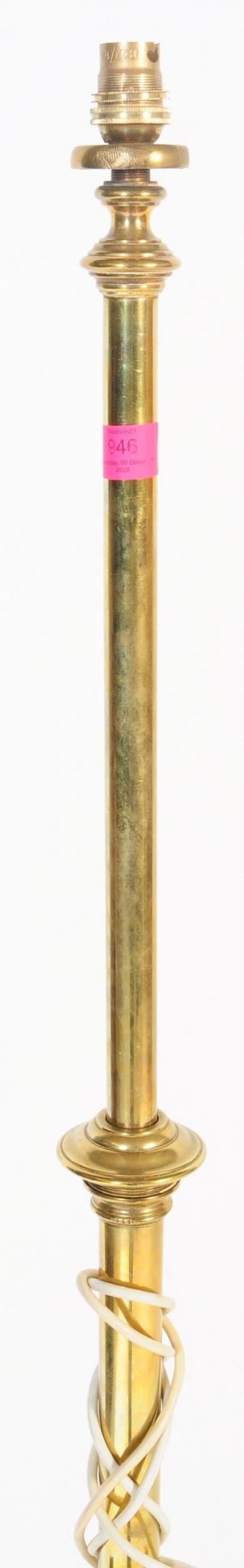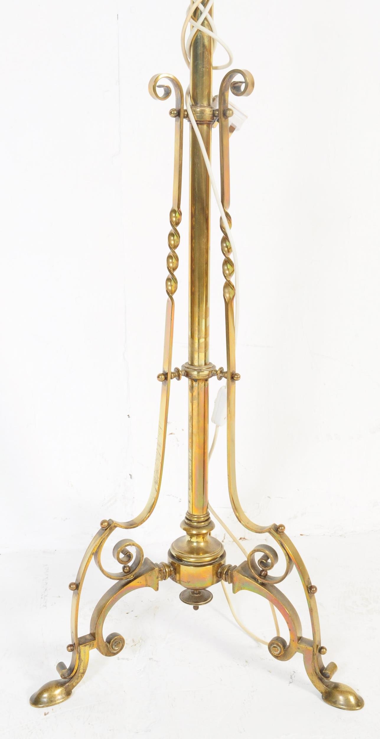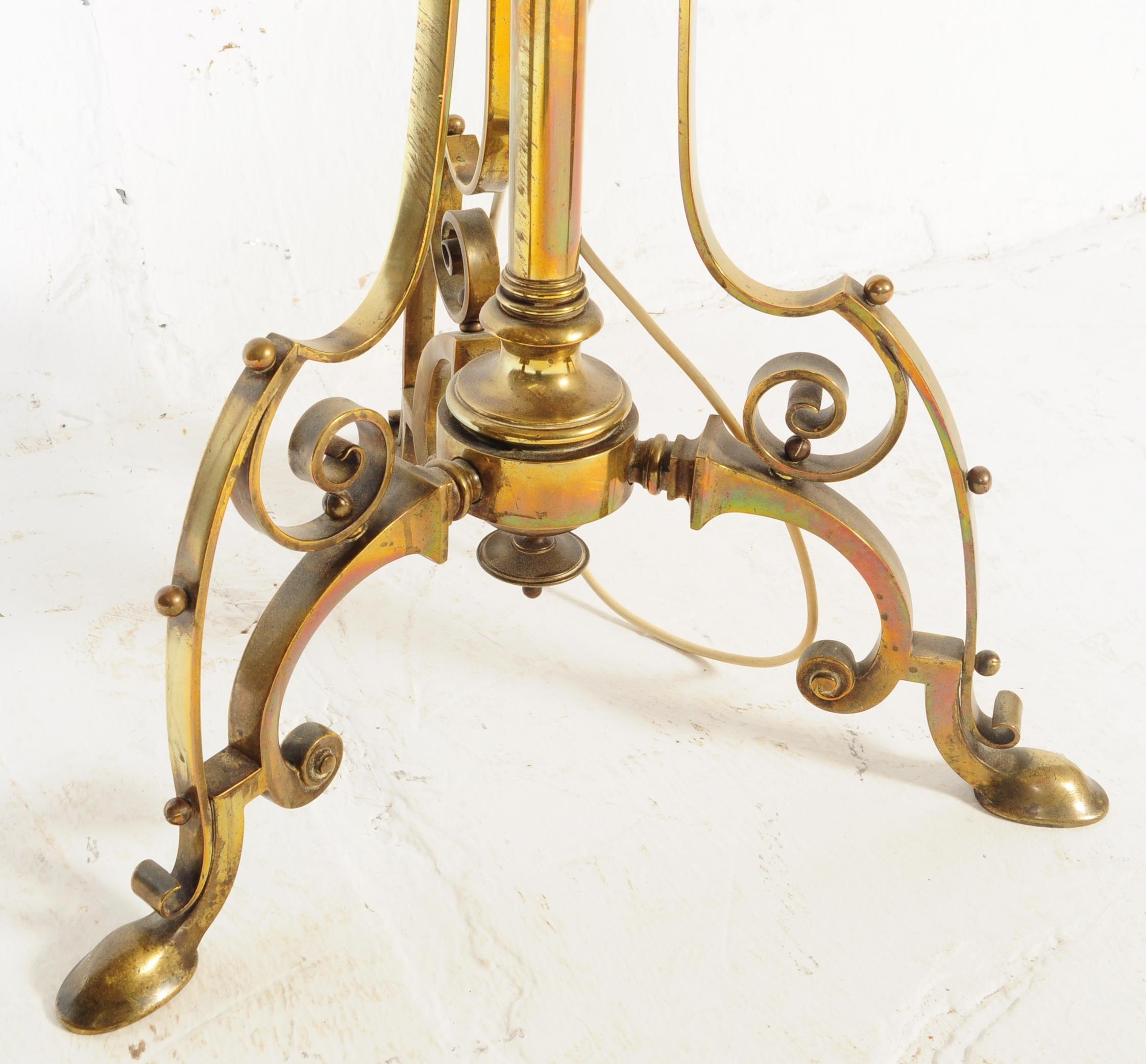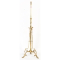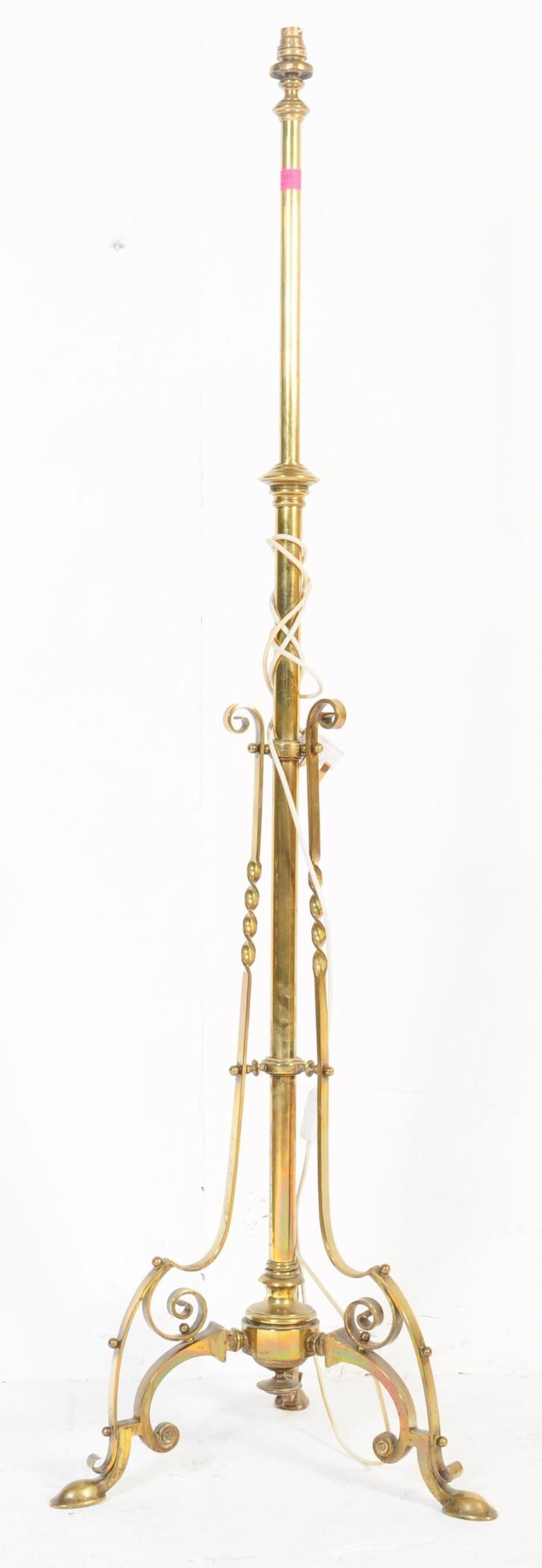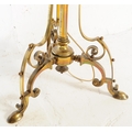 A 19th century Victorian converted brass standard lamp. The lamp with hoof feet to splayed legs with wrought rococo brass c-scroll terminal supports with large central upright. Later converted to electrics. Measures approx 152cm x 46cm x 46cm.