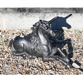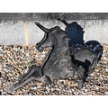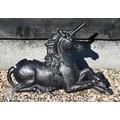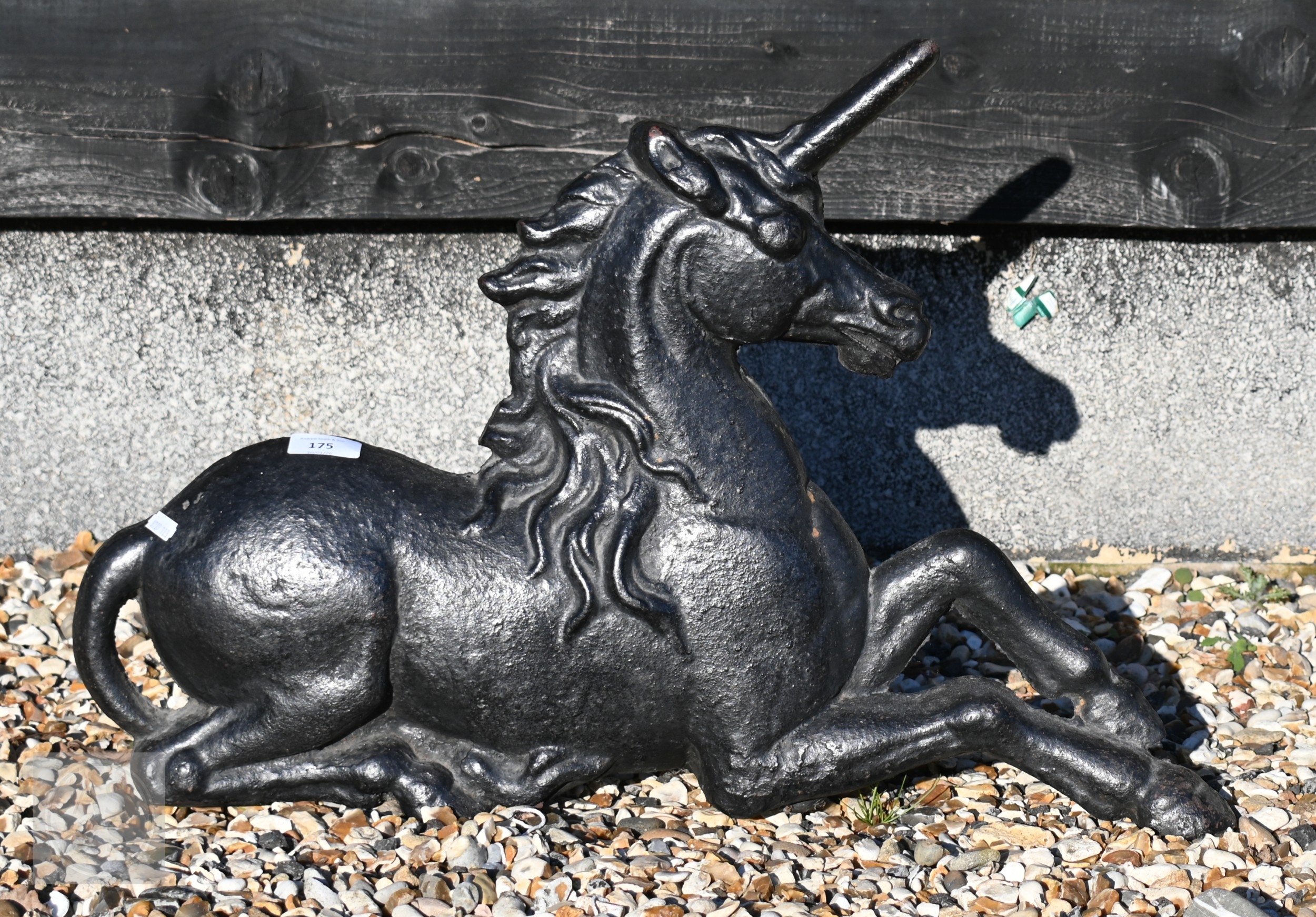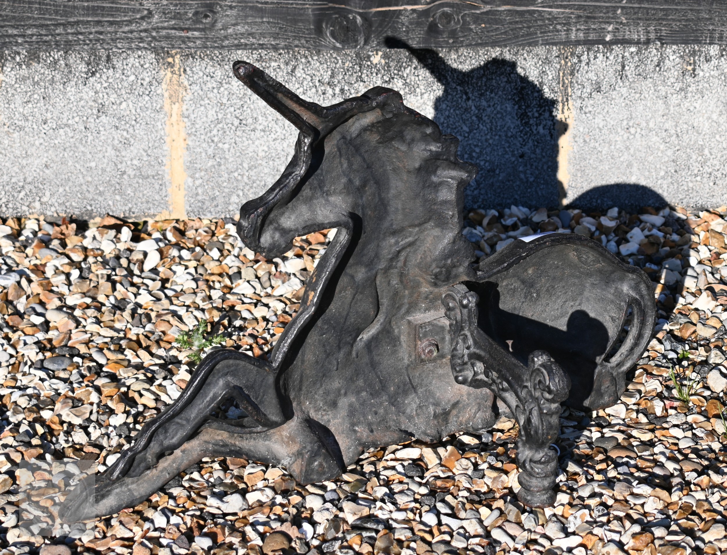 A large old cast iron fire chenet in the form of a recumbent unicorn, finished in black, 63 cm long x 42 cm h