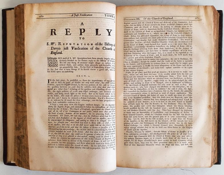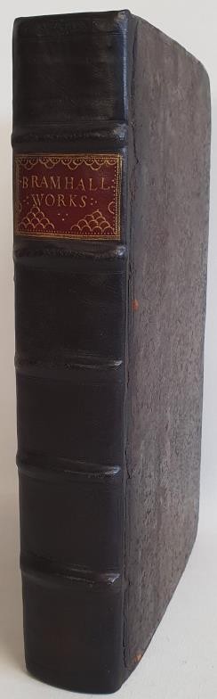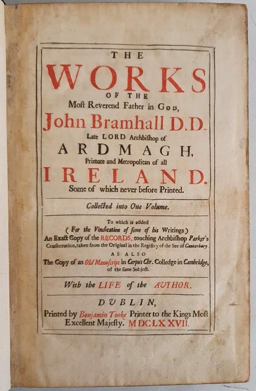 BRAMHALL, John. The Works of the Most Reverend Father in God, John Bramhall D.D. Late Lord Bishop of Ardmagh, Primate and Metropolitan of all Ireland. Some of which never before Printed. Collected into One Volume. To which is added (For the Vindication of some of his Writings) An Exact Copy of the Records, touching Archbishop Parker's Consecration, taken from the Original in the Registry of the See of Canterbury. As also The Copy of an Old Manuscript in Corpus Chr. Colledge in Cambridge, of the same Subject. With the Life of the Author. Dublin: Printed by Benjamin Tooke Printer to the Kings Most Excellent Majesty, 1677. Folio. Titlepage printed in red and black with double-ruled border. Contemporary full calf, spine sympathically rebacked. Title in gilt on original red morocco letterpiece; corners restored; new endpapers. Very good.