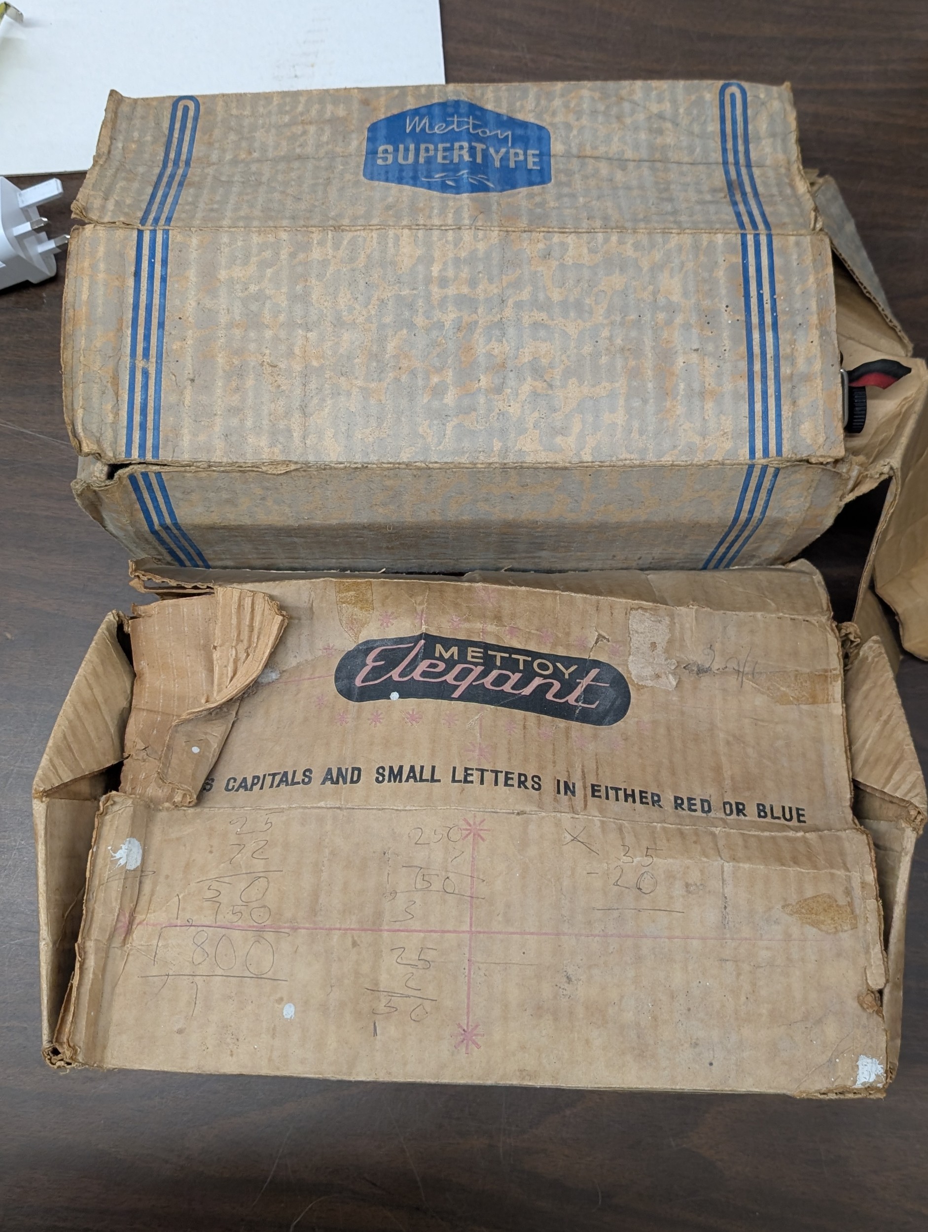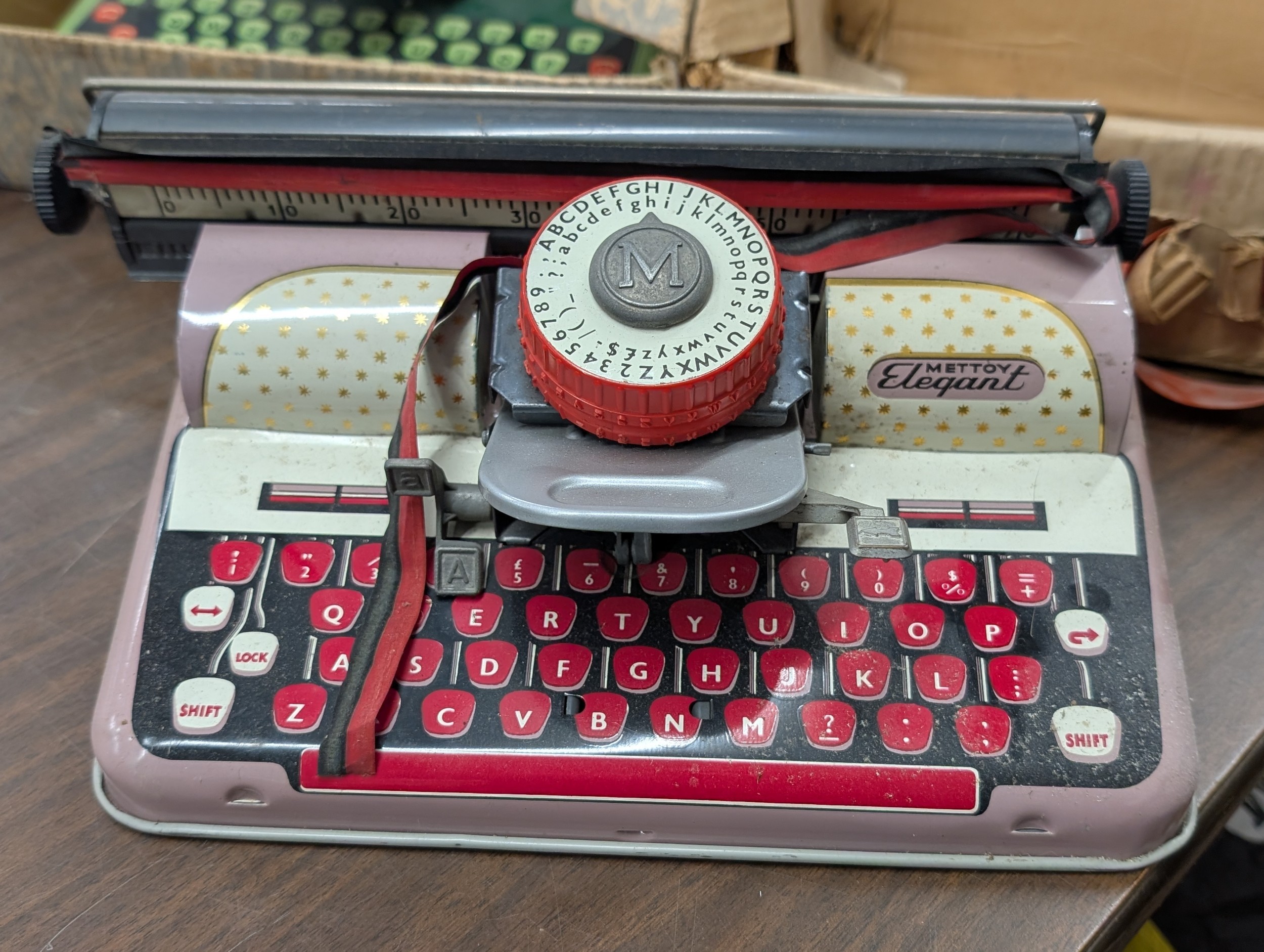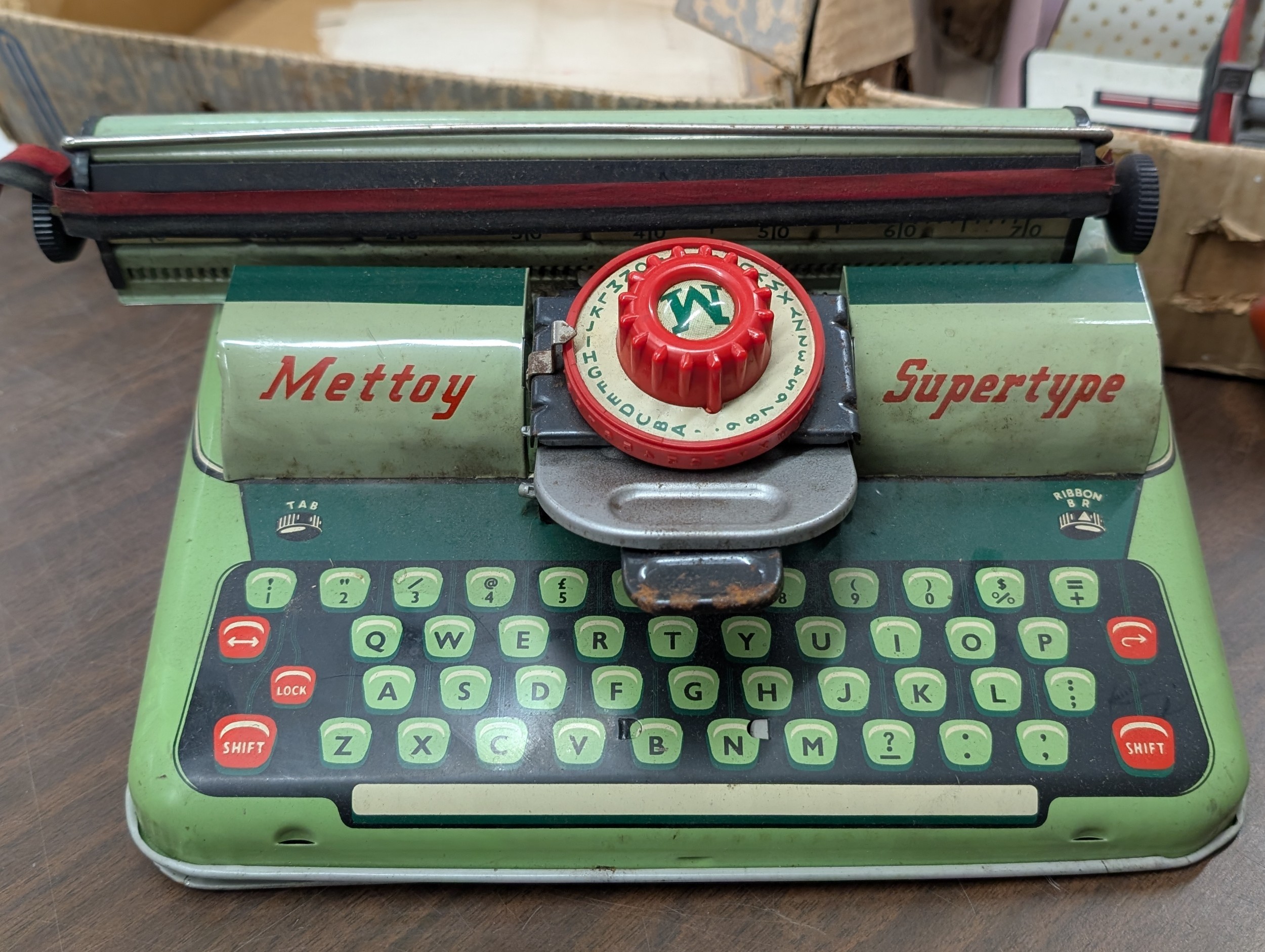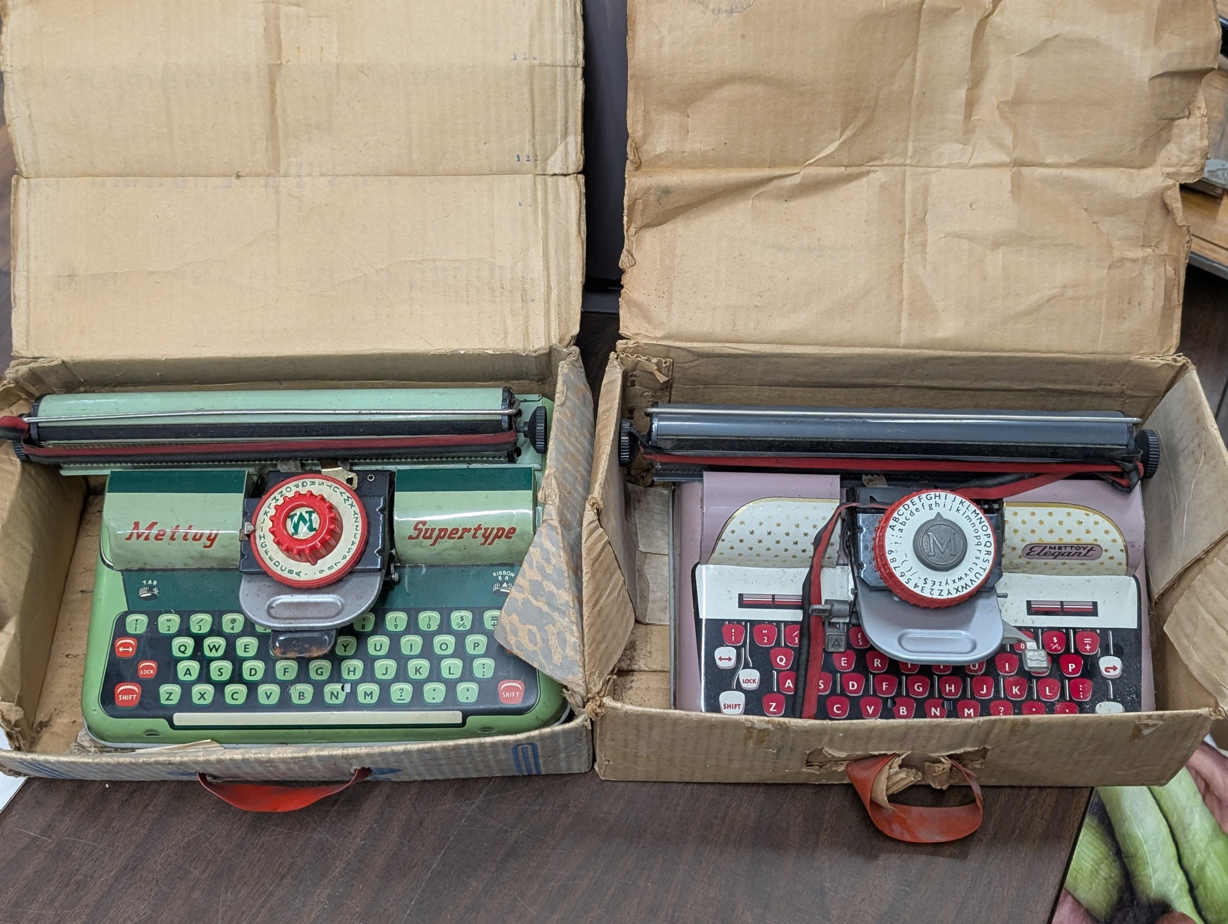 A Pair of Mettoy Supertype and Elegant Tinplate Toy Typewriters, circa 1950s With Original Packaging