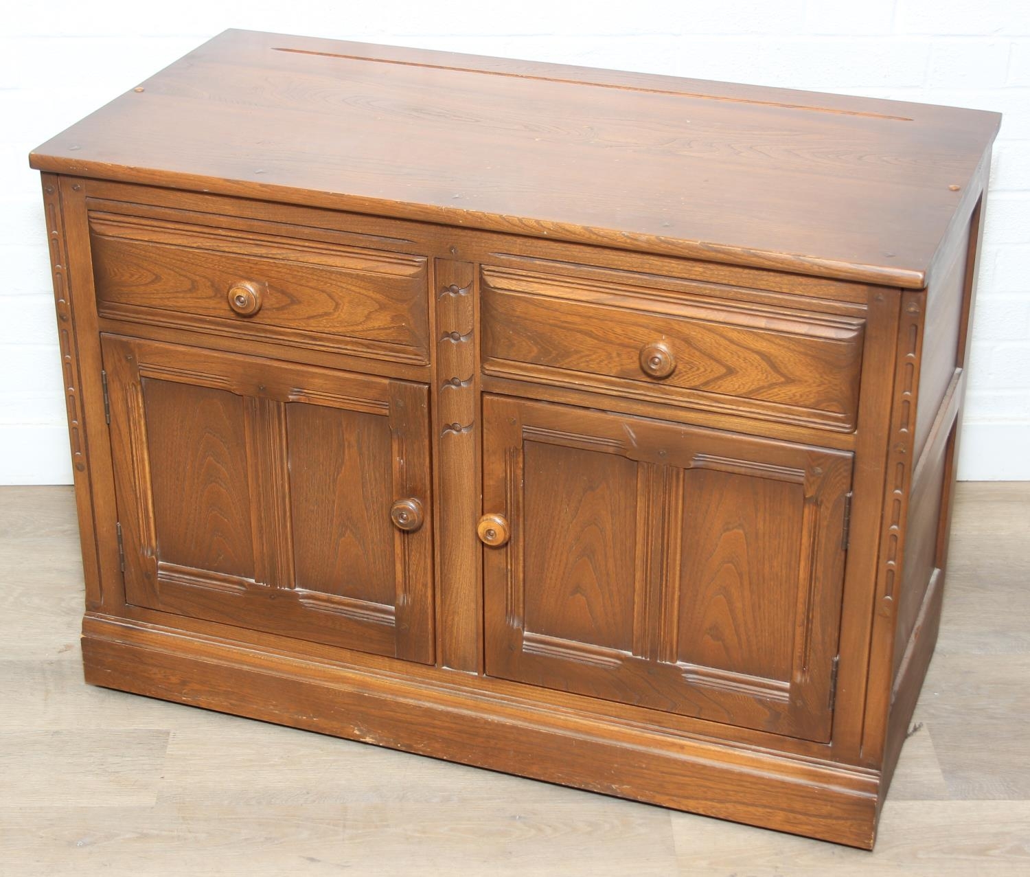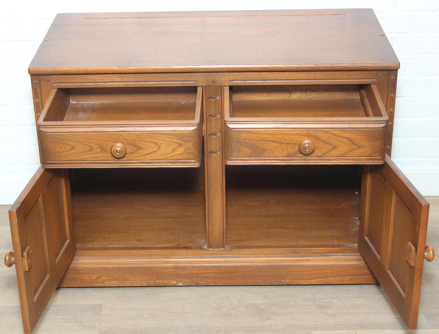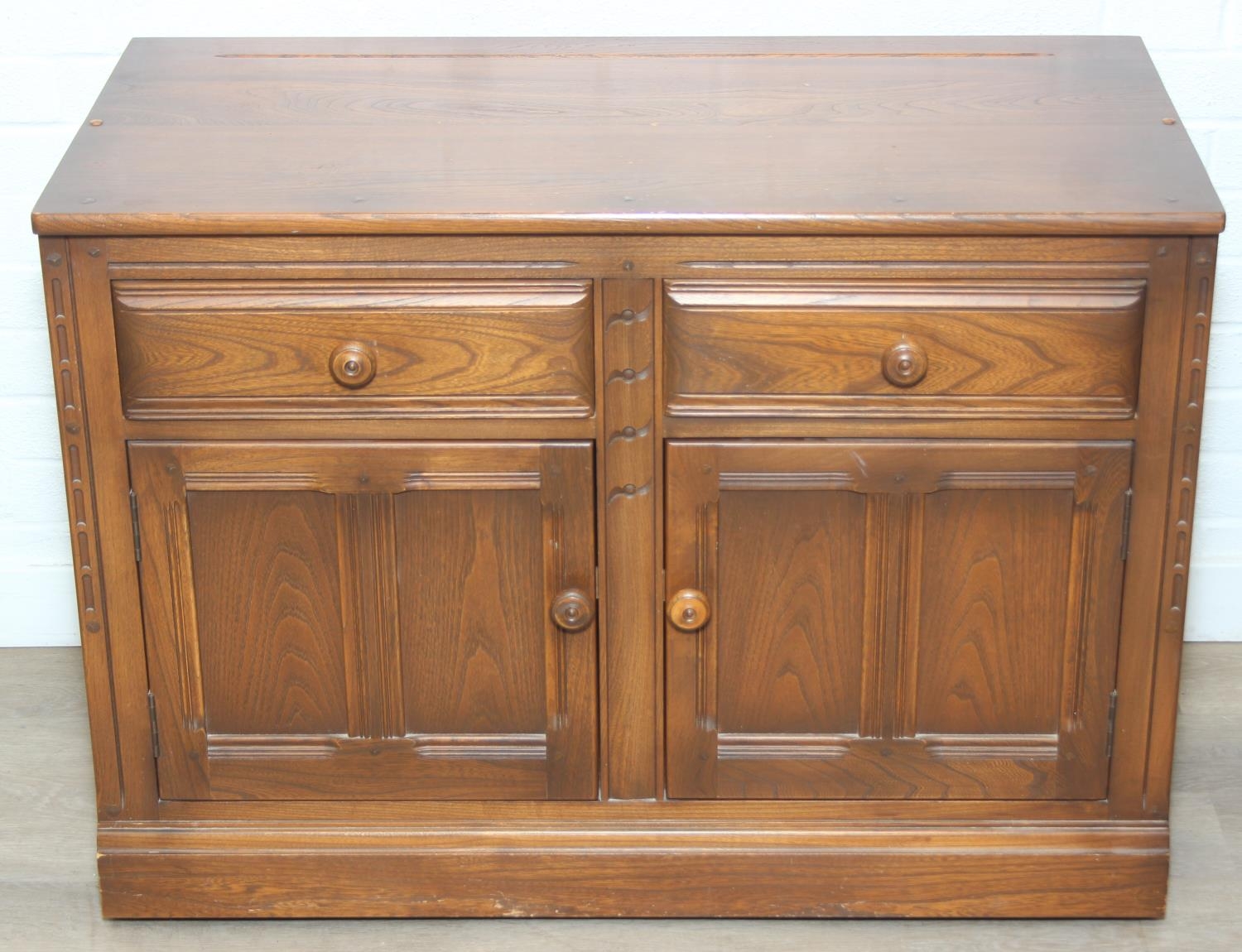 Small Ercol elm sideboard comprising two drawers over two cupboards, 98cm x 50cm x 71cm