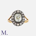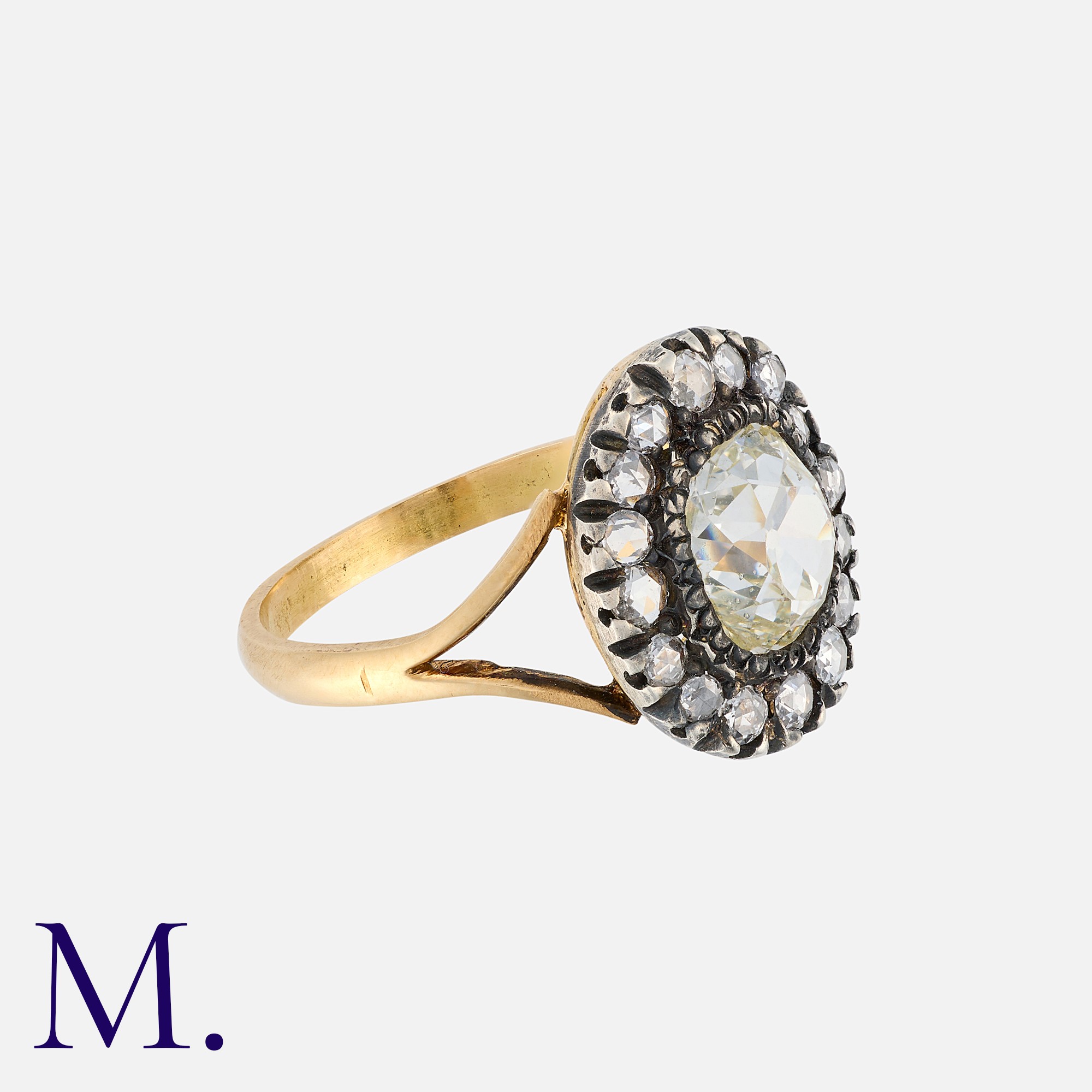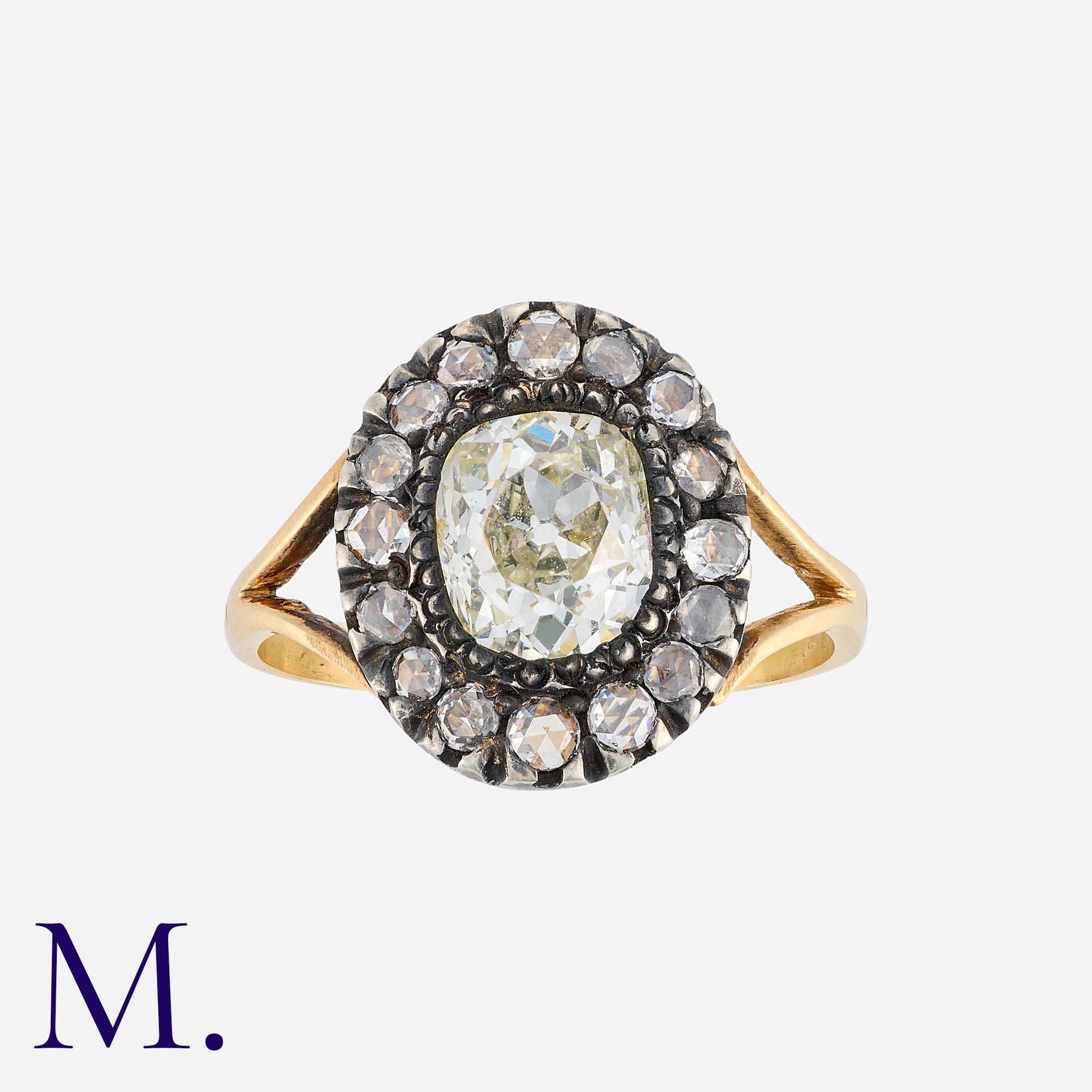 An Old Cut Diamond Cluster Ring, in yellow gold and silver, set with a principal old cut diamond of approximately 1.15 carats, within a border of rose cut diamonds, to a bifurcated shank. Unmarked, tests indicate 18 carat gold and silver.