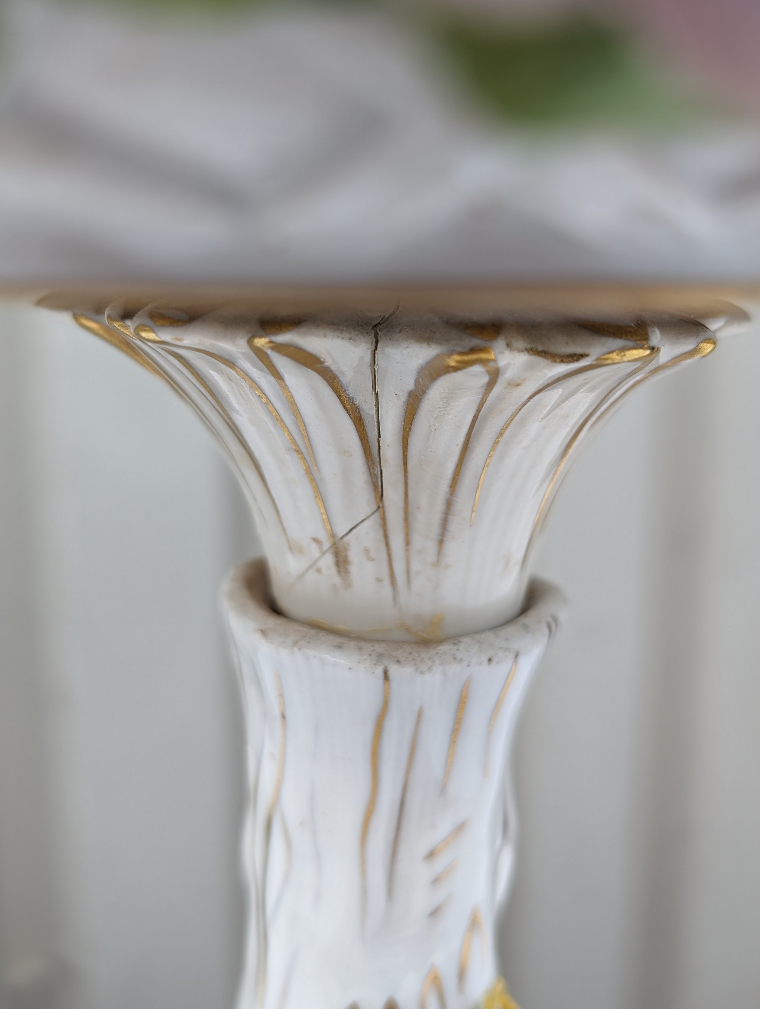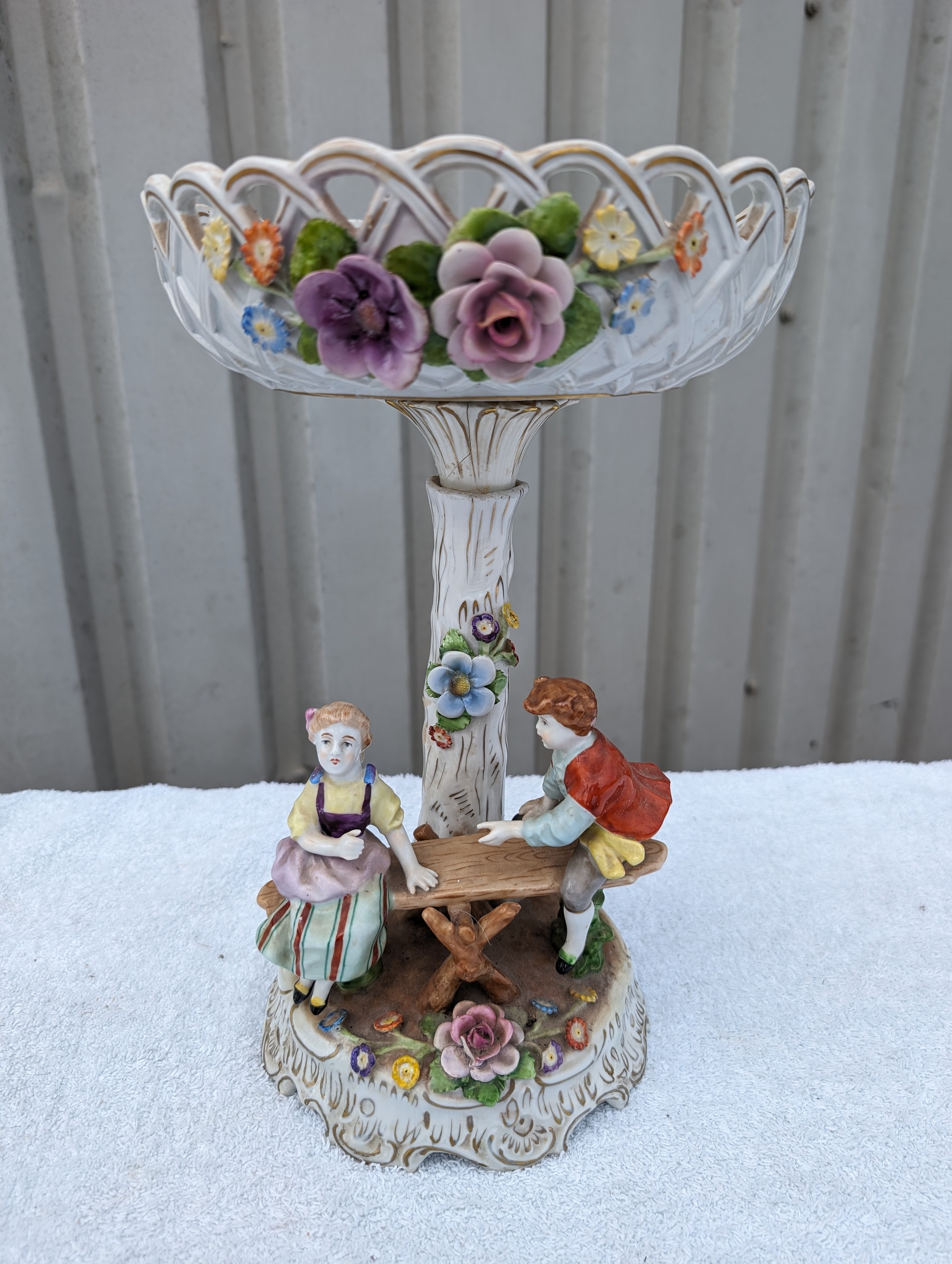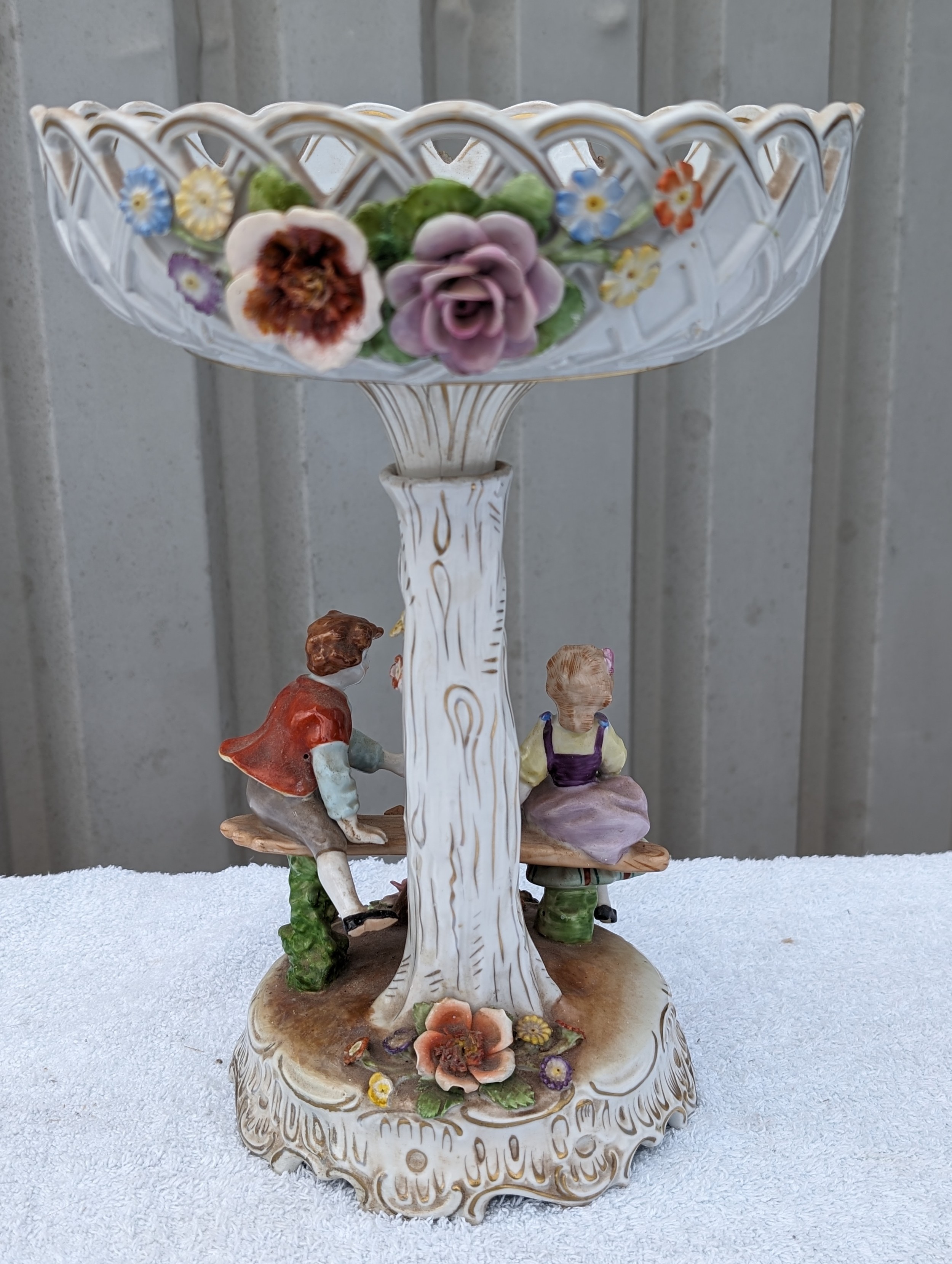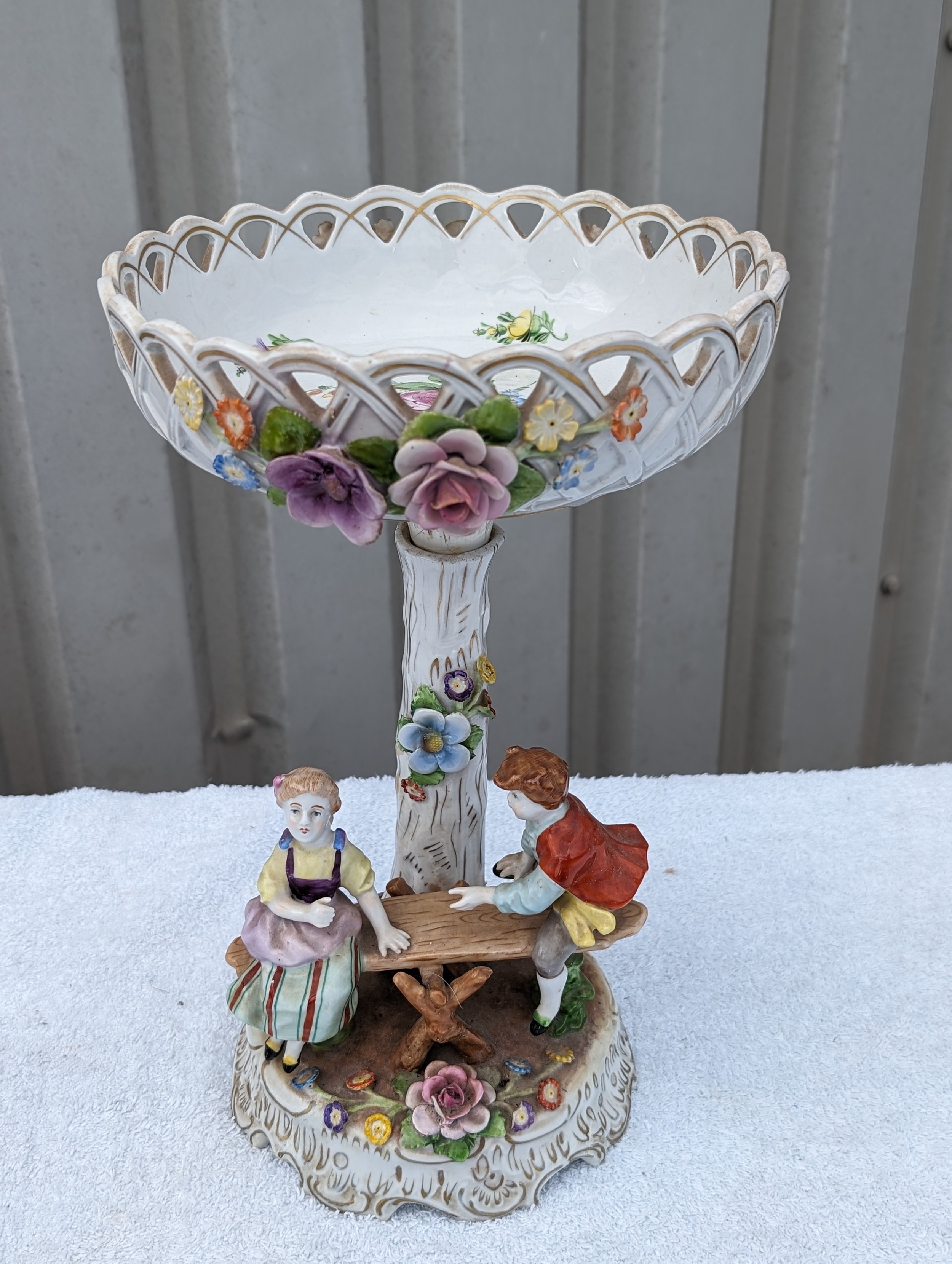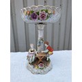 Large Vintage PMP Shierholz Plaue Porcelain Centrepiece Bowl, With Excellent Hand Painted Figures and Floral Design Throughout. Some Very Minor Losses to The Odd Petal But Very Minimal Considering Delicacy. Small Crack Extending Appx 1.5" Down Stem Beneath Bowl. Doesn't Appear to Affect structure, Wonderful Looking Piece. 34x20cm