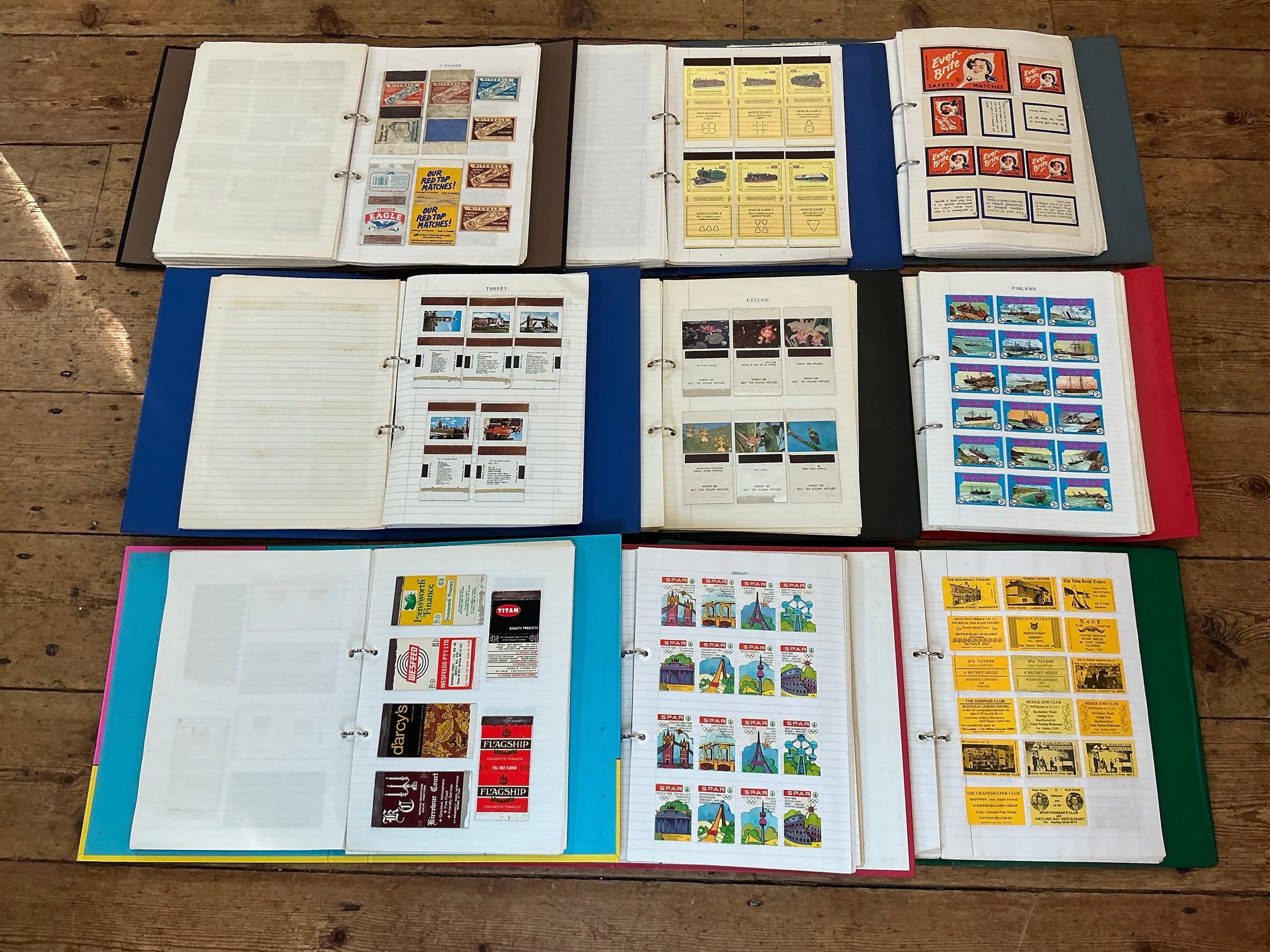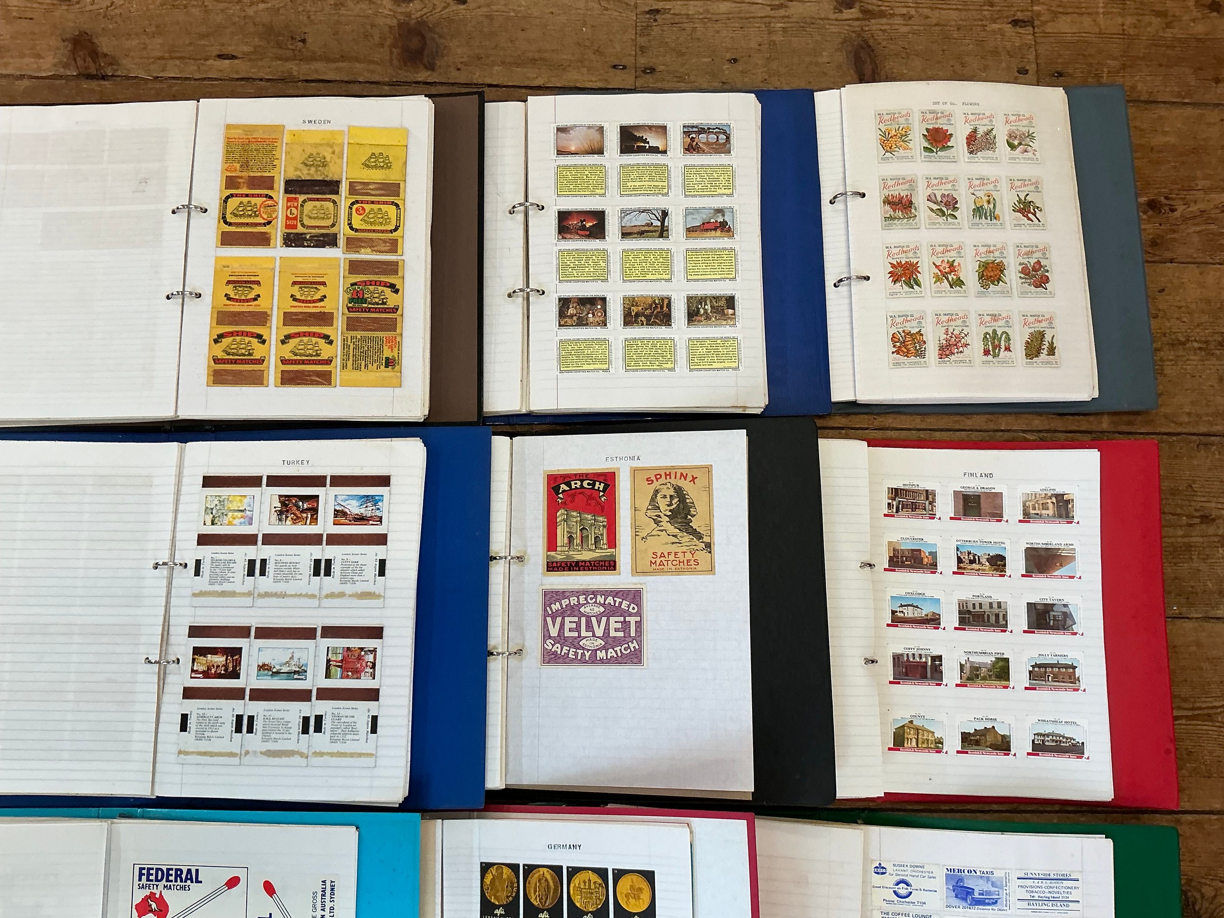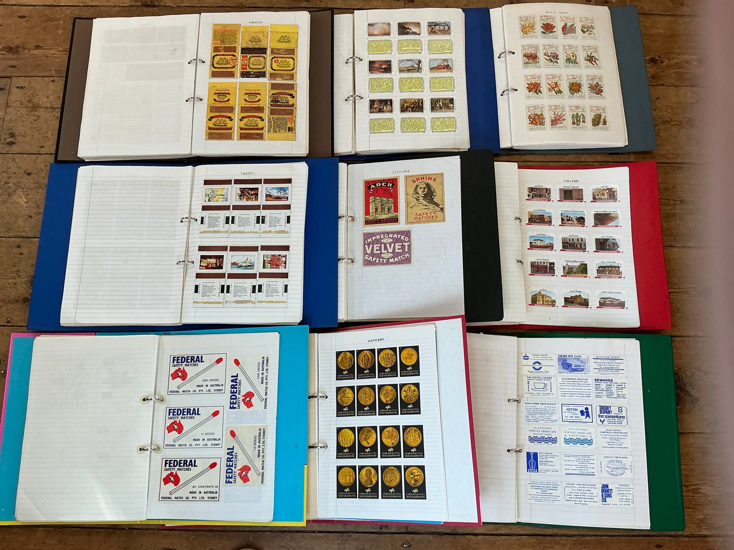 A Large Collection of Nine Albums of Vintage Matchbox Labels & Matchboxes from over the World to include Sweden, Finland, Turkey, Ceylon, Estonia, etc. Needs Viewing.