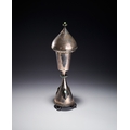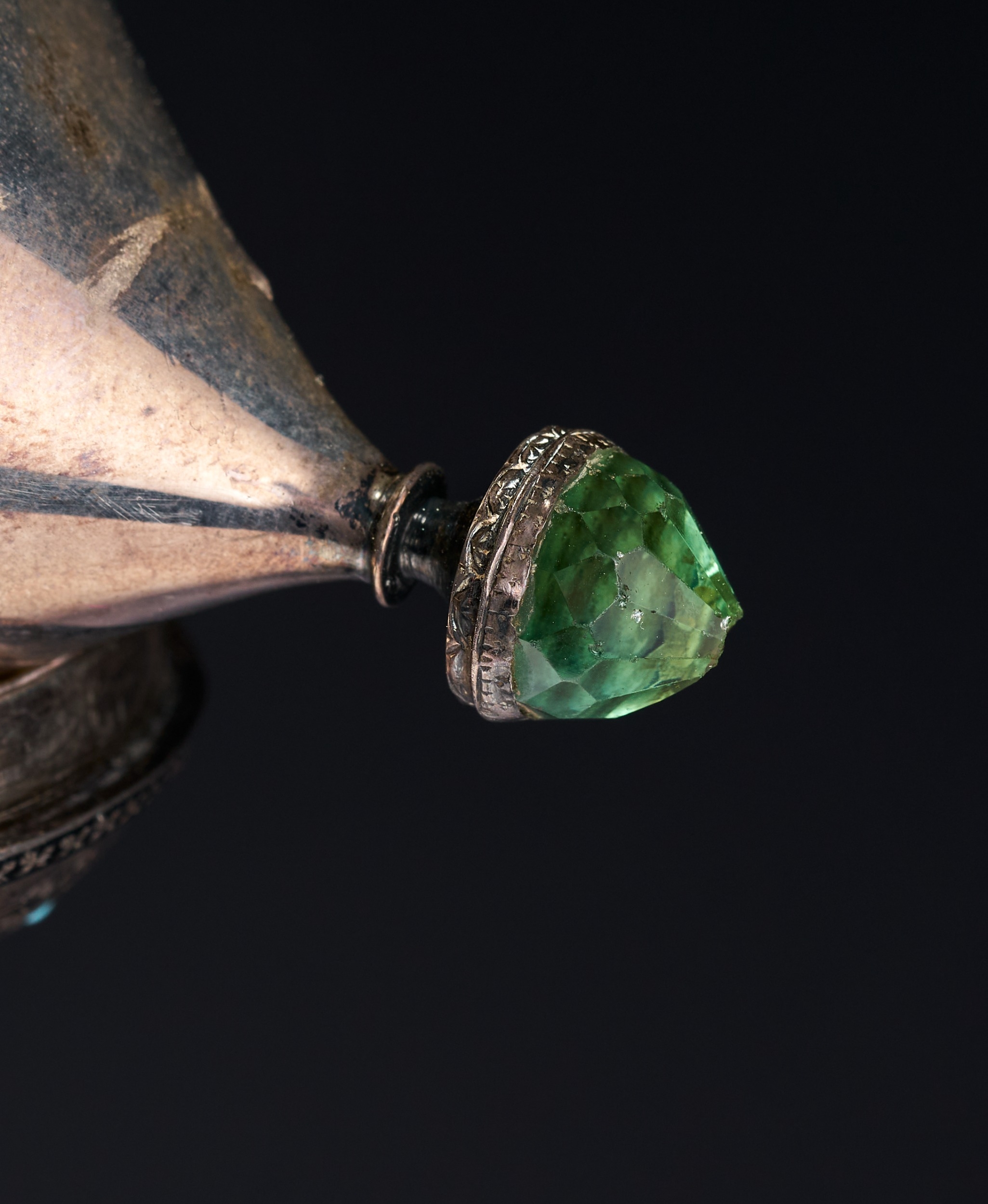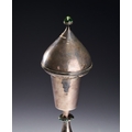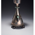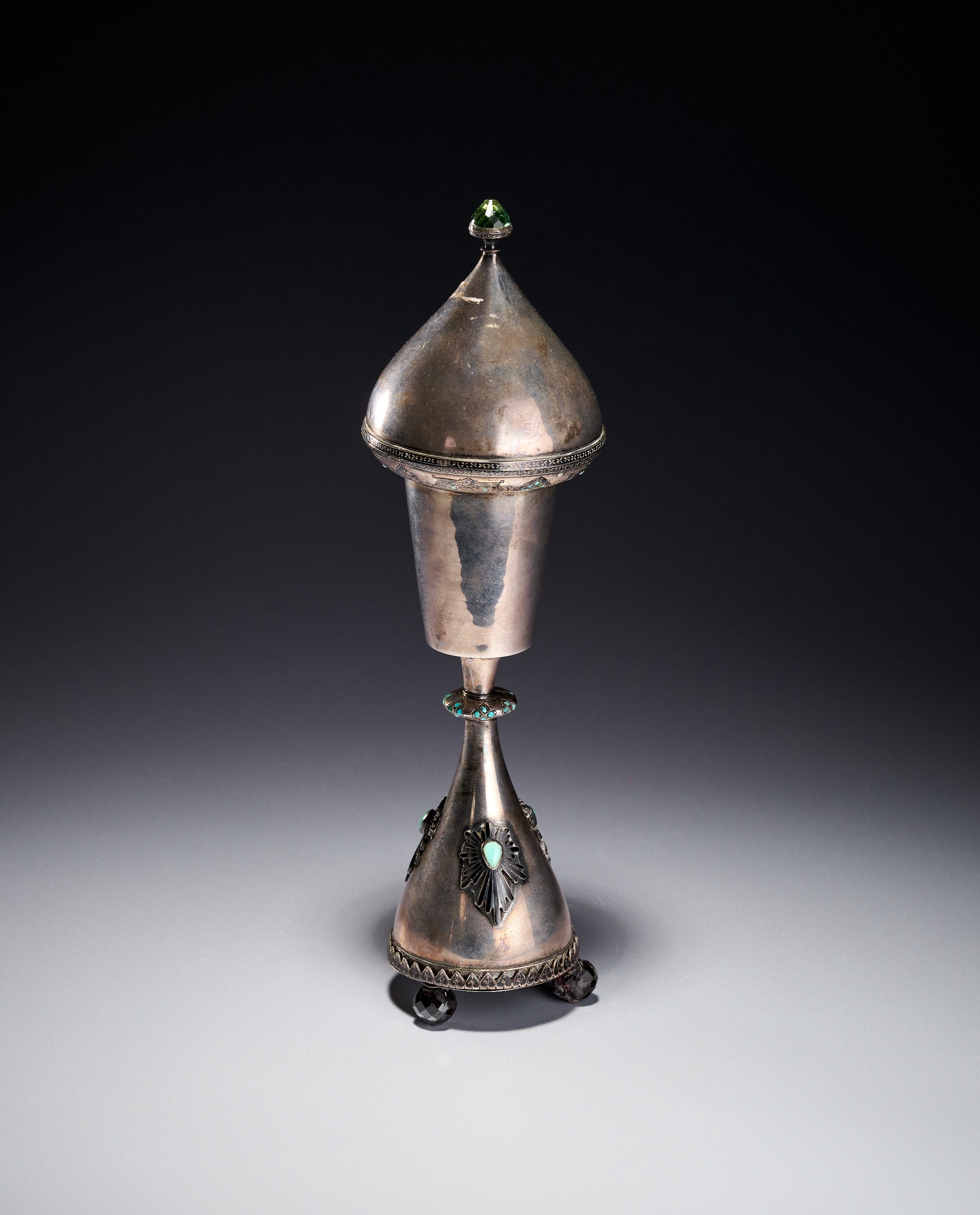 This silver covered chalice features a tapering beaker-shaped cup set upon a tall conical base. The piece includes a matching conical lid topped with a faceted green gemstone finial set in a decorative silver mount. The interior of the cup is finished with a gold-wash or vermeil coating. Decorative elements include four applied sunburst-motif plaques on the base, each centered with a teardrop-shaped turquoise cabochon. A circular ring of small turquoise cabochons encircles the central knop of the stem. The chalice rests on three faceted dark-colored stone feet. Stamped decorative borders featuring repeating leaf or heart motifs are present around the rim of the lid and the bottom of the base.