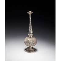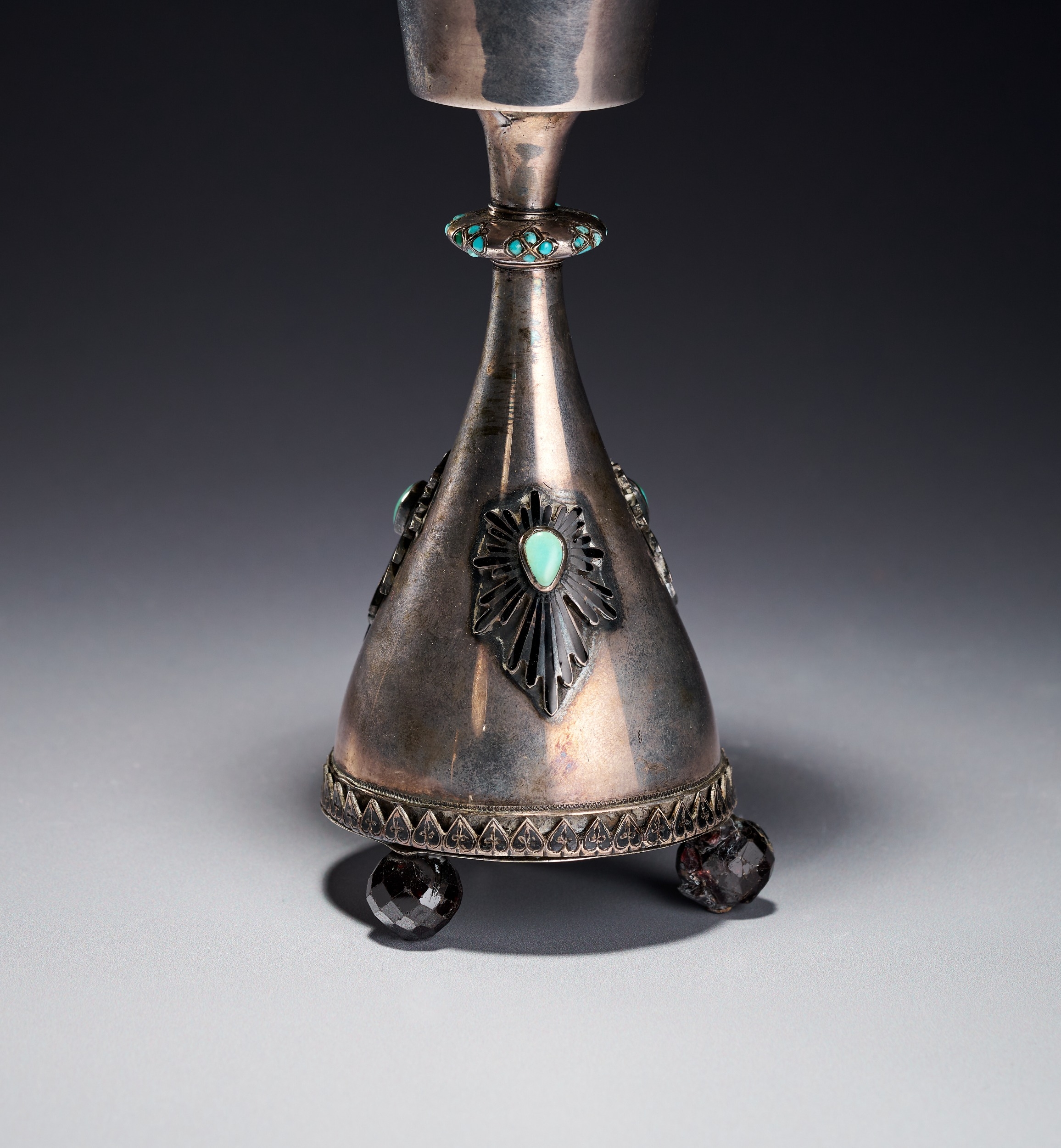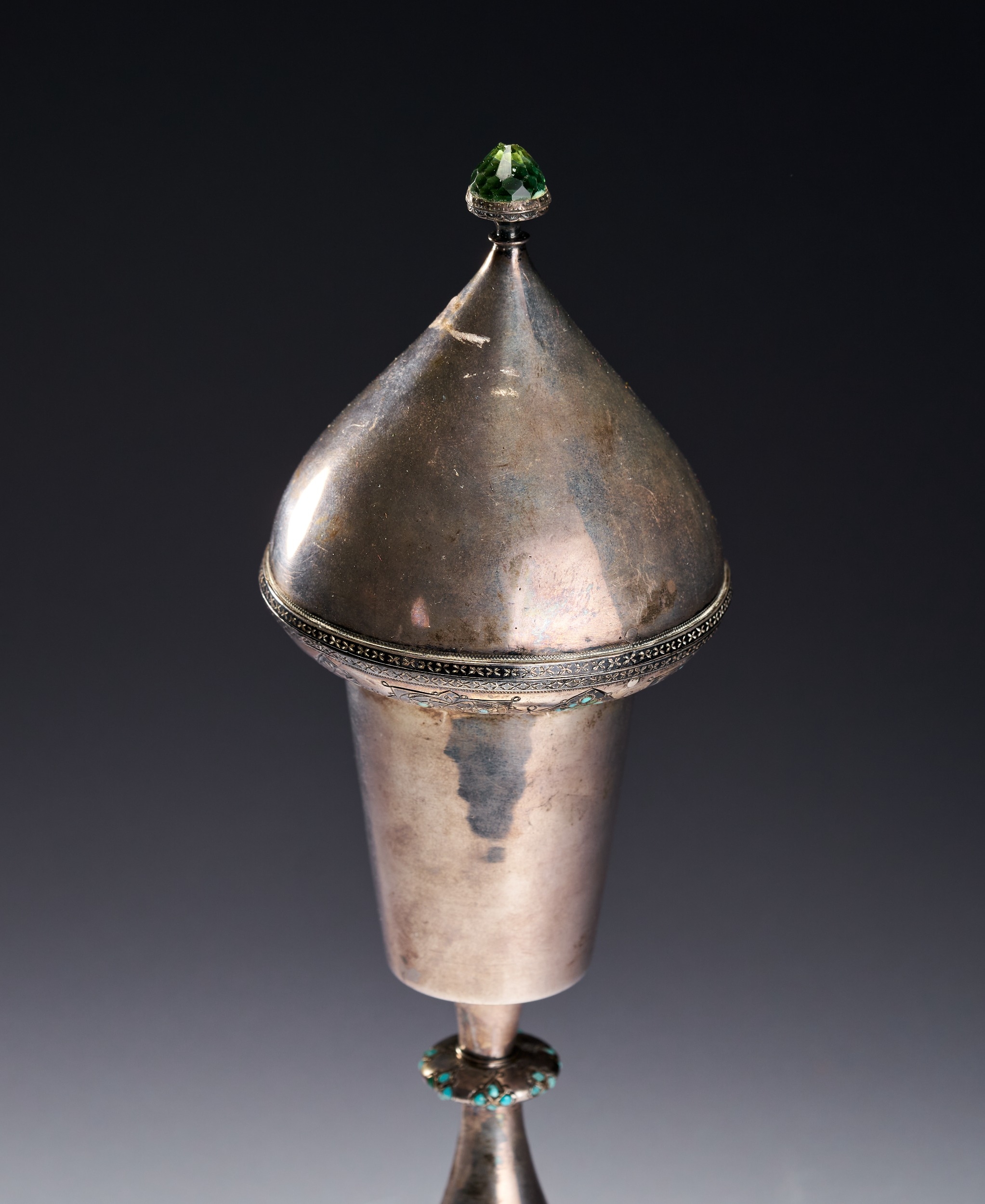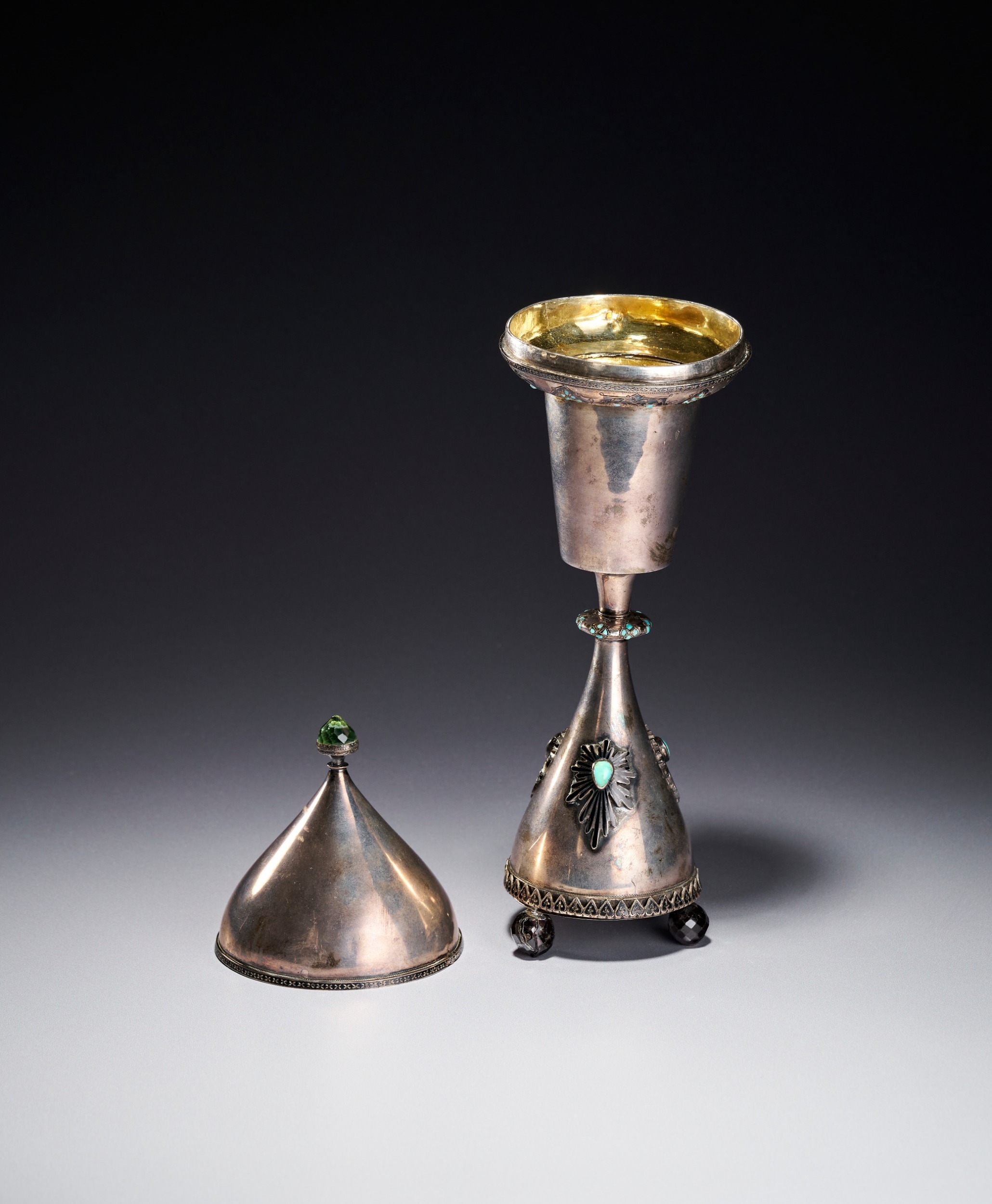 A PERSIAN TURQUOISE INSET AND ENAMELLED SILVER LIDDED CHALICE, PROBABLY FOR THE CHRISTIAN IN ISFAHAN, 19TH CENTURY